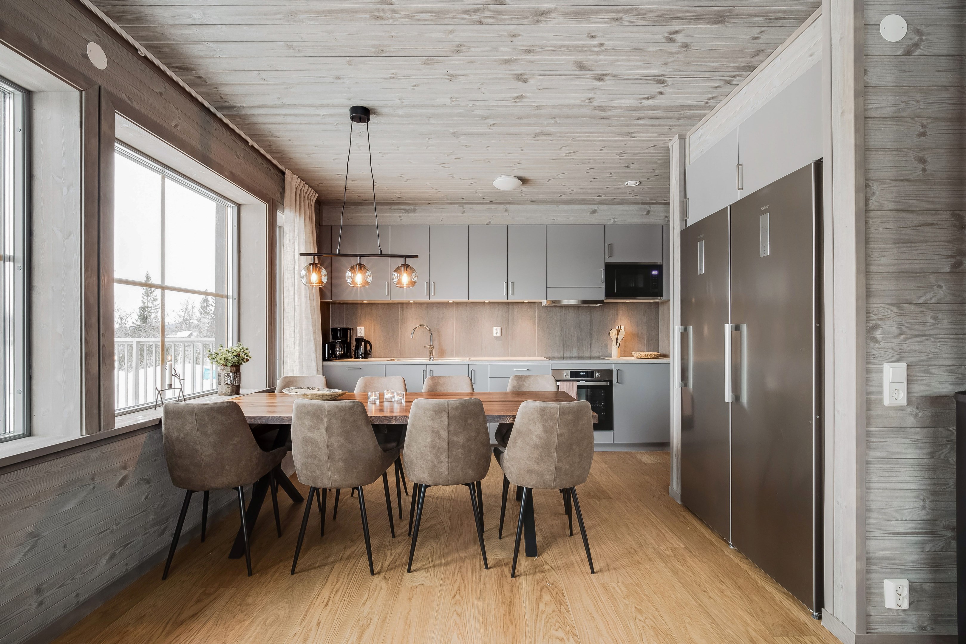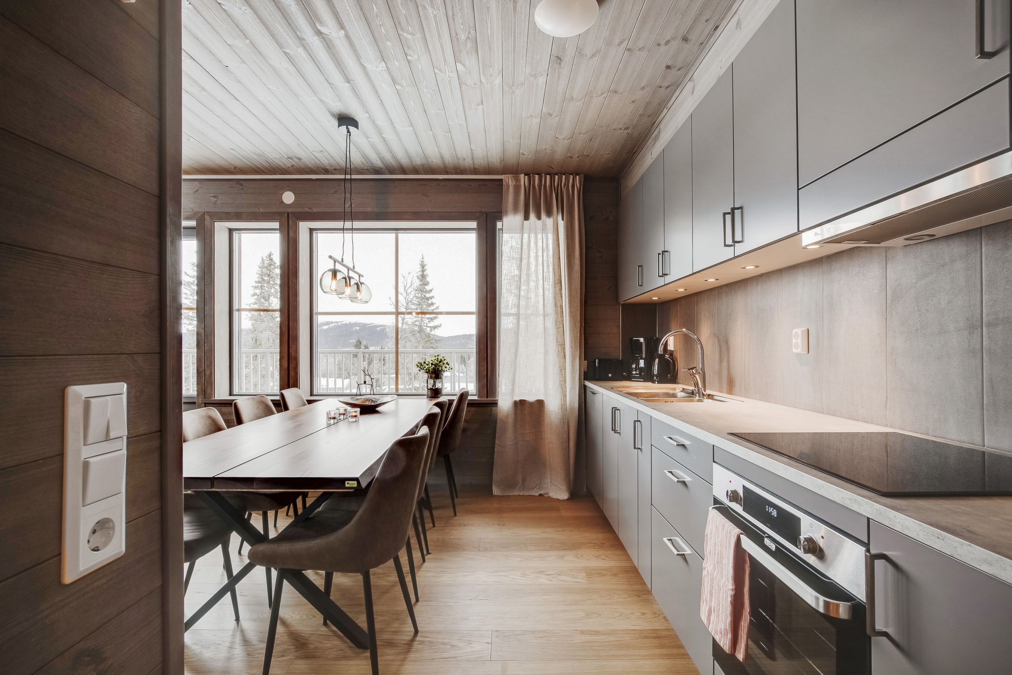 BILDERNA i denna beskrivning är från lägenheten på Funäsdalshöjden 6D, i hus 6. Här bor man fint med allrum/kök i öppen planlösning, stora fönsterpartier och utgång till antingen balkong eller uteplats. Köket har släta grå luckor i samma kulör som innerdörrar, garderobsdörrar och fönsterfoder. I den grå skalan går även slätsponten på väggar och ibland i tak, om inget annat anges. Mitt i allt ihop piggar fönsterspröjsen och ytterdörren i guldockra upp. Och i taken sitter här och där infällda spotlights som som ger både ljus och mysig stämning. Tack vare vattenburen golvvärme slipper man radiatorer och de fina ekgolven i alla rum kommer verkligen till sin rätt. KÖK/ALLRUM: Fullt utrustat kök där alla vitvaror är från 2023; hel kyl, hel frys, diskmaskin, induktionshäll, ugn, fläkt och mikrovågsugn. Bra förvaring i skåp bakom släta grå luckor som passar fint i hop med den grå bänkskivan och granitkeramikplattorna på väggen ovanför. Soffhörnan är given och väljer man en lägenhet på plan 2 så finns en värmande kamin mitt i. Utgång till balkong eller uteplats. SOVRUM 1: Här bor 2-3 personer bra beroende på val av säng. Fondvägg med grå slätspont, övriga väggar och tak i vitt. 1 garderob. SOVRUM 2: Givet rum för dubbelsängen. Garderobsvägg med skjutdörrar samt 1 låsbart ägarskåp. Fondvägg med grå slätspont, övriga väggar och tak i vitt. SOVRUM 3: Lägenhetens minsta sovrum med plats för 2. Fondvägg med grå slätspont, övriga väggar och tak i vitt. BADRUM/BASTU: Rymligt rum med dusch bakom frostade glasväggar, handfat med förvaring inunder, WC och en bastu förstås. Här finns även plats för linneskåp, vilstol eller vad man ny vill använda den tomma ytan till. Helkaklade väggar i vitt samt granitkeramikgolv. BADRUM/ TVÄTT: Här finns en kombinerad tvättmaskin/torktumlare. I övrigt samma innehåll och utförande som i det större badrummet. ENTRÉ: Praktisk hall med golv av granitkeramik, torkskskåp, 1 garderob och hatthylla mm.