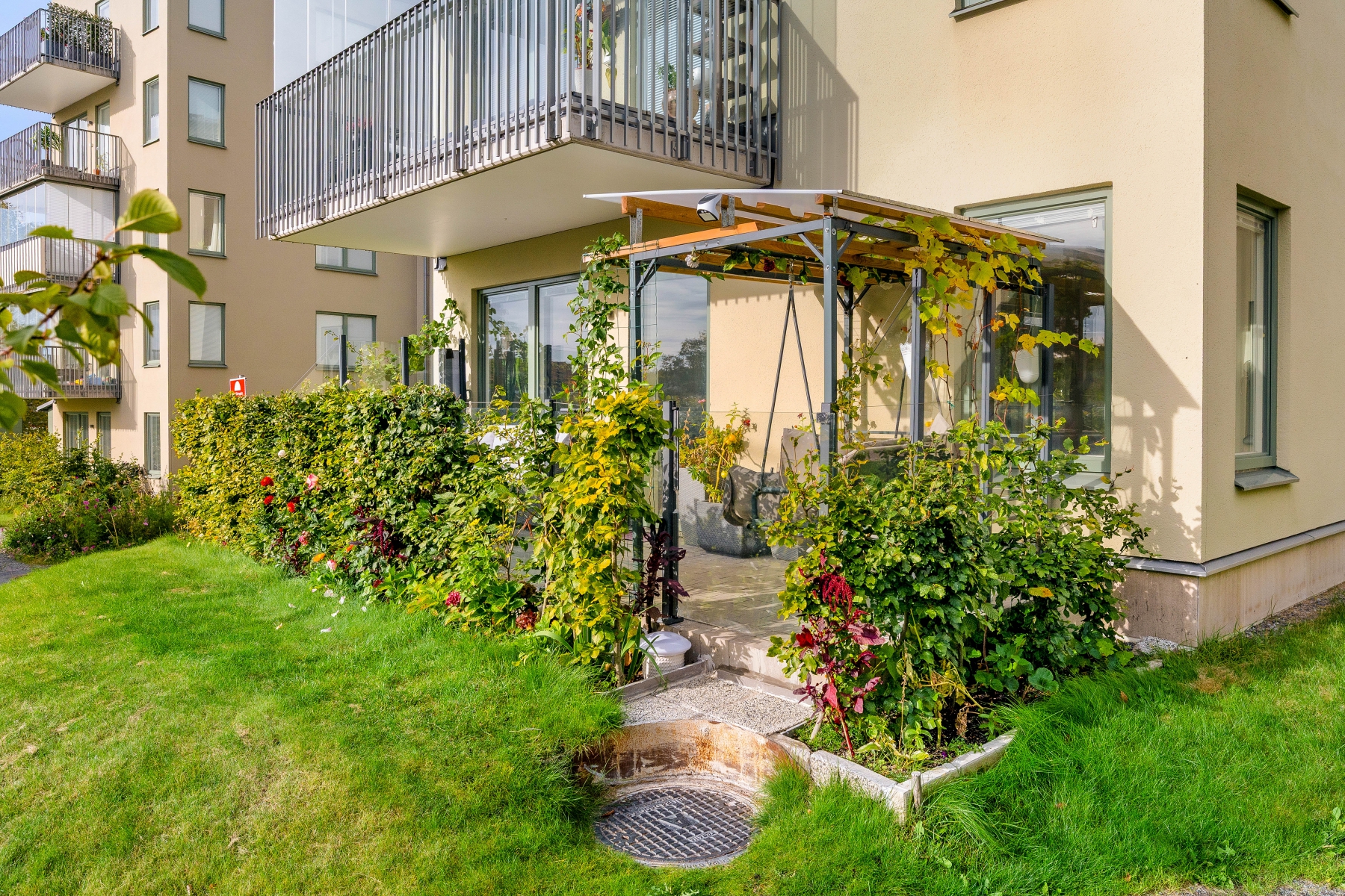 - Cykelhus - Miljöhus - Växthus - Förråd till samtliga lägenheter - Fastighetsförråd - Kombinerade barnvagns- och rullstolsförråd - Gemensam uteplats - Lekplats - Grillplats.