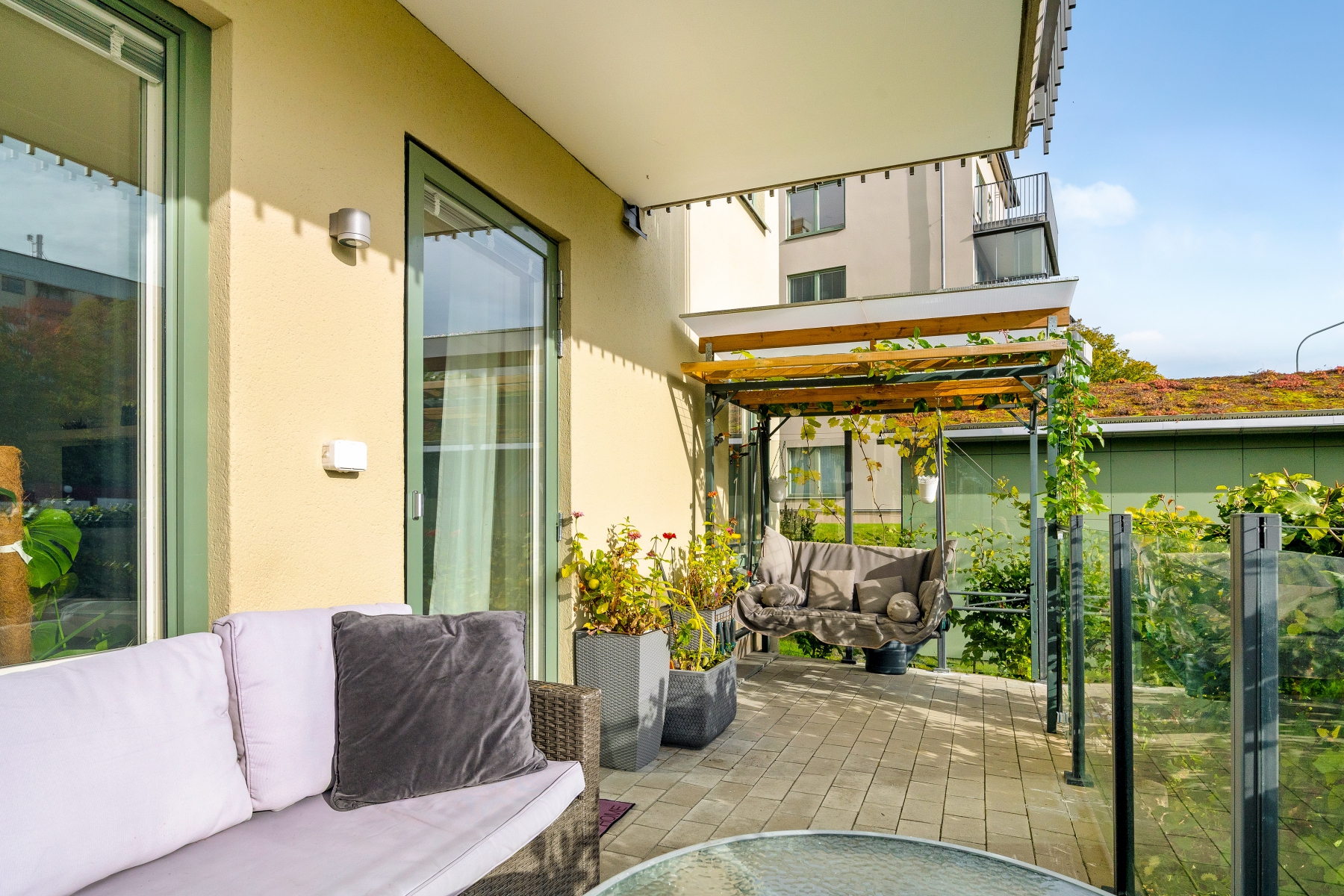 Trevlig, stensatt uteplats som delvis ligger under tak och ramas in av ett stilrent glasstaket. Här finns gott om plats för olika loungemöbler, och den insynsskyddade placeringen med häckar skapar en privat och avkopplande atmosfär.