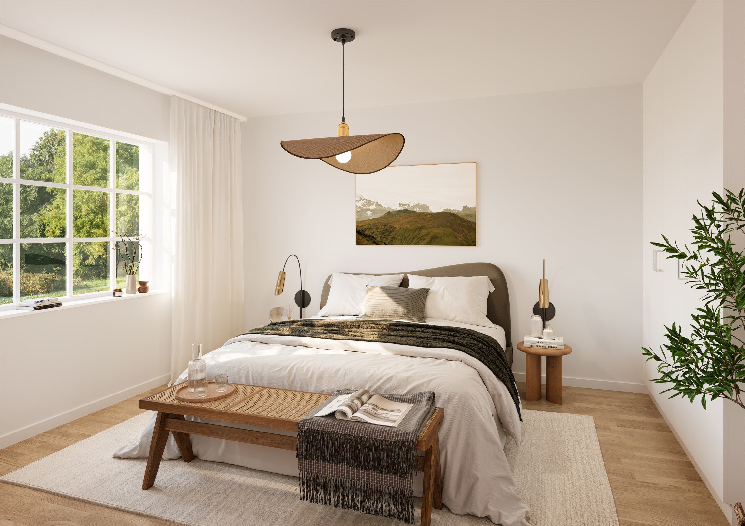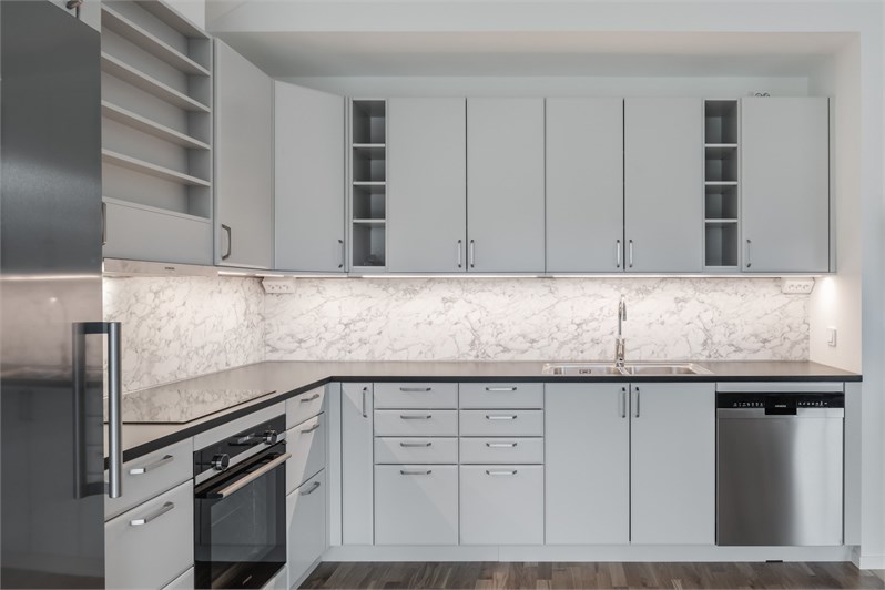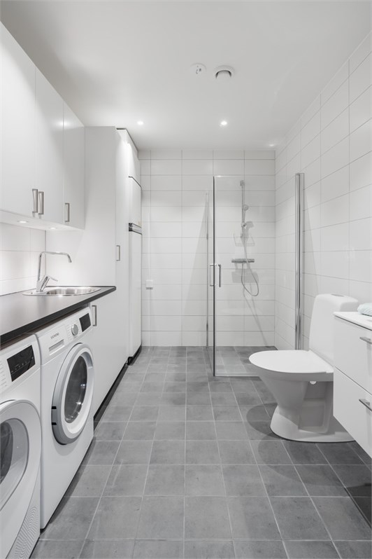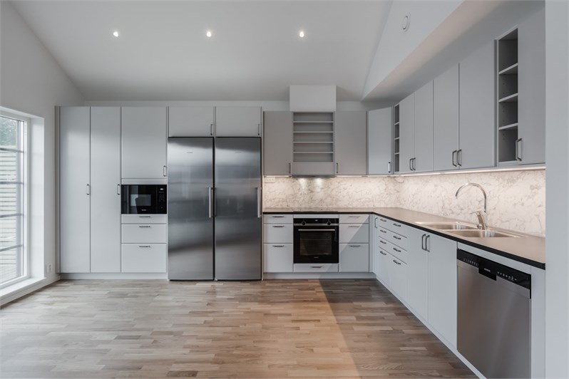 Entré in i rymlig hall med plats för avhängning. Vidare nås vardagsrum och kök i ena riktningen, och passage mot sovrumsavdelningen i andra. Vardagsrummet har separat terrassdörr ut mot skyddad uteplats med trätrall, och går i öppen planlösning mot kök i vinkel och med ryggåstak öppet ända upp i nock. Köksinredning från Ballingslöv och kapitalvaror i rostfritt från Siemens; induktionshäll, inbyggd ugn, kyl och frys, diskmaskin, microugn samt fläktkåpa. Vardagsrummet kan även utrustas med braskamin Contura som tillval. De tre sovrummen ligger i andra änden av huset, varav ett är större med separat terrassdörr och med egen klädkammare. Det tredje, sov/arbetsrummet går att ersätta med TV/allrum genom att slopa en innervägg mot anslutande entré och istället skapa en stor öppen yta för ytterligare sällskapsutrymme. Mitt i huset i anslutning till hallen finner vi kombinerat badrum/tvättstuga med inredning från Ballingslöv och kapitalvaror från Siemens. Klinker på golvet och kakel på väggarna med utrustning som tvättbänk, tvättmaskin, torktumlare, frånluftsvärmepump NIBE, wc, tvättställ samt dusch. Plats finns även för gästwc i anslutning till entré som tillval. Genomgående 13 mm ekparkett från Kährs i alla rum. Solpaneler. Carport med vidbyggt fullisolerat förråd.