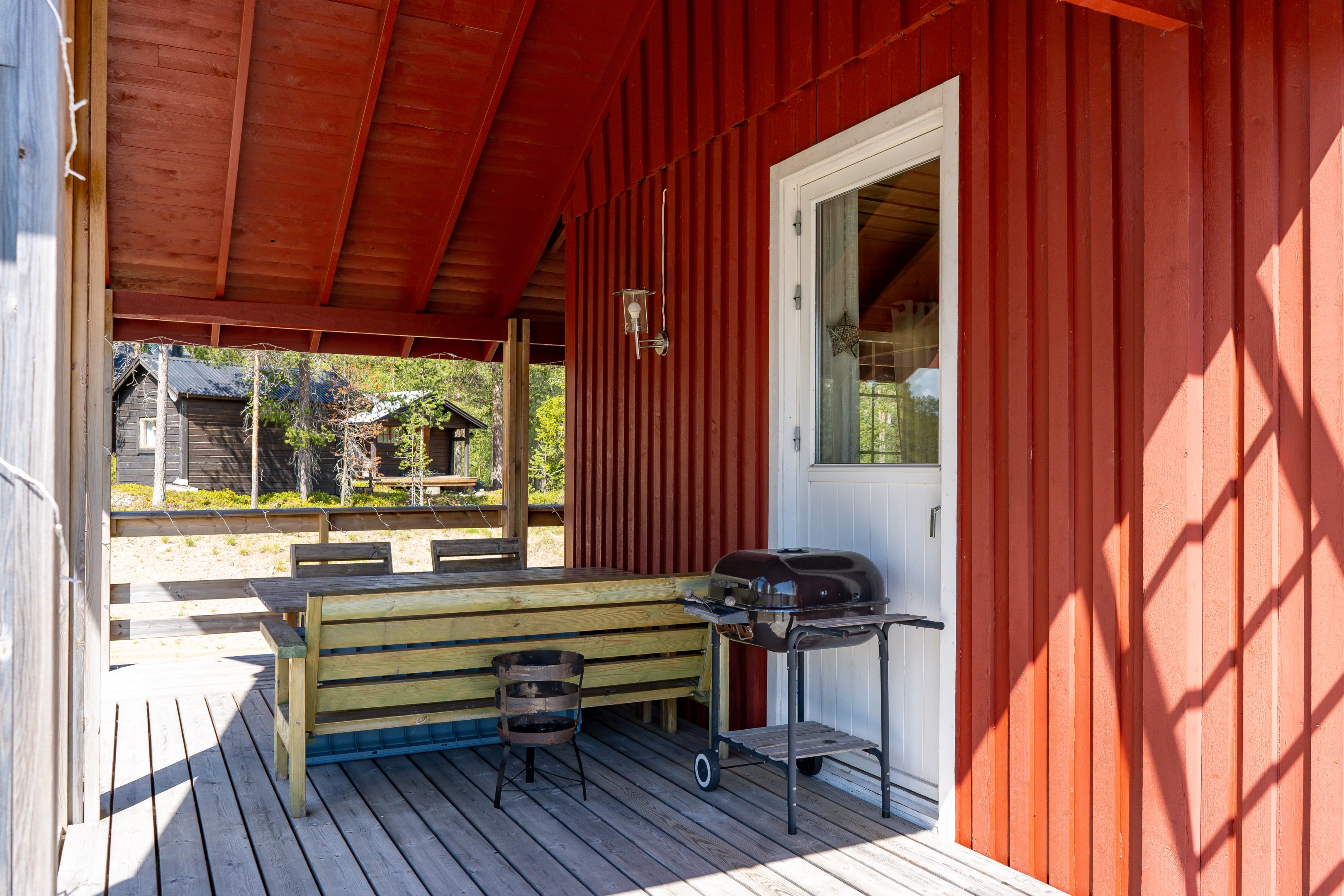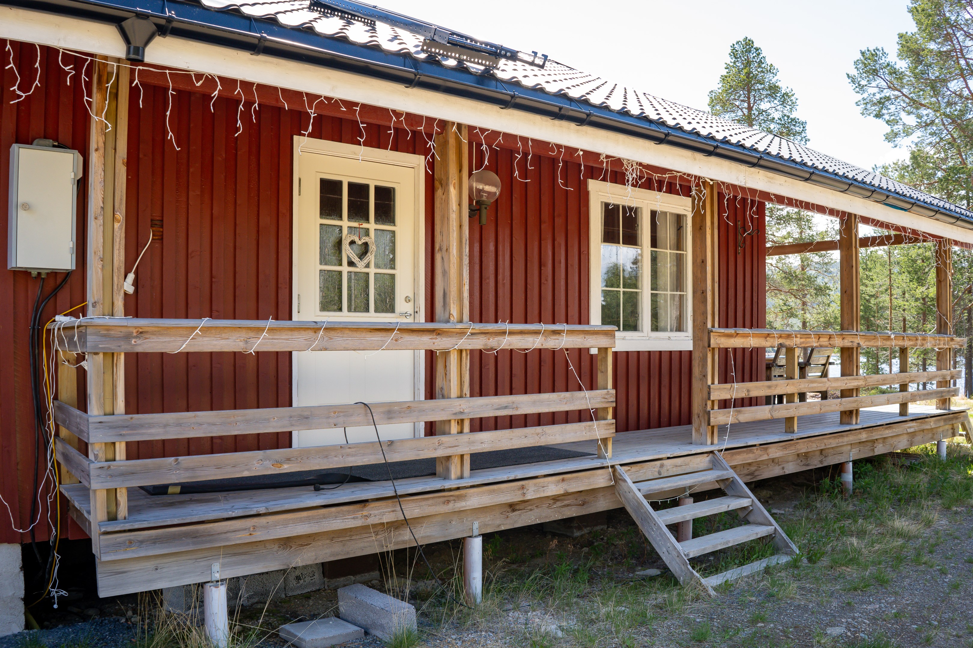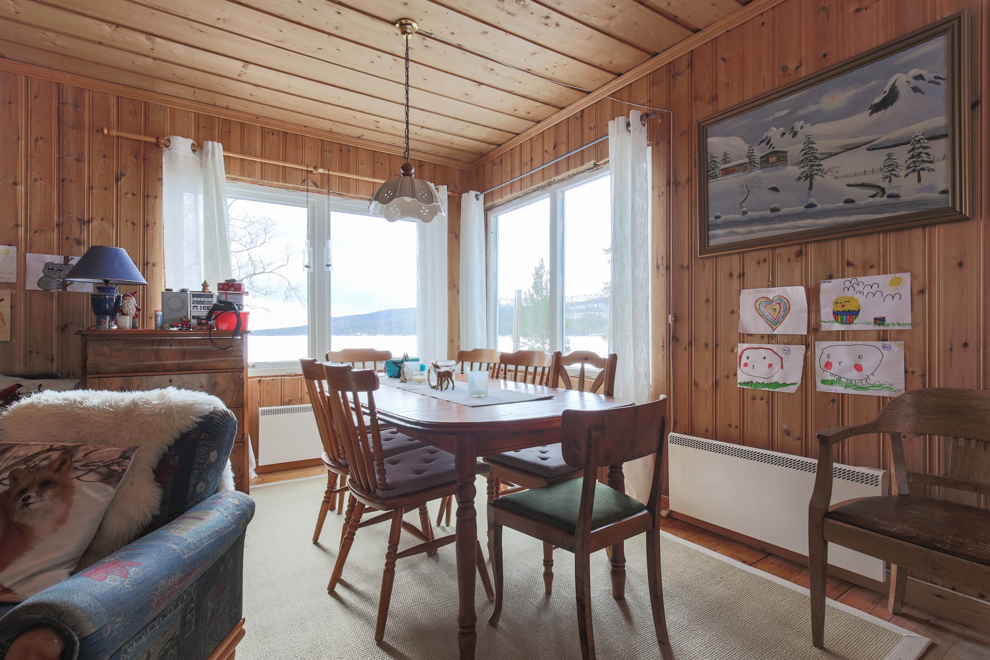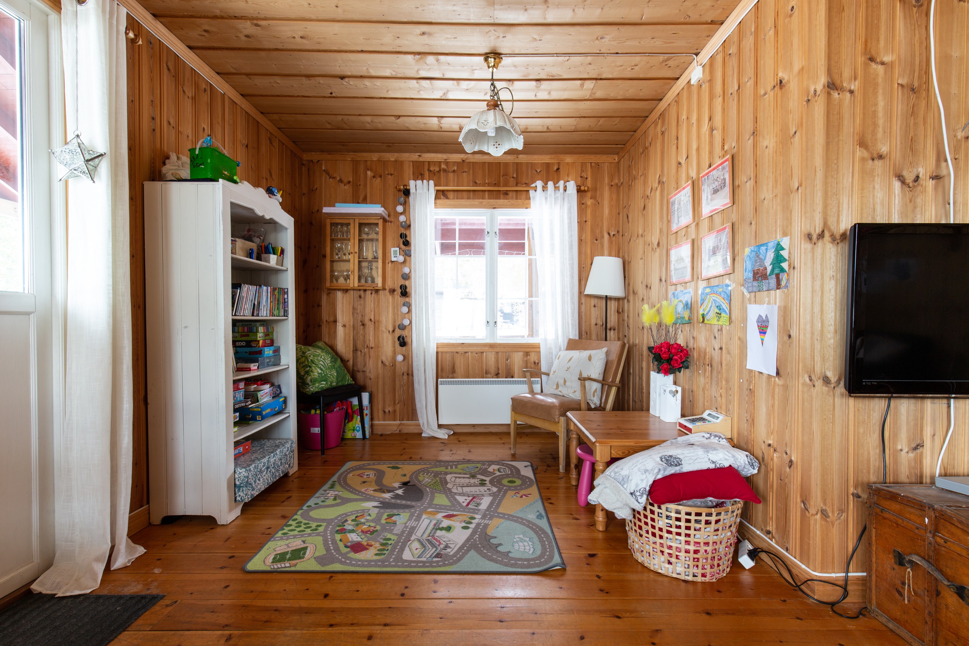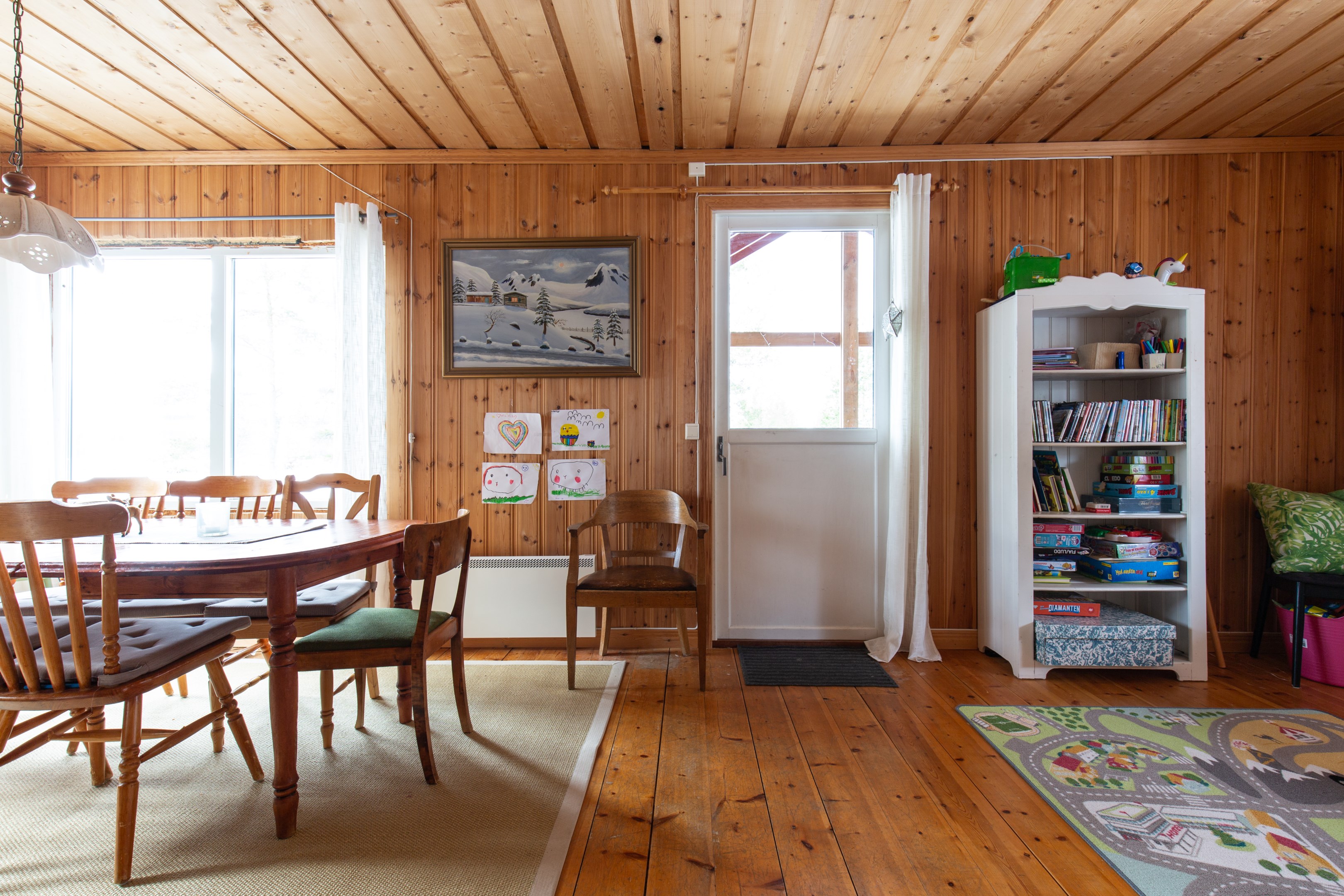 Det här är ett hus som upplevs rymligt i alla rum. De 90 kvm är mycket väldisponerade med en mer privat del för de tre sovrummen mot norr och storstugans stora umgängesytor i andra änden av huset. Entrén sker genom en farstukvist med rejält tak åt väster. Man kliver in i en rymlig hall med bra plats för avhängning. Rakt fram och till höger är den trevliga, och också mycket rymliga storstugan. Här får det plats både soffgrupp, matplats och läshörna. Utgång till altanen som har sol stor del av dagen. I storstugan finns även spis med insats. Till vänster från hallen kommer man in i köket med gott om plats för gemensam matlagning, bra arbetsbänkar och uppskattat skåpsutrymme. Ett mindre matbord med fyra stolar ger en trevlig frukostplats vid fönstret. Även här finns kamin. Till höger i köket är ingången till sovrum 1 - det största av sovrummen, som har en fin utsikt bort mot sjön. Här finns idag en våningssäng med extra bred undersäng plus dessutom en dubbelsäng. Med andra ord kan upp till fem personer sova här samtidigt. Genom köket är en halldel där ingångarna till två spegelvända sovrum ligger på vardera sida om badrummet. Sovrummen rymmer våningssäng med bredare underslaf samt förvaringsmöbel. Badrummet har både WC, duschkabin och tvättpelare.
