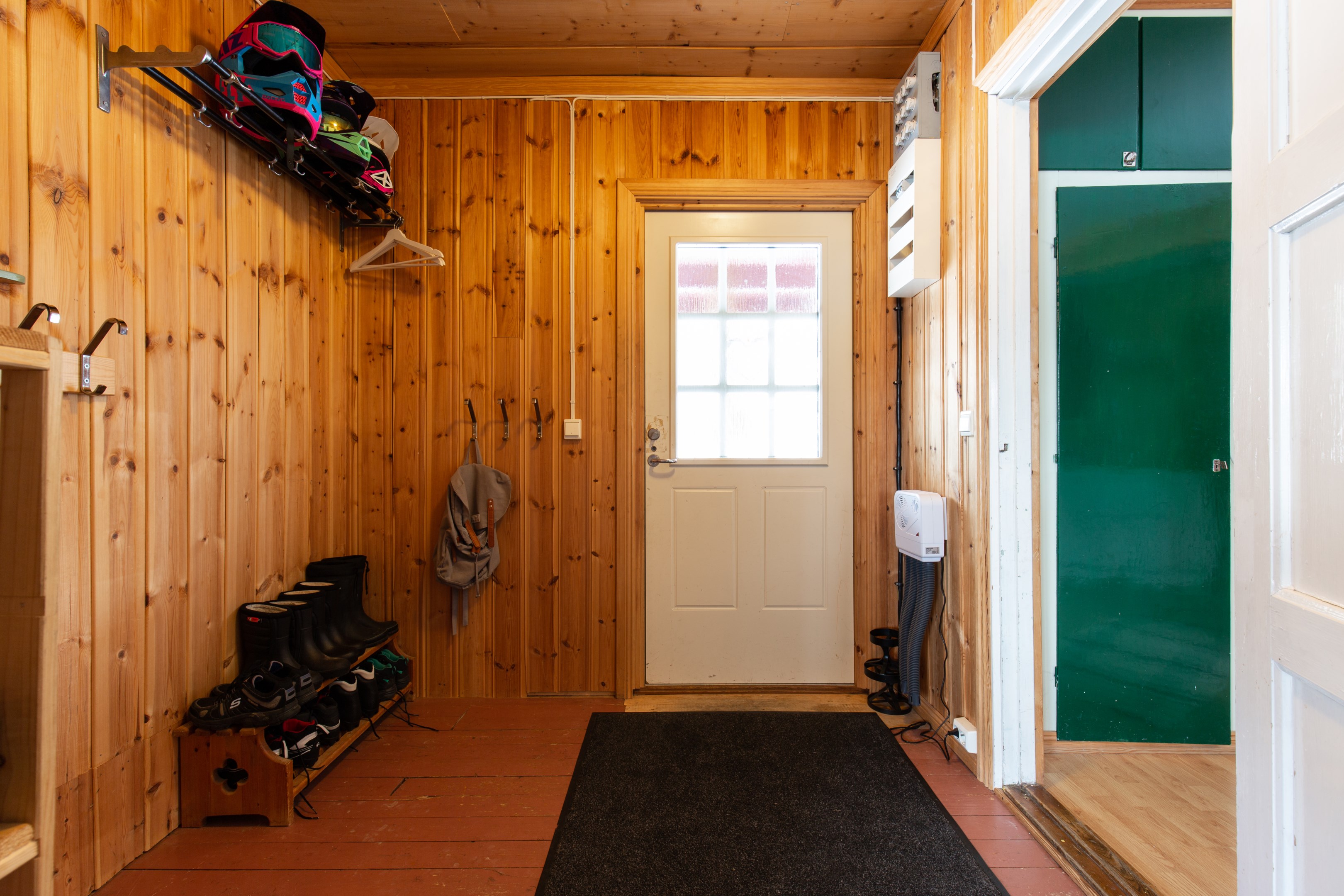 Man kliver in i huset via en skyddad farstukvist och kommer in i en rymlig hall med hatthylla och en fristående hylla på höger sida. Under finns plats för skohylla/skoställ och till vänster fins skotork. Trägolv, träpanel på väggar och i tak.