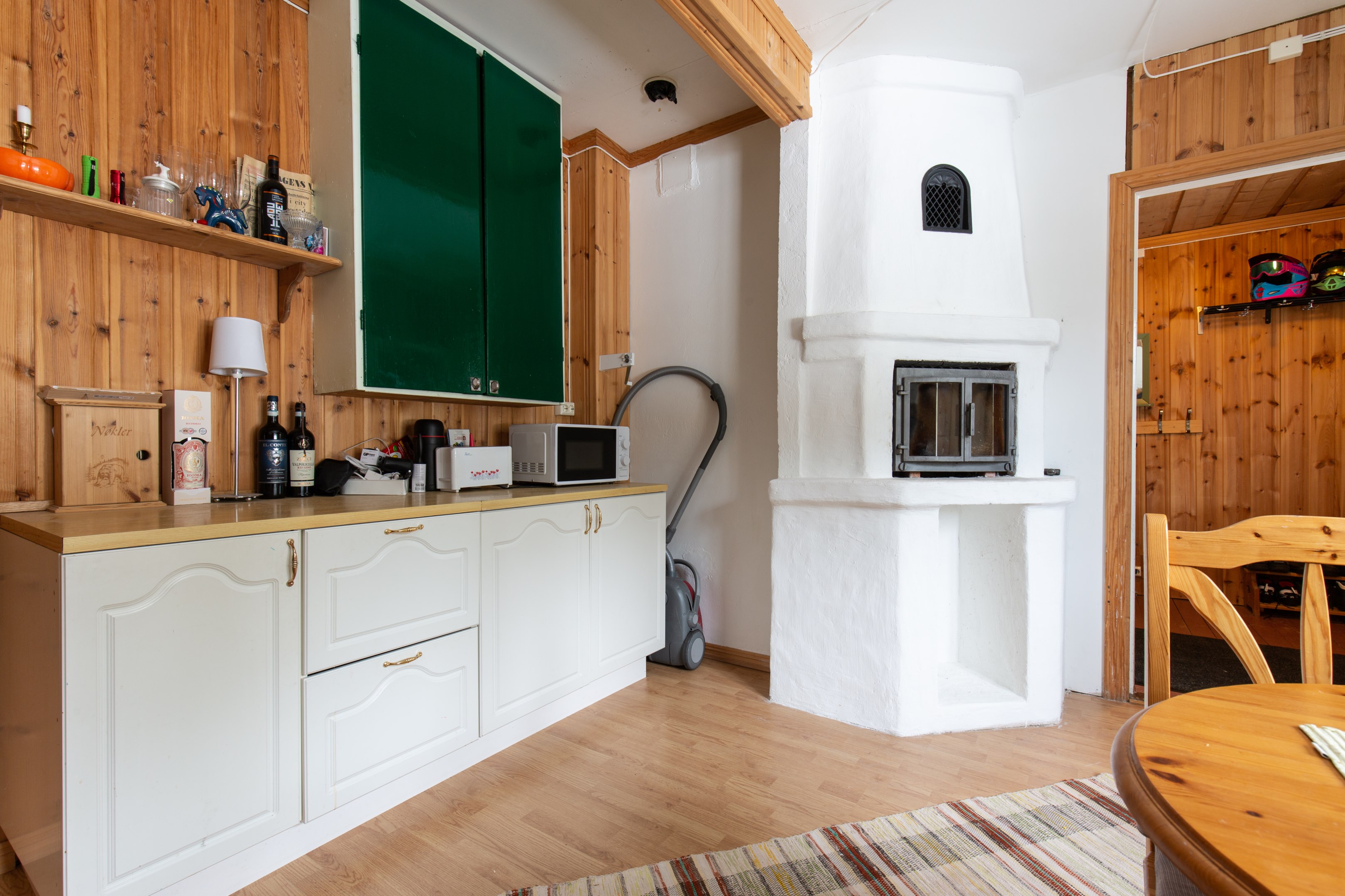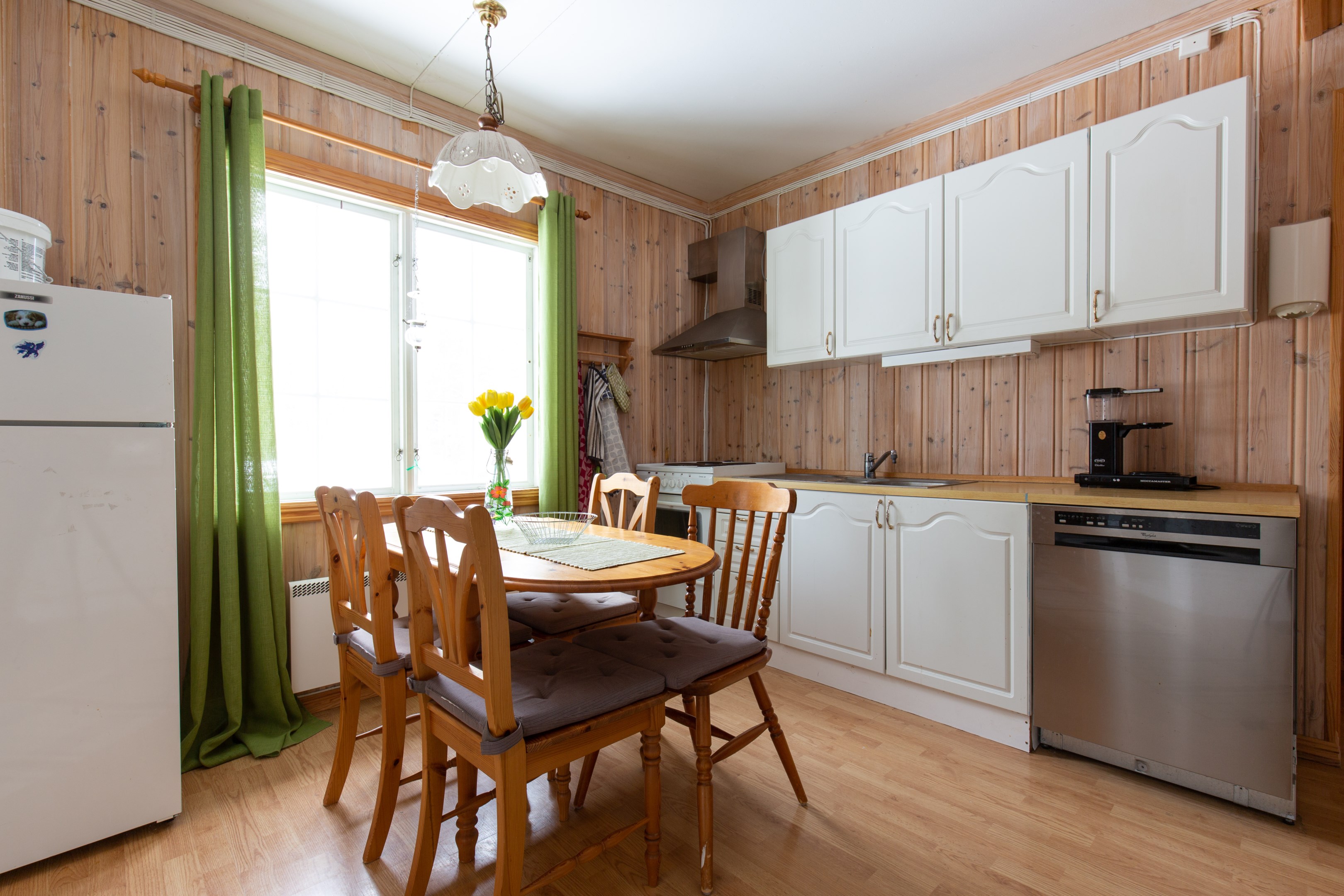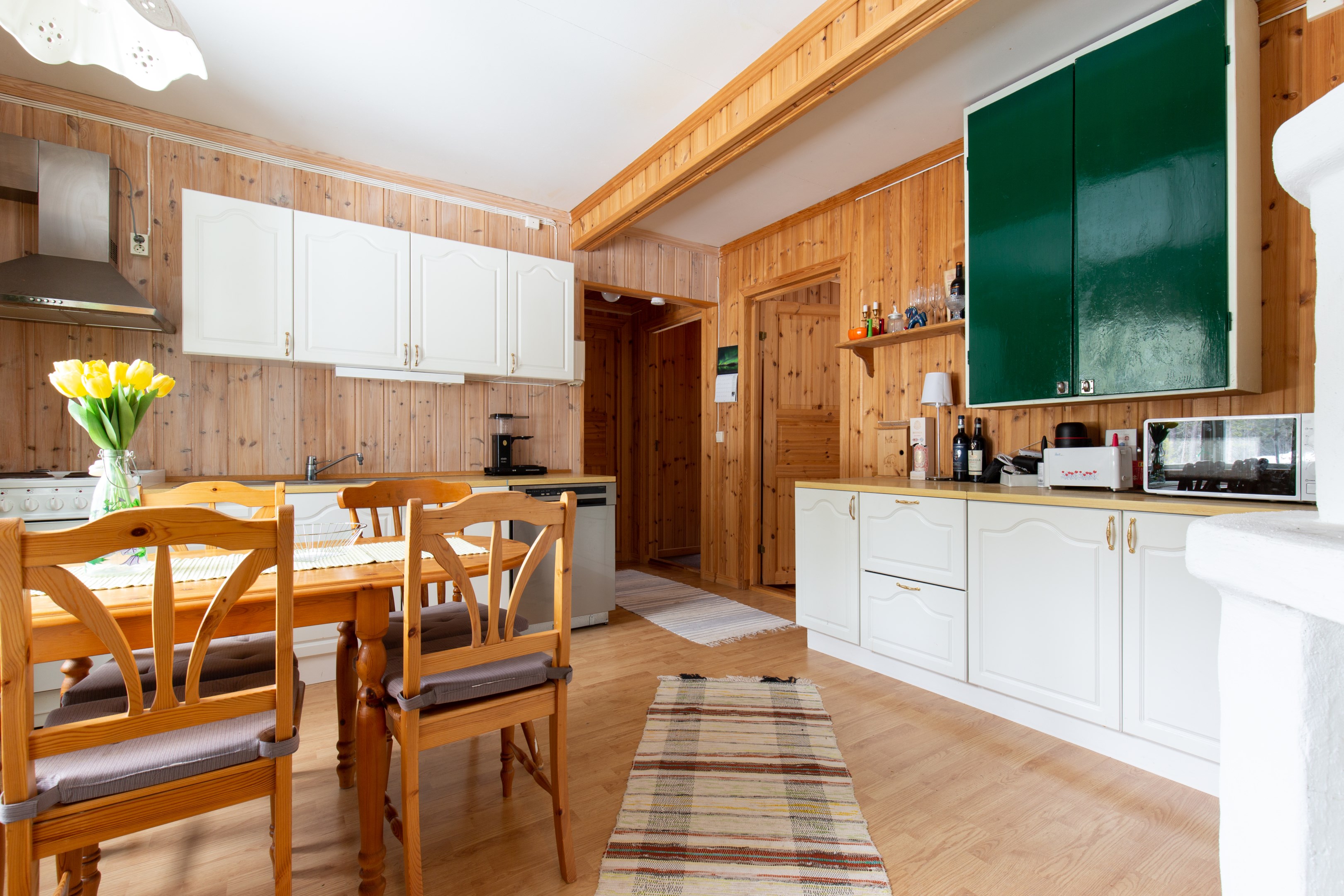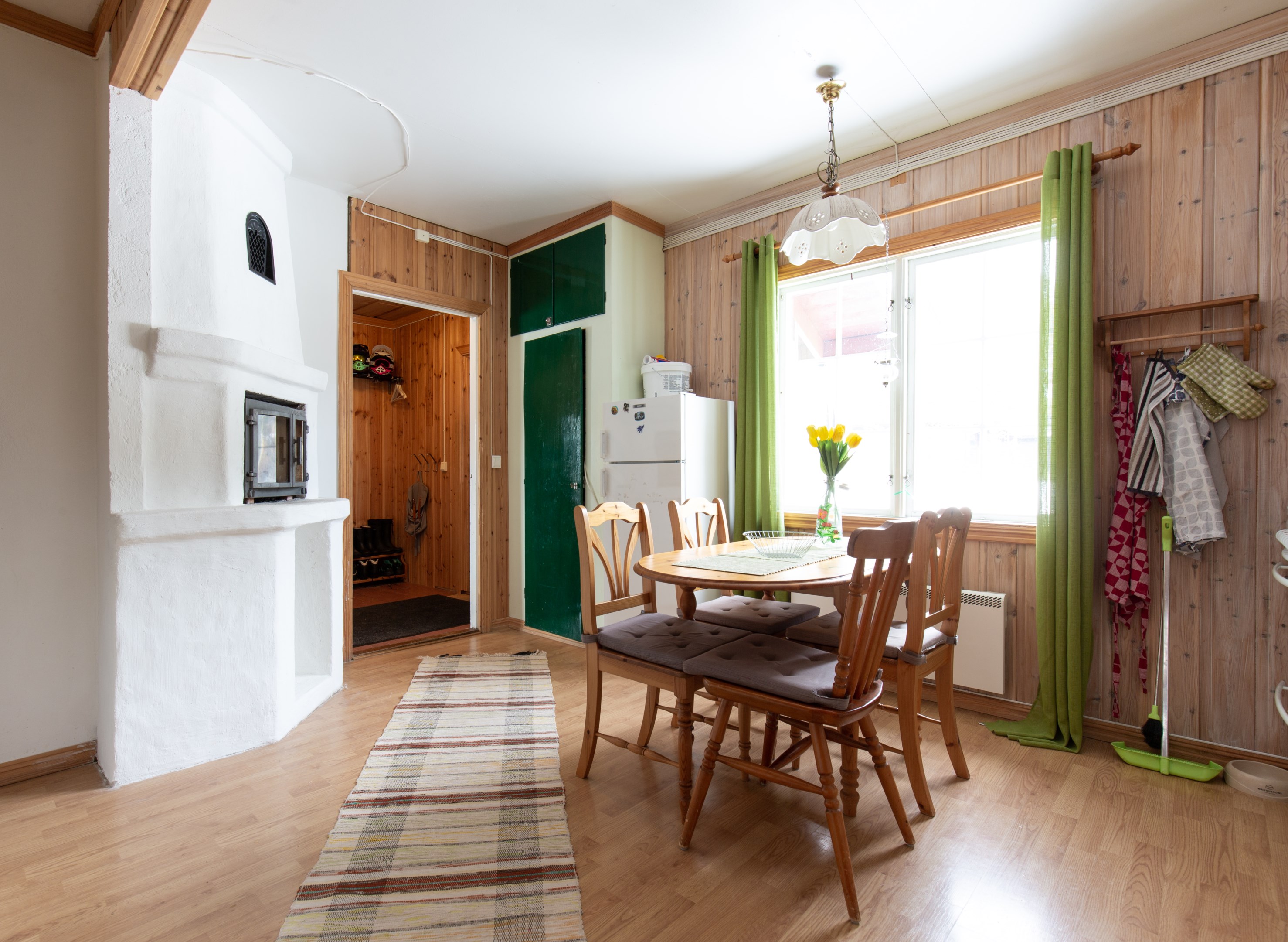 Direkt till vänster i hallen går man in till köket - ett stort och härligt rum som blir extra charmigt med en egen kamin direkt till höger. Köket har bra arbetsytor, många skåp och även plats för ett litet bord (4 pers) vid fönstret, som vetter åt väster. Vita över- och underskåp i något nyare stil, samt några gröna skåp som har varit med lite längre. Spis med kokplattor samt köksfläkt i rostfritt, fristående mikro, fristående kyl/frys samt diskmaskin. Inbyggt skafferi med överskåp. Parkettgolv, träpanel på väggar och vitmålat tak.