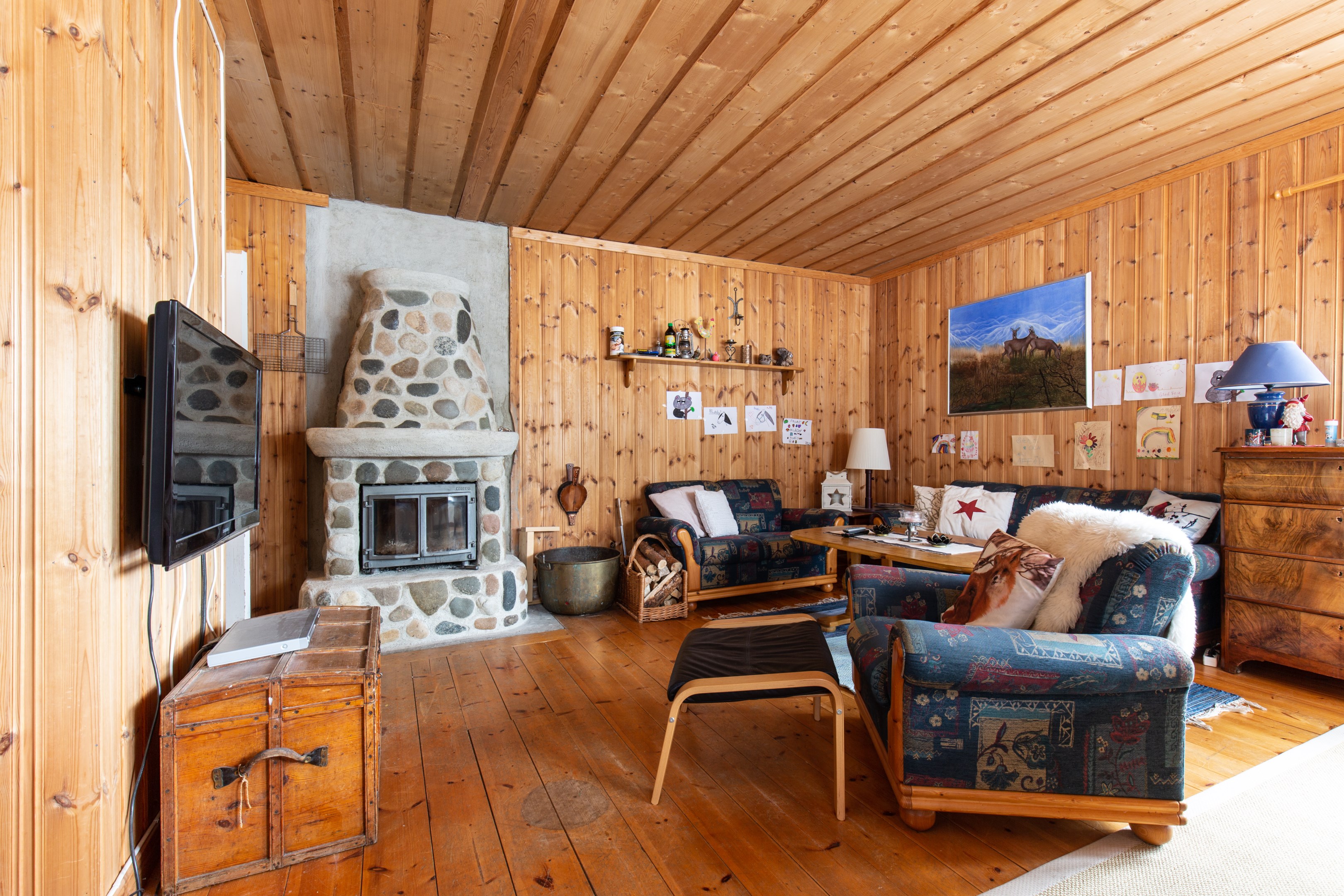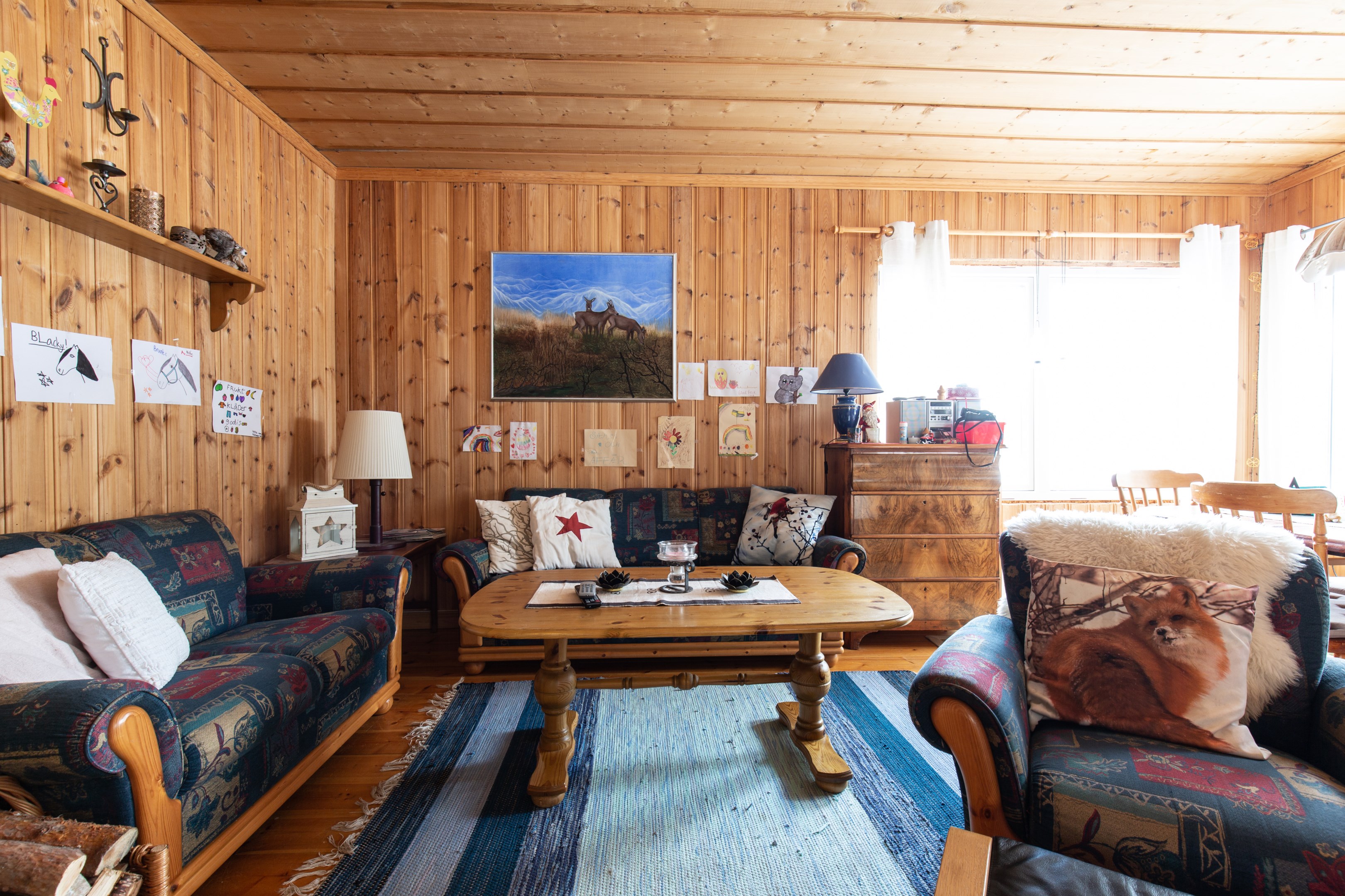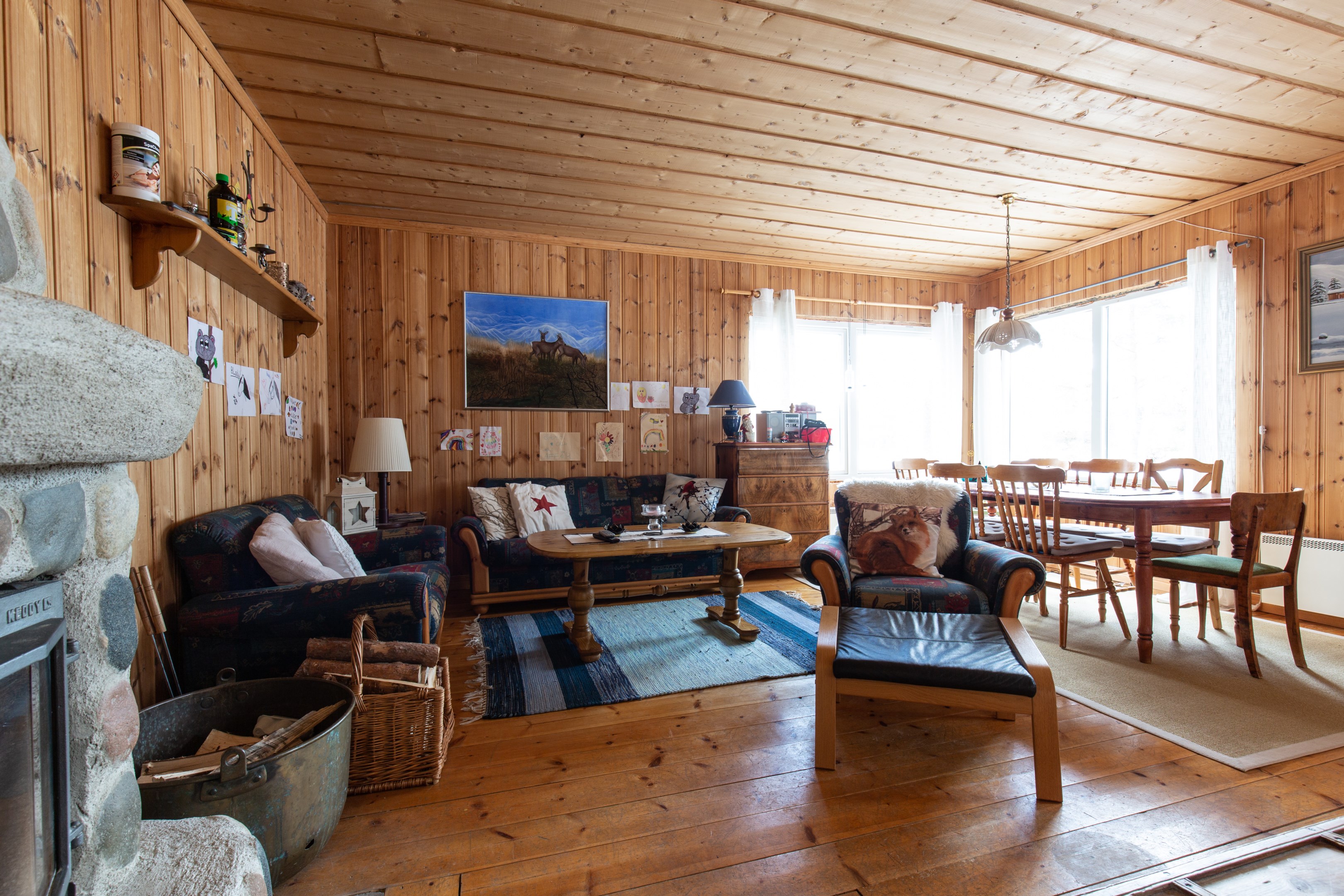 Rakt fram i hallen ligger den rymliga storstugan, med inbjudande möjligheter till umgänge. Idag är rummet möblerat med en soffgrupp rakt fram följt av matplats fint placerad vid hörnet med fönster på båda sidor. Här har man en fantastisk utsikt mot fjäll och sjö. Bredvid matplatsen är utgången till altanen och till höger finns plats för ytterligare soffa, lekrum eller kanske en läshörna. Storstugan har trägolv, träpanel på väggar och i tak.