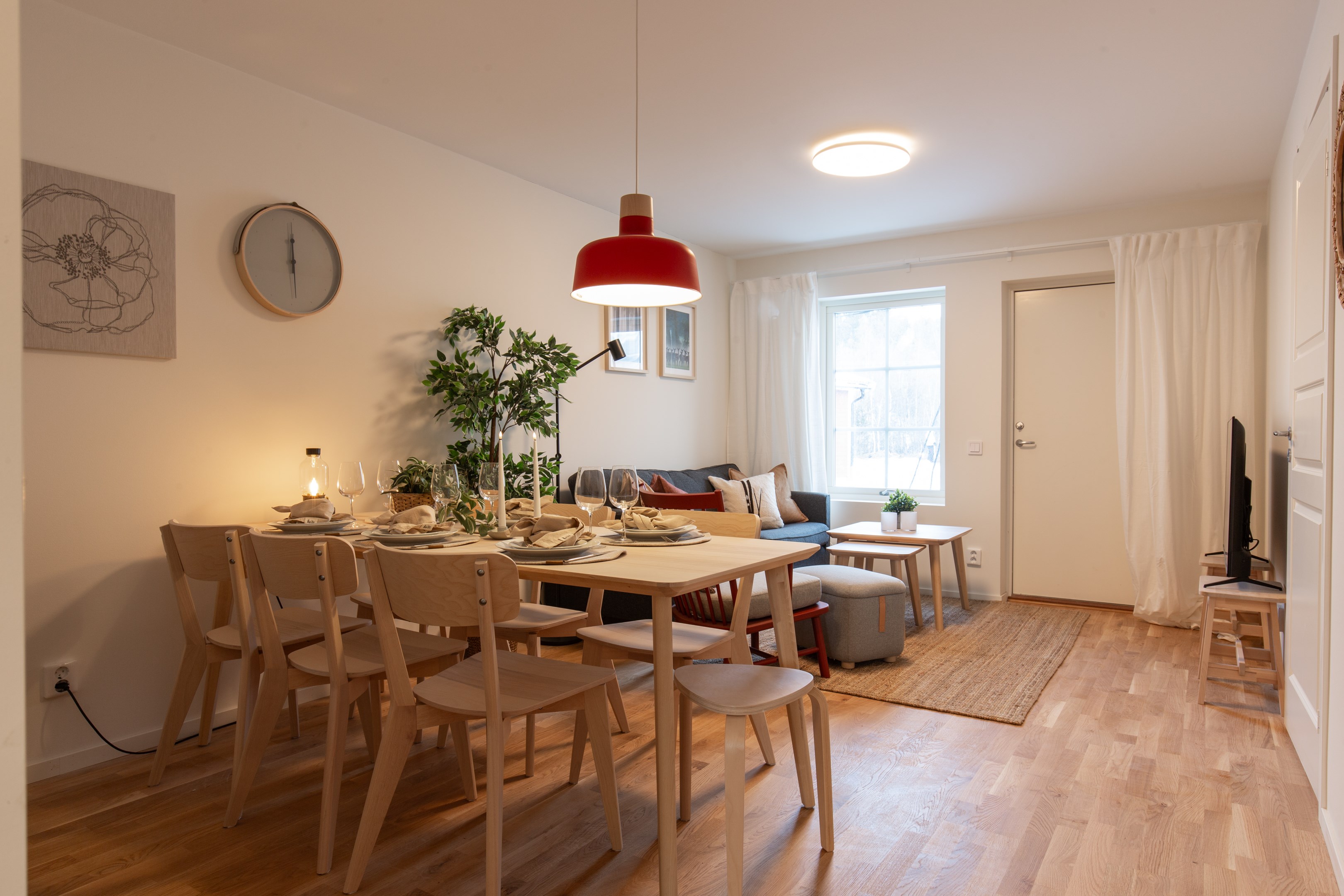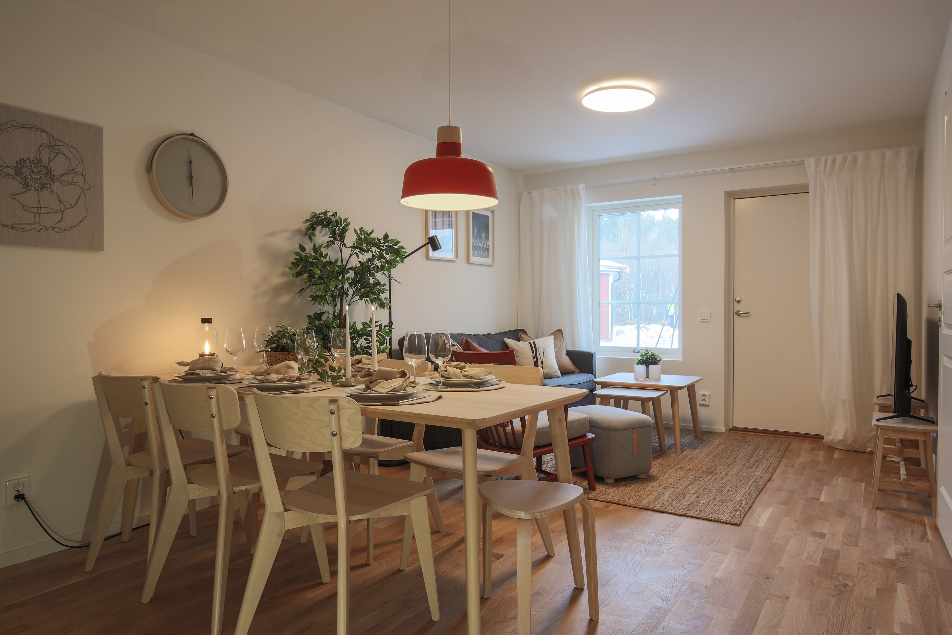 Genom köket ligger ett ljust allrum med plats för både soffa och matplats. Ett härligt rum för både umgänge och avkoppling med braskamin som ger en extra mysfaktor. Rummet har fönster och balkongdörr till uteplats. Ekparkett, vitmålade väggar och tak.