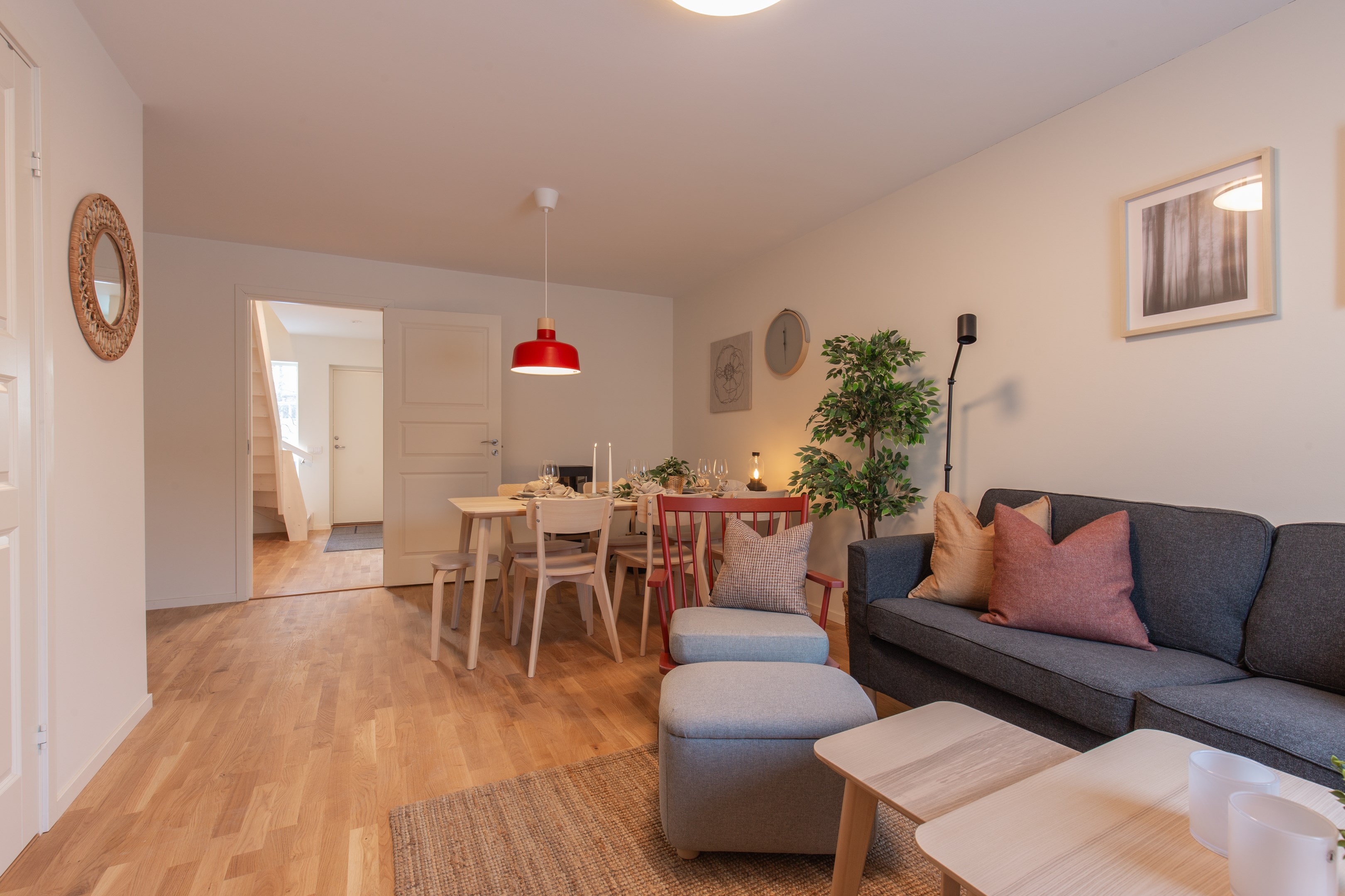Ljus och välplanerad interiör ger en vilsam bas som är lätt att sätta sin egen personliga prägel på. Bottenvåningen består av kök, allrum med matplats och braskamin samt utgång till uteplats. Här finns även ett sovrum, badrum med bastu samt en praktisk hall med torkskåp. Övervåningen har två ljusa sovrum samt ett eget badrum och en klädkammare. Boarean varierar mellan 87-89 kvm beroende på bostadens placering i huset. De två mittersta bostäderna per huskropp har något större sovrum på övervåningen tack vare takkupor.