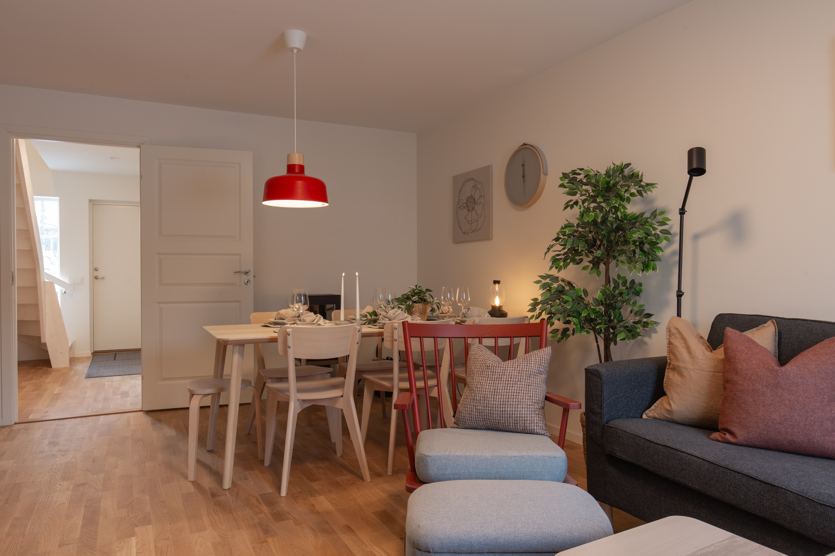 Praktisk entré med garderob och plats för avhängning under trappan till övervåningen. Hallen har klinker, vitmålade väggar och tak. Torkskåp ingår.