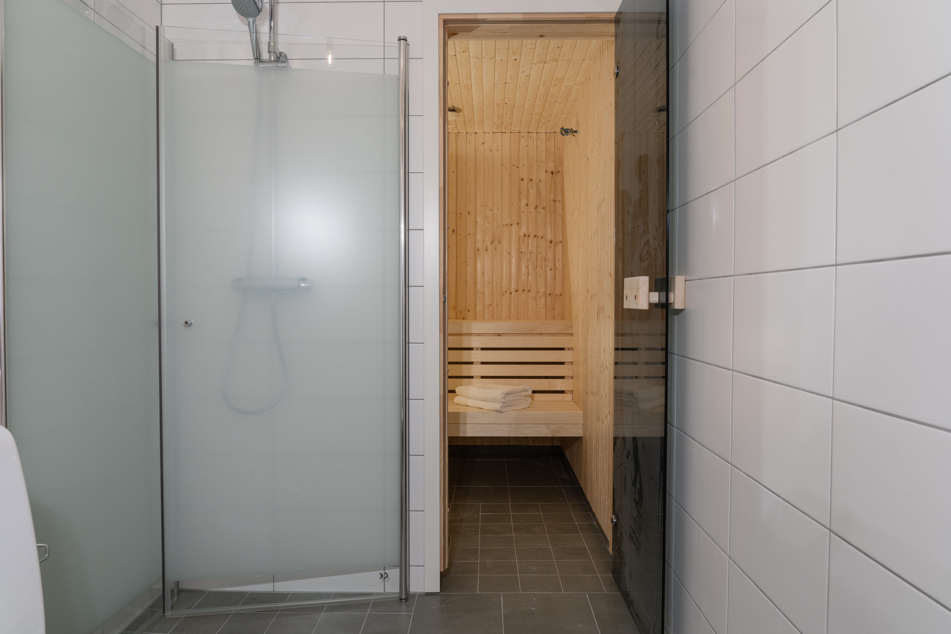 Extra lyxigt är att ha ett badrum per våningsplan. Intill de båda sovrummen finns badrum 2 med dusch, wc, tvättställ och spegel. Klinker på golv, kakel på väggar och målat tak.