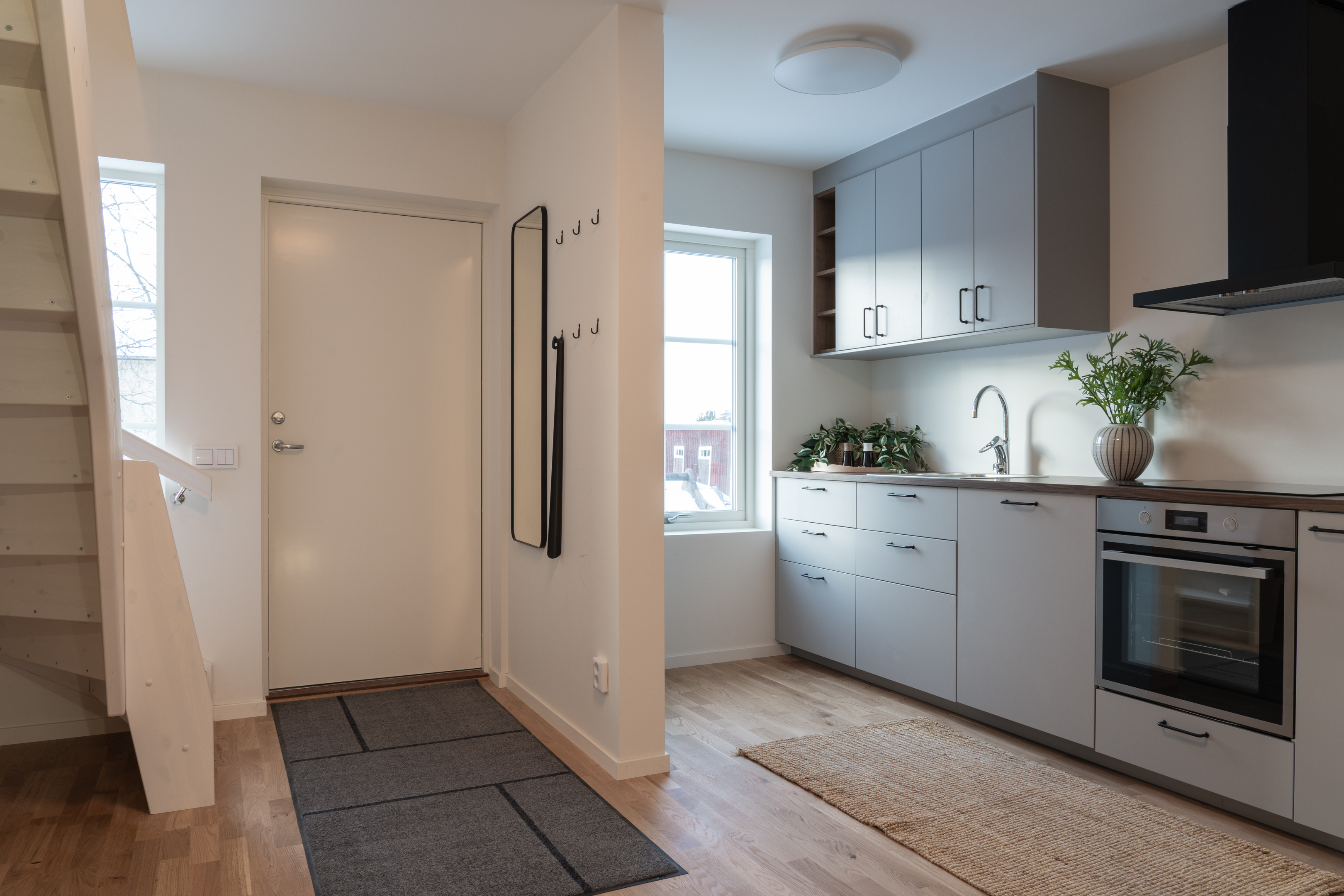 Ljus och välplanerad interiör ger en vilsam bas som är lätt att sätta sin egen personliga prägel på. Bottenvåningen består av kök, allrum med matplats och braskamin samt utgång till uteplats. Här finns även ett sovrum, badrum med bastu samt en praktisk hall med torkskåp. Övervåningen har två ljusa sovrum samt ett eget badrum och en klädkammare. Boarean varierar mellan 87-89 kvm beroende på bostadens placering i huset. De två mittersta bostäderna per huskropp har något större sovrum på övervåningen tack vare takkupor.