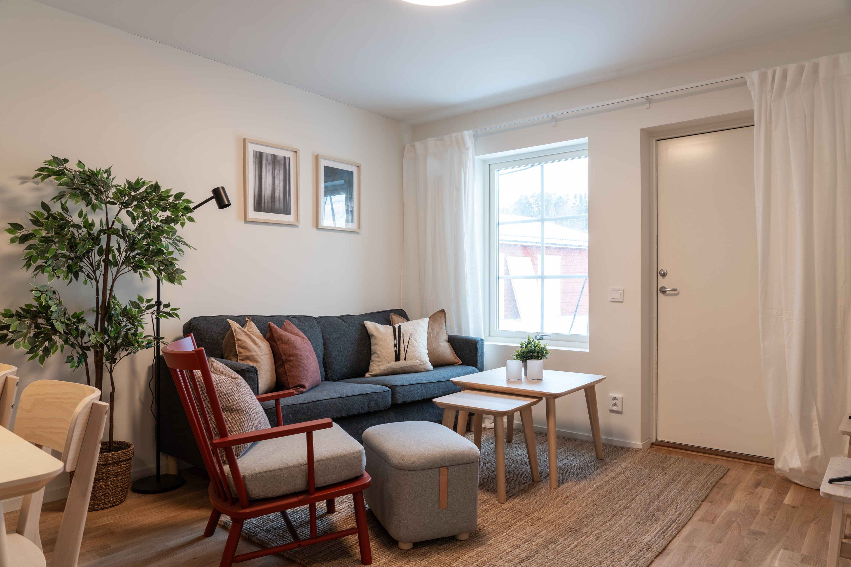 Ljus och välplanerad interiör ger en vilsam bas som är lätt att sätta sin egen personliga prägel på. Bottenvåningen består av kök, allrum med matplats och braskamin samt utgång till uteplats. Här finns även ett sovrum, badrum med bastu samt en praktisk hall med torkskåp. Övervåningen har två ljusa sovrum samt ett eget badrum och en klädkammare. Boarean varierar mellan 87-89 kvm beroende på bostadens placering i huset. De två mittersta bostäderna per huskropp har något större sovrum på övervåningen tack vare takkupor.