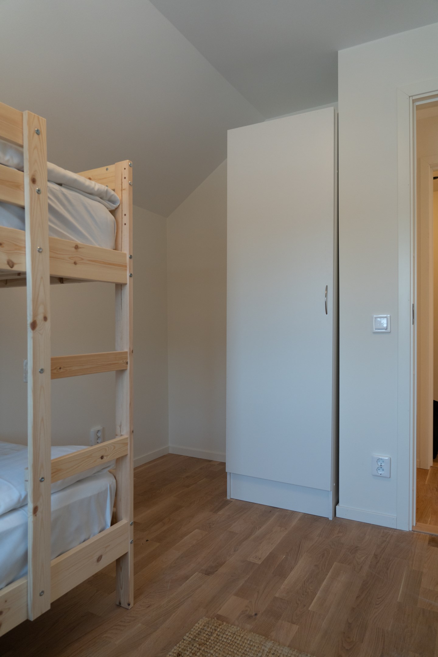 Bottenplanets sovrum nås från allrummet och rymmer tex en våningssäng med bredare underslaf eller en dubbelsäng. Garderobsvägg med 4 garderober. Ett fönster ger fint ljus. Ekparkett, vitmålade väggar och tak.