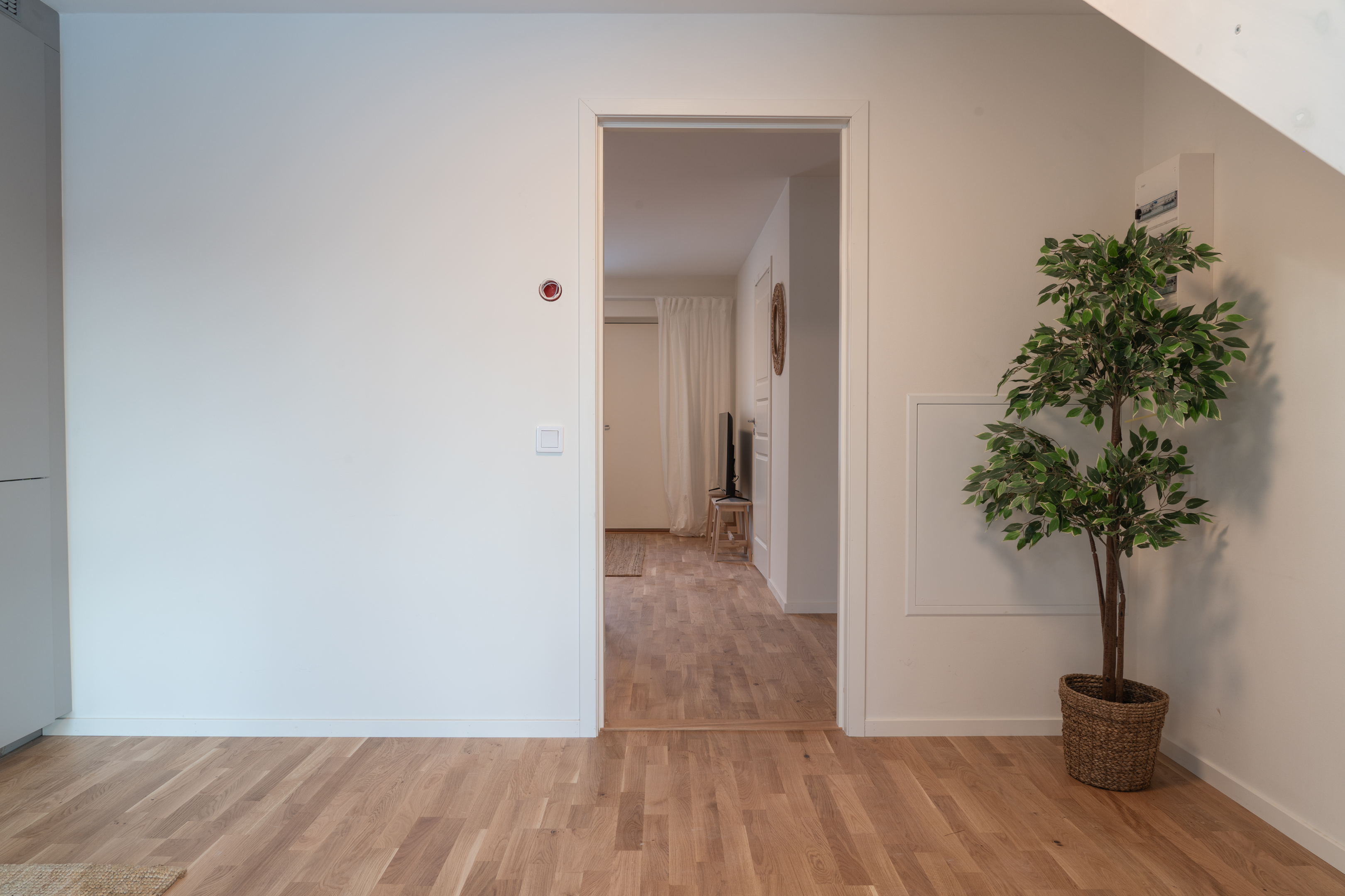 Ljus och välplanerad interiör ger en vilsam bas som är lätt att sätta sin egen personliga prägel på. Bottenvåningen består av kök, allrum med matplats och braskamin samt utgång till uteplats. Här finns även ett sovrum, badrum med bastu samt en praktisk hall med torkskåp. Övervåningen har två ljusa sovrum samt ett eget badrum och en klädkammare. Boarean varierar mellan 87-89 kvm beroende på bostadens placering i huset. De två mittersta bostäderna per huskropp har något större sovrum på övervåningen tack vare takkupor.