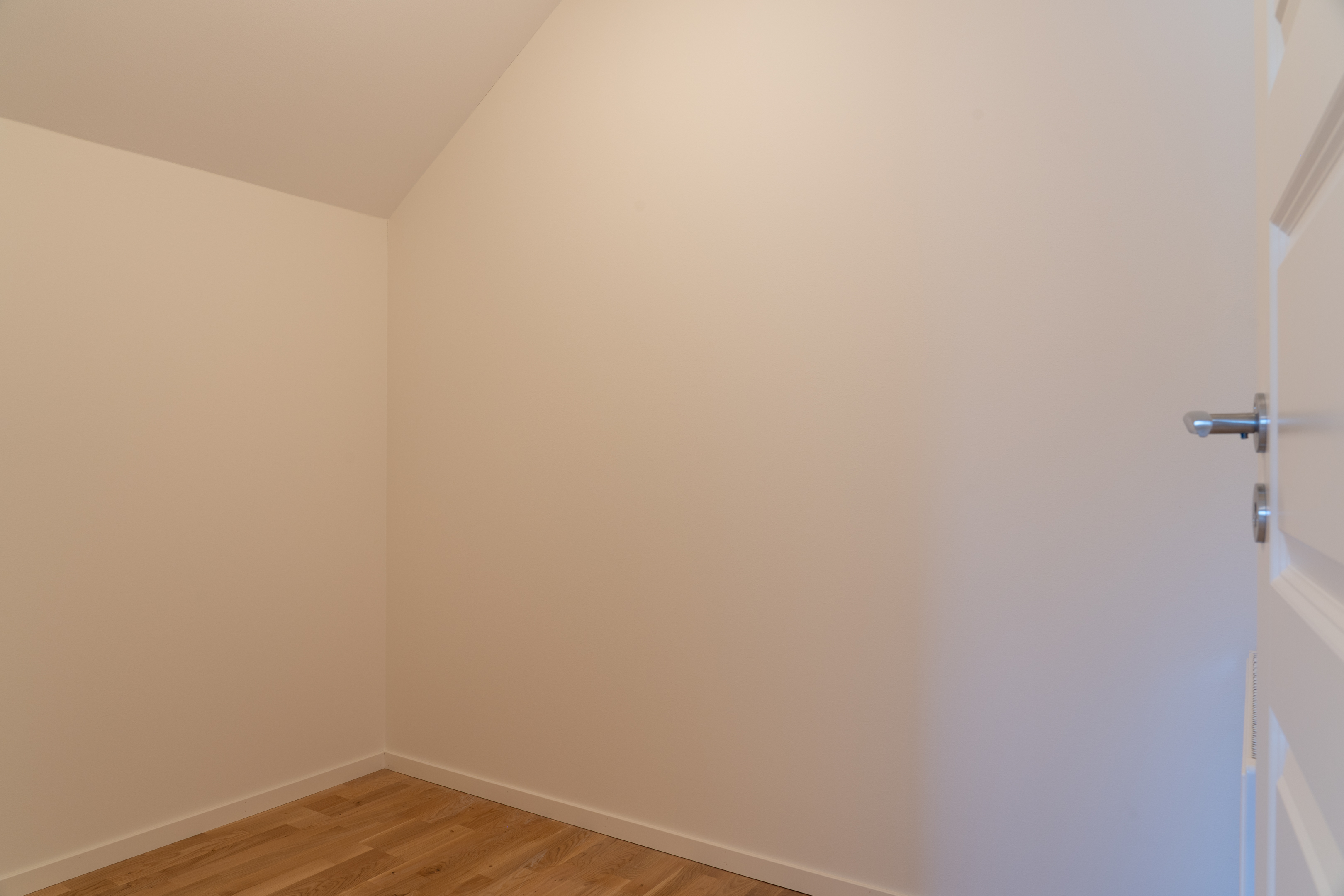 Övervåningen har en praktisk klädkammare för extra förvaring, perfekt för den som planerar att hyra ut sitt boende och vill förvara personliga tillhörigheter. Ekparkettgolv, vitmålade väggar och tak.