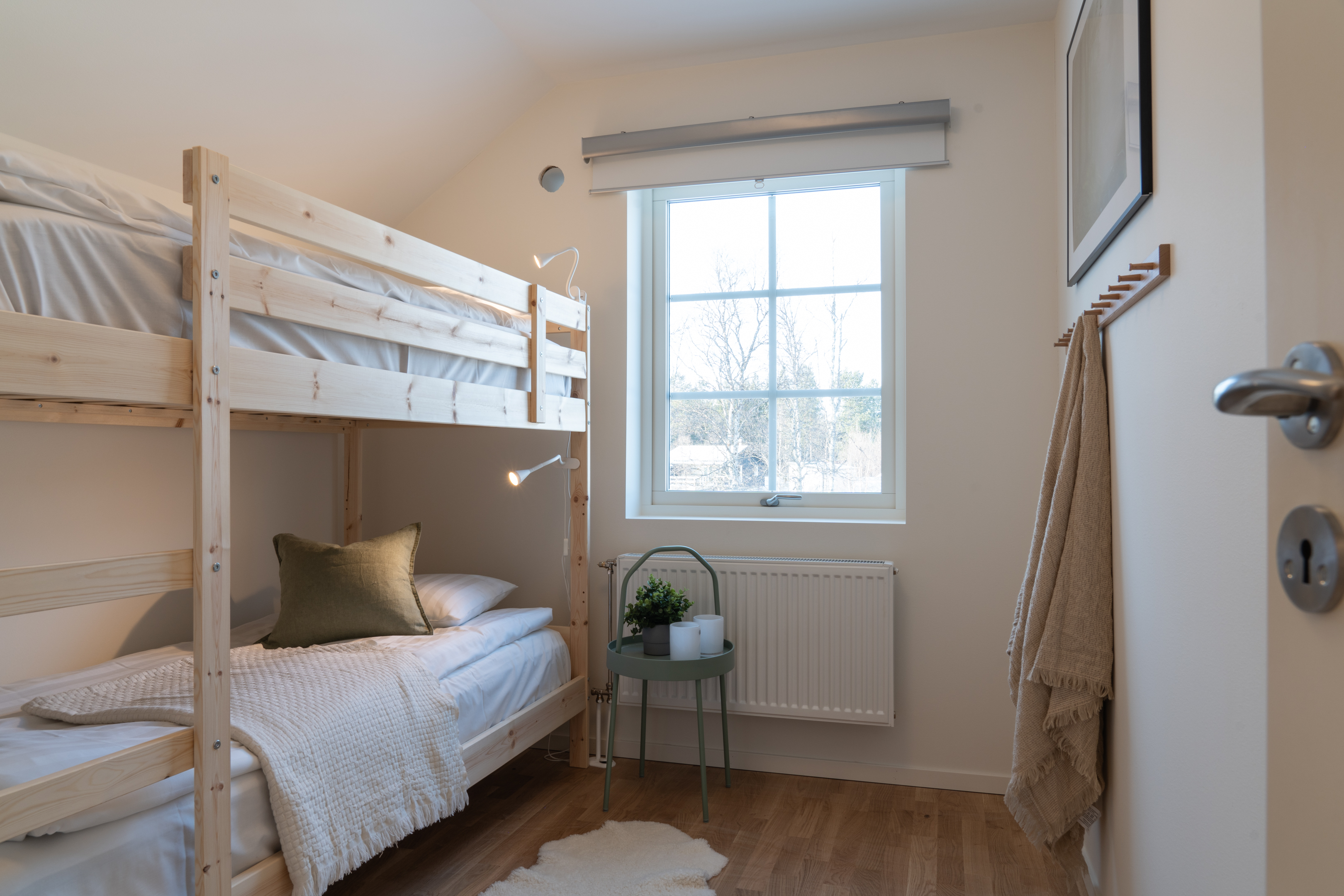 Övervåningen har två ljusa sovrum, ett något större sovrum med plats för dubbelsäng och förvaring i garderober samt ett sovrum med plats för enkelsäng/våningssäng och garderober. Sovrummen kan variera beroende på placering i huset. De två mittersta bostäderna i huskroppen har takfönster med små charmiga burspråk. Samtliga sovrum har ekparkettgolv samt vitmålade väggar och tak.