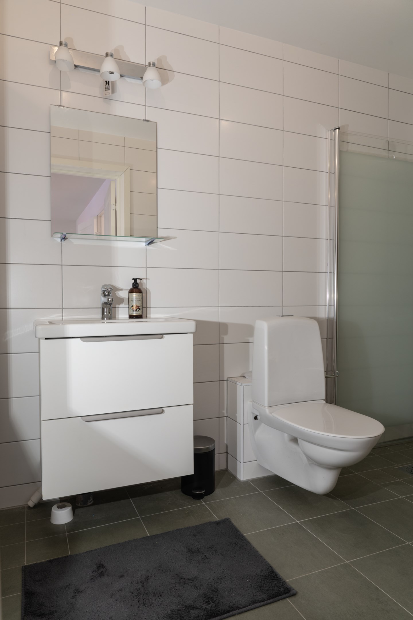 Extra lyxigt är att ha ett badrum per våningsplan. Intill de båda sovrummen finns badrum 2 med dusch, wc, tvättställ och spegel. Klinker på golv, kakel på väggar och målat tak.