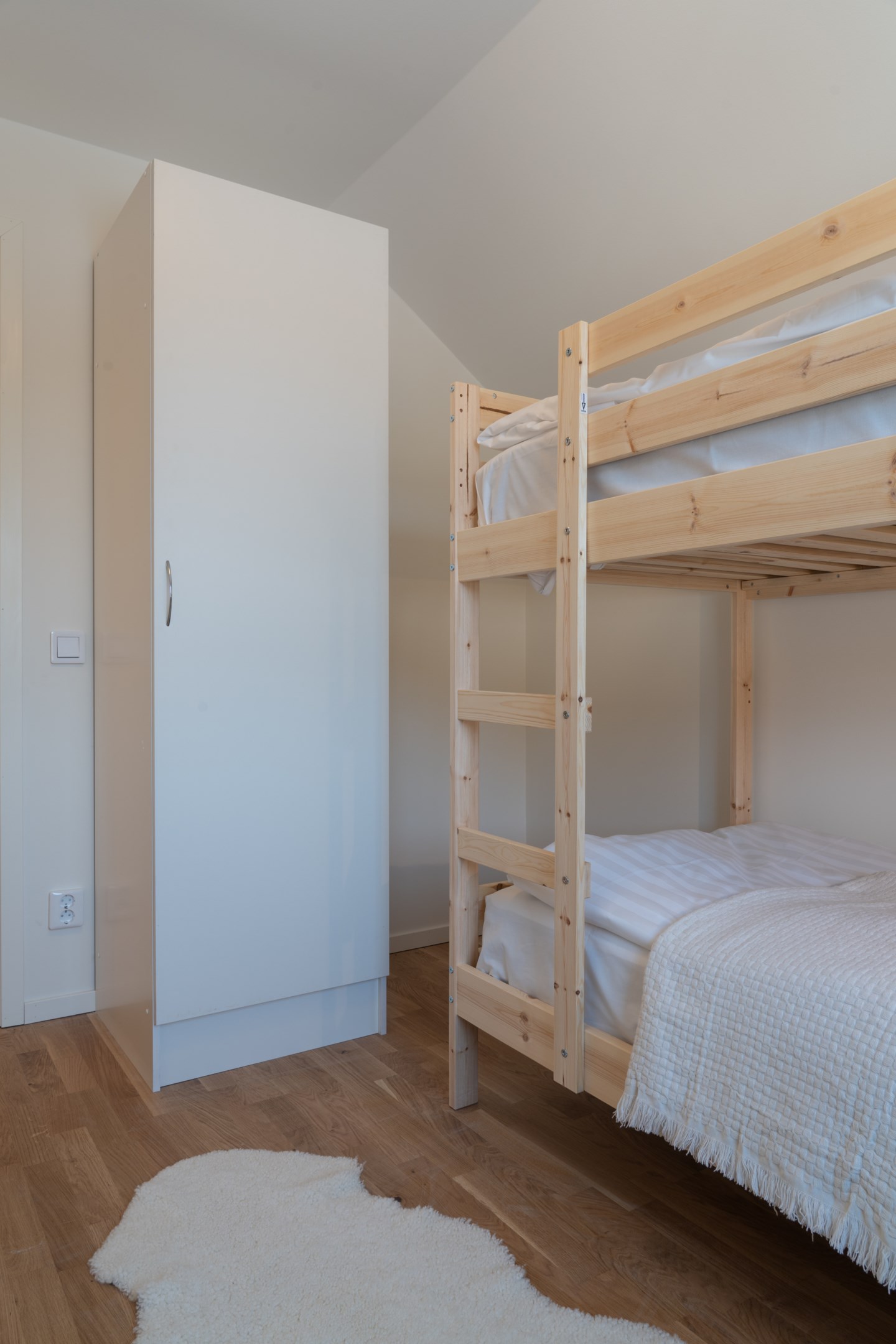 Bottenplanets sovrum nås från allrummet och rymmer tex en våningssäng med bredare underslaf eller en dubbelsäng. Garderobsvägg med 4 garderober. Ett fönster ger fint ljus. Ekparkett, vitmålade väggar och tak.