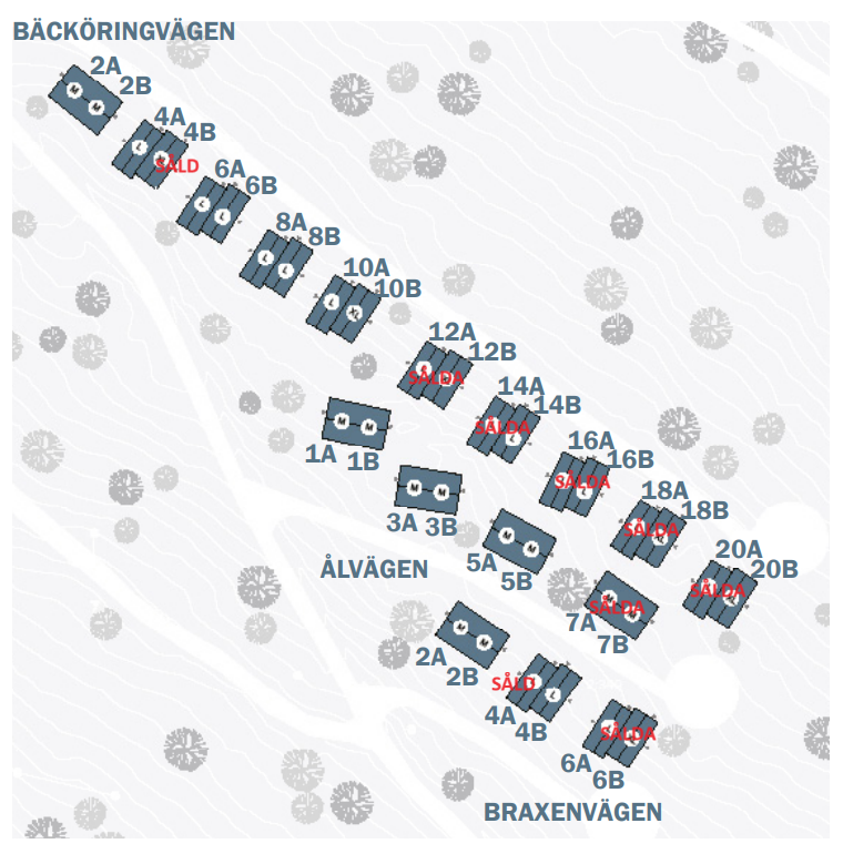 Förtydligande uppvärmning: Vattenburen golvvärme i alla rum kopplad till elvärmepanna. Förtydligande ventilation: PAX-fläkt i badrum, friskluftsventiler i alla sovrum. Varje hus har ett enskilt abonnemang för fiber och el. Huset har tillgång till egen parkeringsplats med belysning och motorvärmaruttag. Skidförråd finns på baksidan av huset.