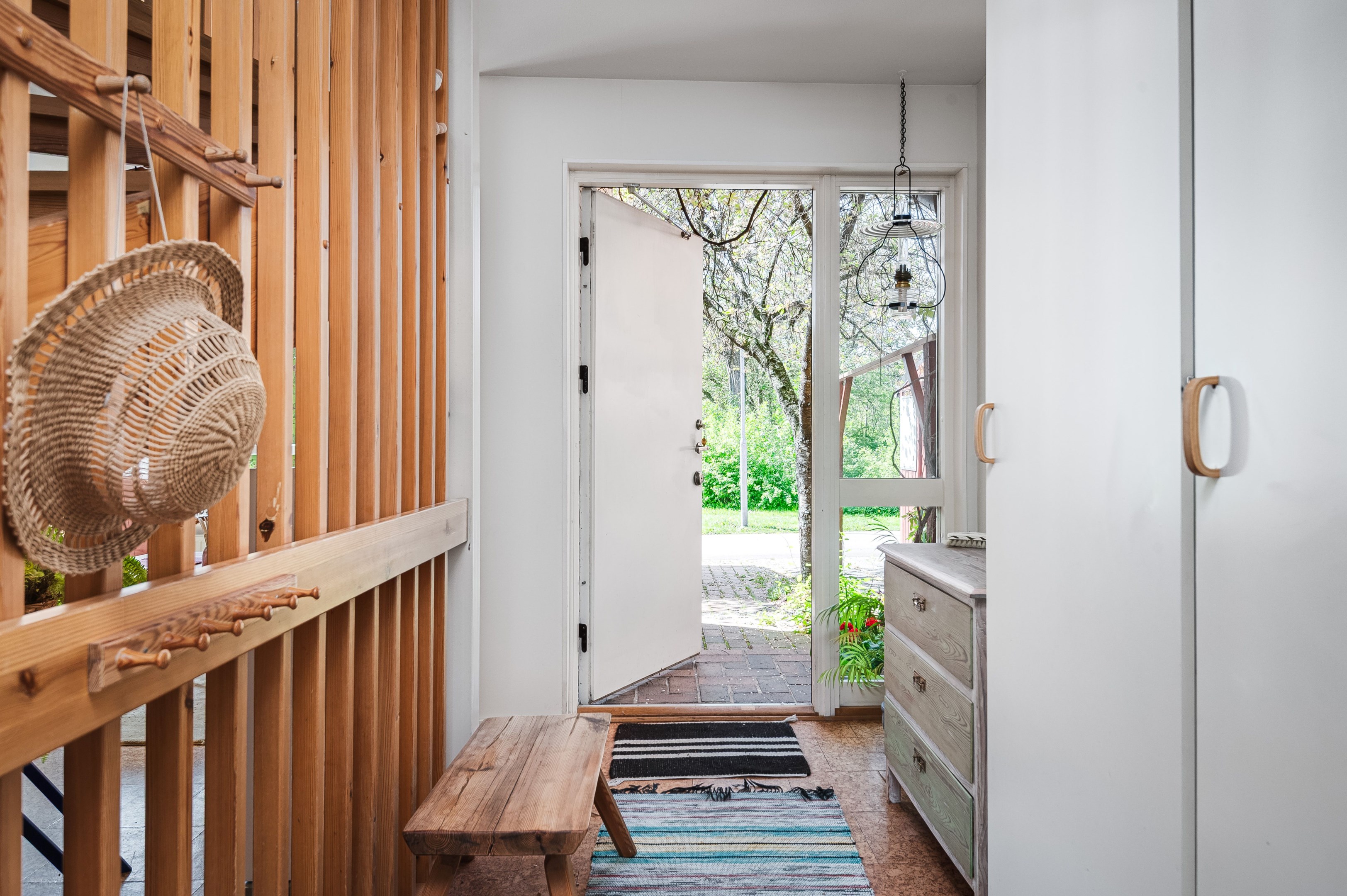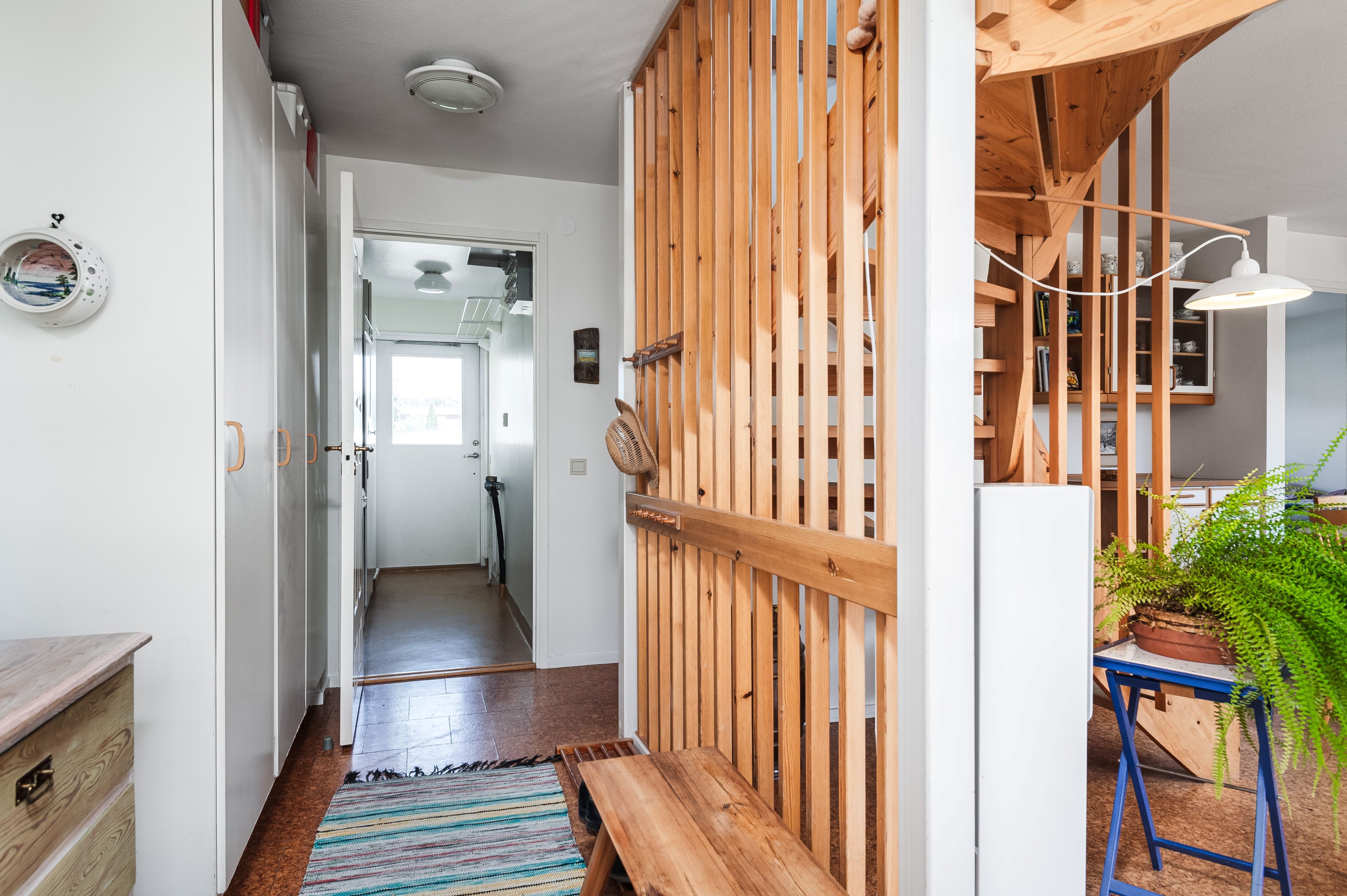 ENTRÉ Välkomnande entréhall med gott om plats för avhängning i garderober. Plastmatta och målade väggar. VARDAGSRUM Ljust och härligt vardagsrum med kork/ plastmatta och målade väggar. Plats för matgrupp samt öppen planlösning gentemot köksdel. KÖK Funktionellt kök med vita luckor samt halvvägg med överskåp, bänkskivor i massivt trä samt diskbänk i rostfritt stål. Utgång till uteplats. Utrustning: Spis med häll, spisfläkt, diskmaskin samt mikrovågsugn. SOVRUM Linoleummatta och målade väggar. SOVRUM Linoleummatta och målade väggar. BADRUM Fräscht badrum mosaikgolv med golvvärme samt kaklade väggar. Utrustning: Wc, handfat, spegelskåp, Handdukstork,inbyggt badkar, vit bänk med underskåp och massiv ekskiva, överskåp med spotlights samt vädringsfönster. GROVENTRÉ/ TVÄTTSTUGA Fuktionell tvättstuga med våtrumsmatta och målade väggar. Utgång till husets baksida och gatan. Utrustning: Tvättmaskin, torkskåp, skåp och fjärrvärmesystem. ÖVRE PLAN ALLRUM Stort allrum med parkettgolv och målade väggar. Här står två stora garderober vilka kan medfölja vid köp. Är man i behov av ytterligare ett sovrum så kan man relativt enkelt omdisponera rummet. Förråd i direkt anslutning till allrum. SOVRUM Mysigt sovrum med linoleummatta, målade väggar och skjutdörrsgarderob. SOVRUM Trivsamt sovrum med linoleummatta och målade väggar. DUSCHRUM Fint duschrum med kaklade väggar och klinkergolv med golvvärme. Utrustning: Wc, handfat, spegelskåp, glashylla, handdukstork samt dusch.