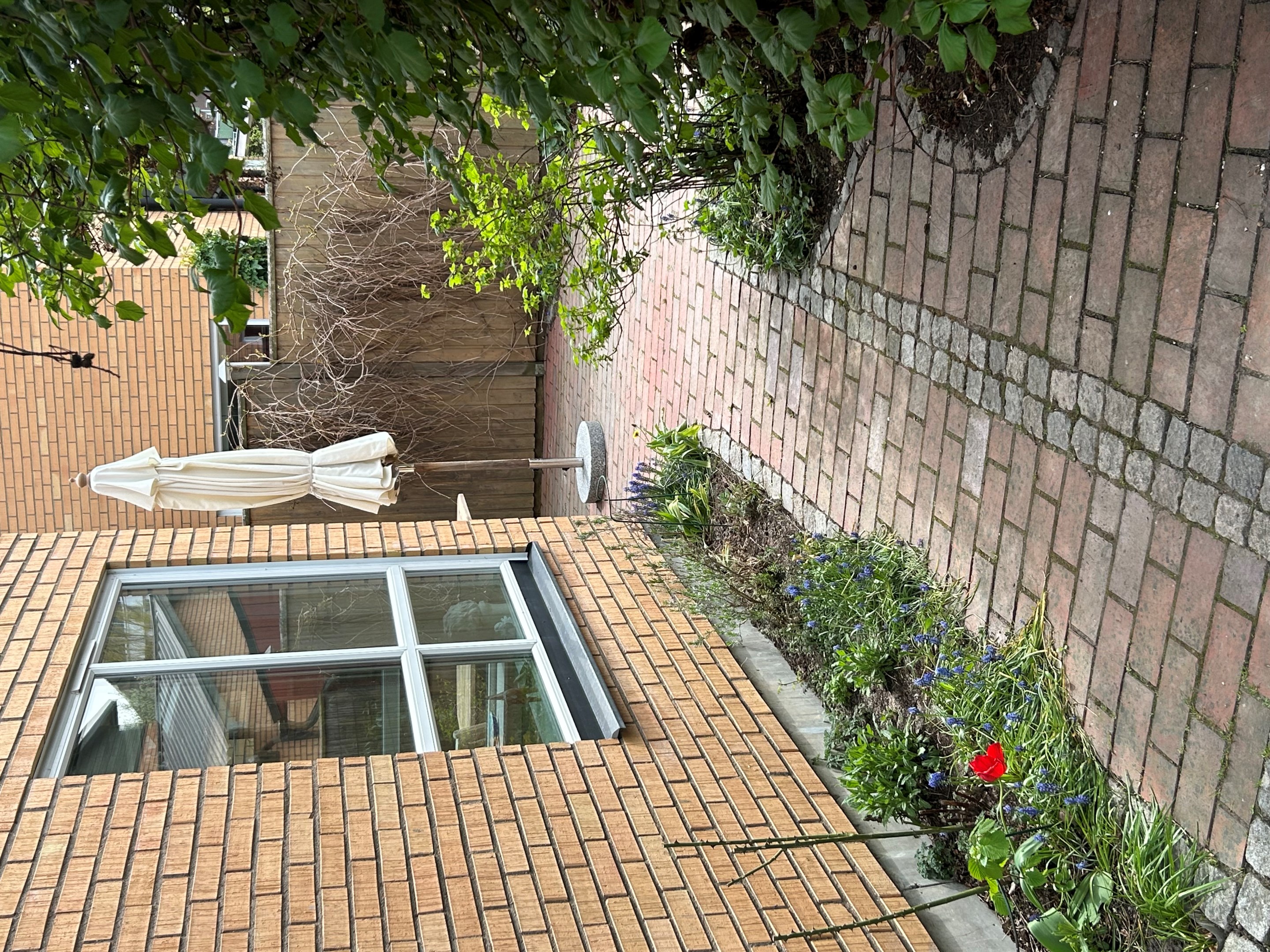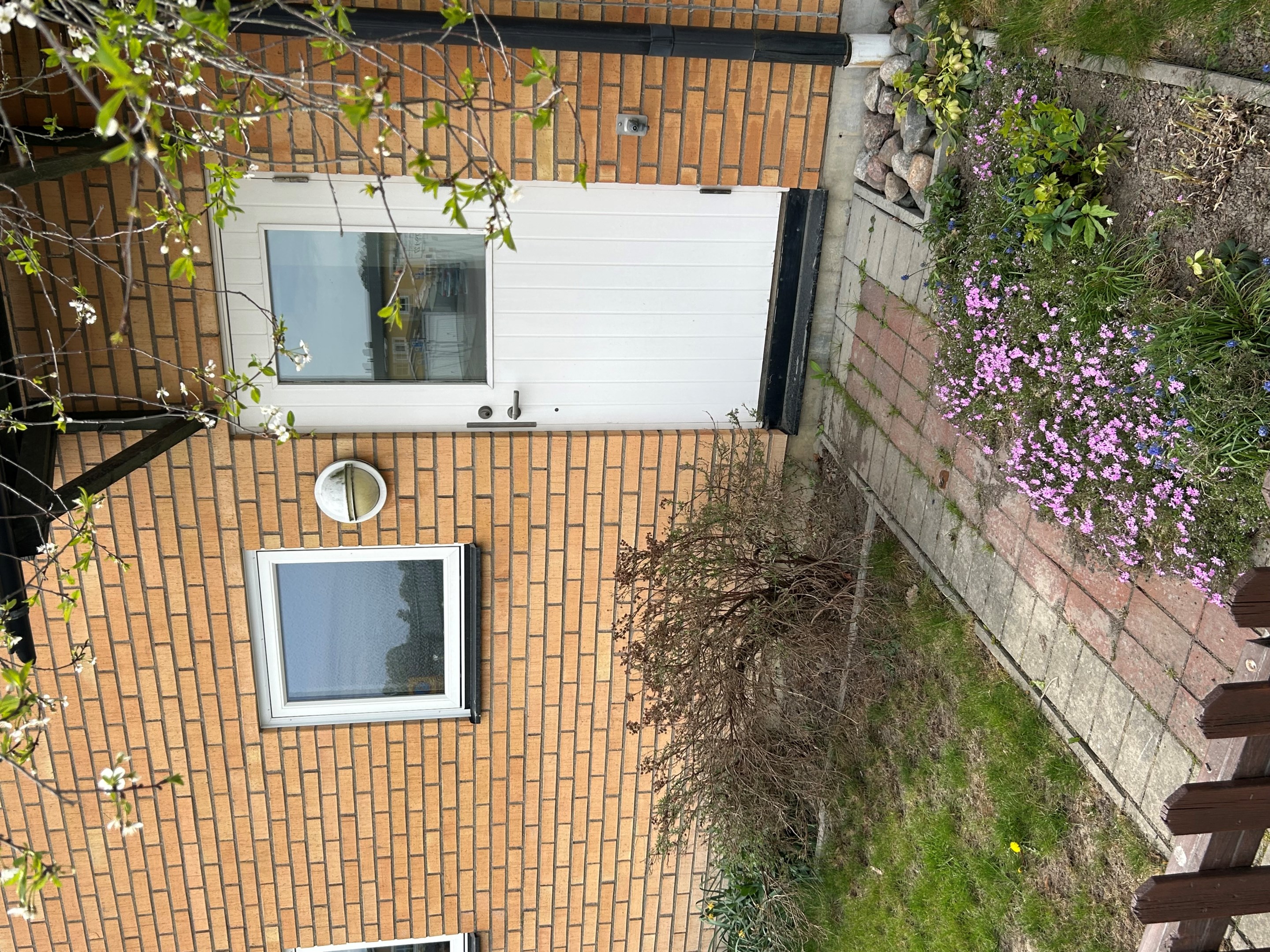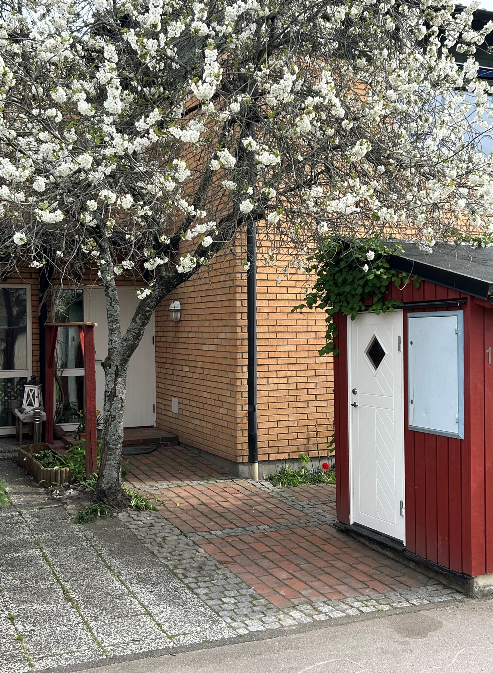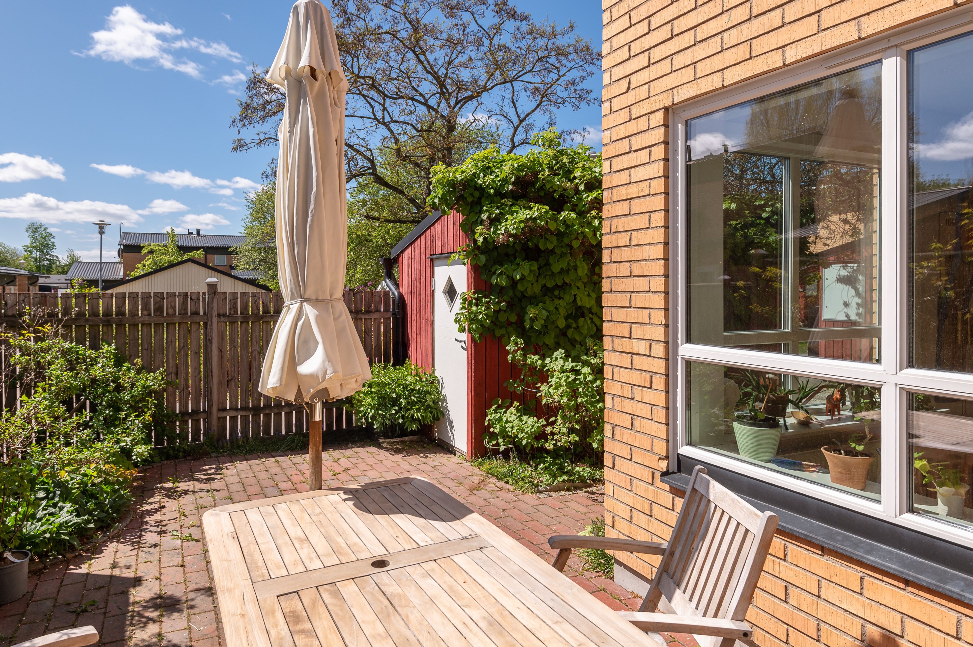 Skyddad och lummig uteplats vid husets entrésida. Mindre gräsmatta vid groventrén.