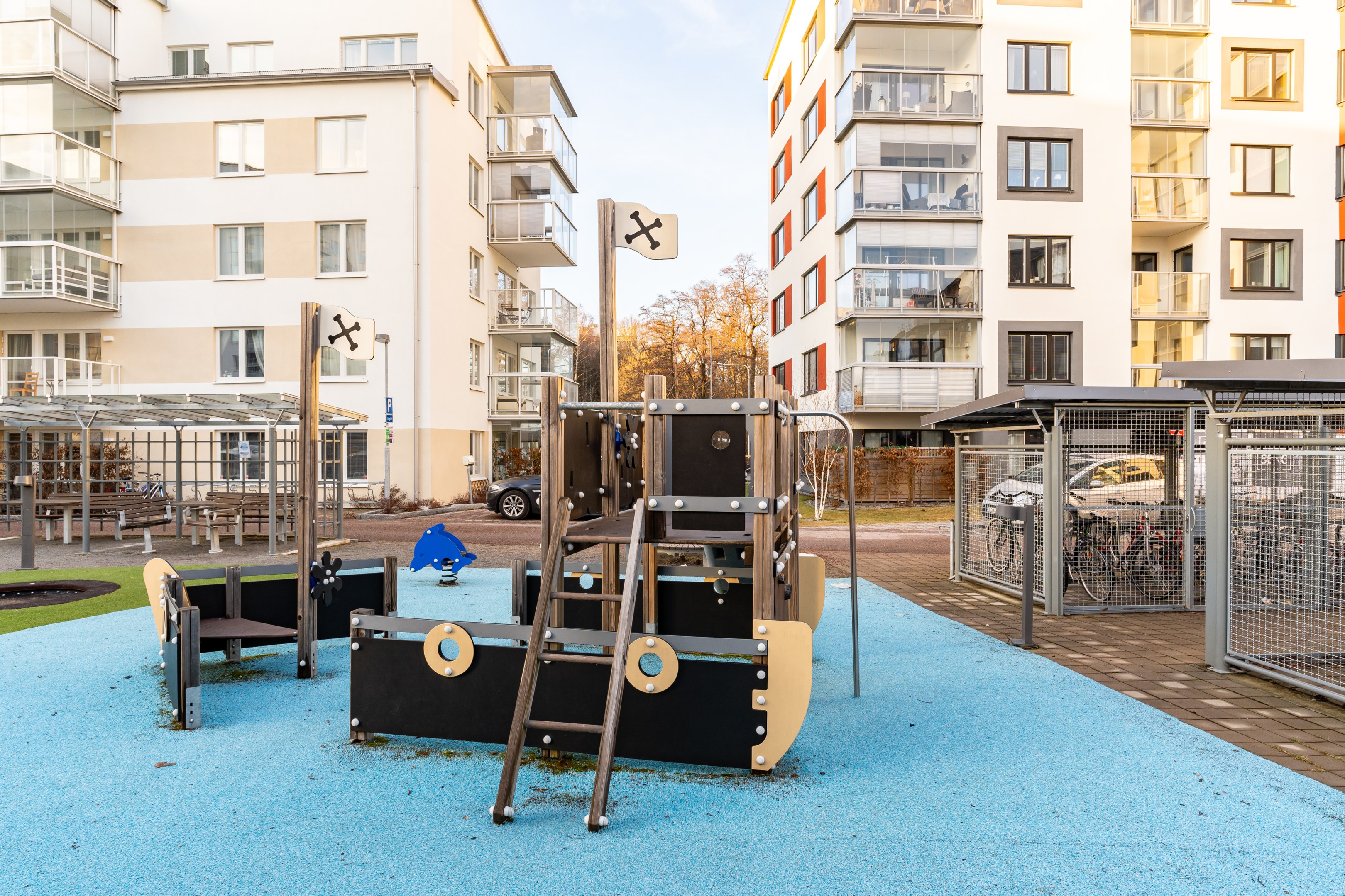 Cykelställ med tak, barnvagnsrum, miljöhus. Samfällighetens gemensamhetslokalen "Svarta huset" går att hyra för en kostnad om 500 kr/dygn (från kl 12.00 - kl 12.00 nästa dag). I lokalen finns ett större rum (utrustat med pentry, ett större matbord och soffa), ett mindre sovrum samt en toalett. (inga förråd finns att tillgå).