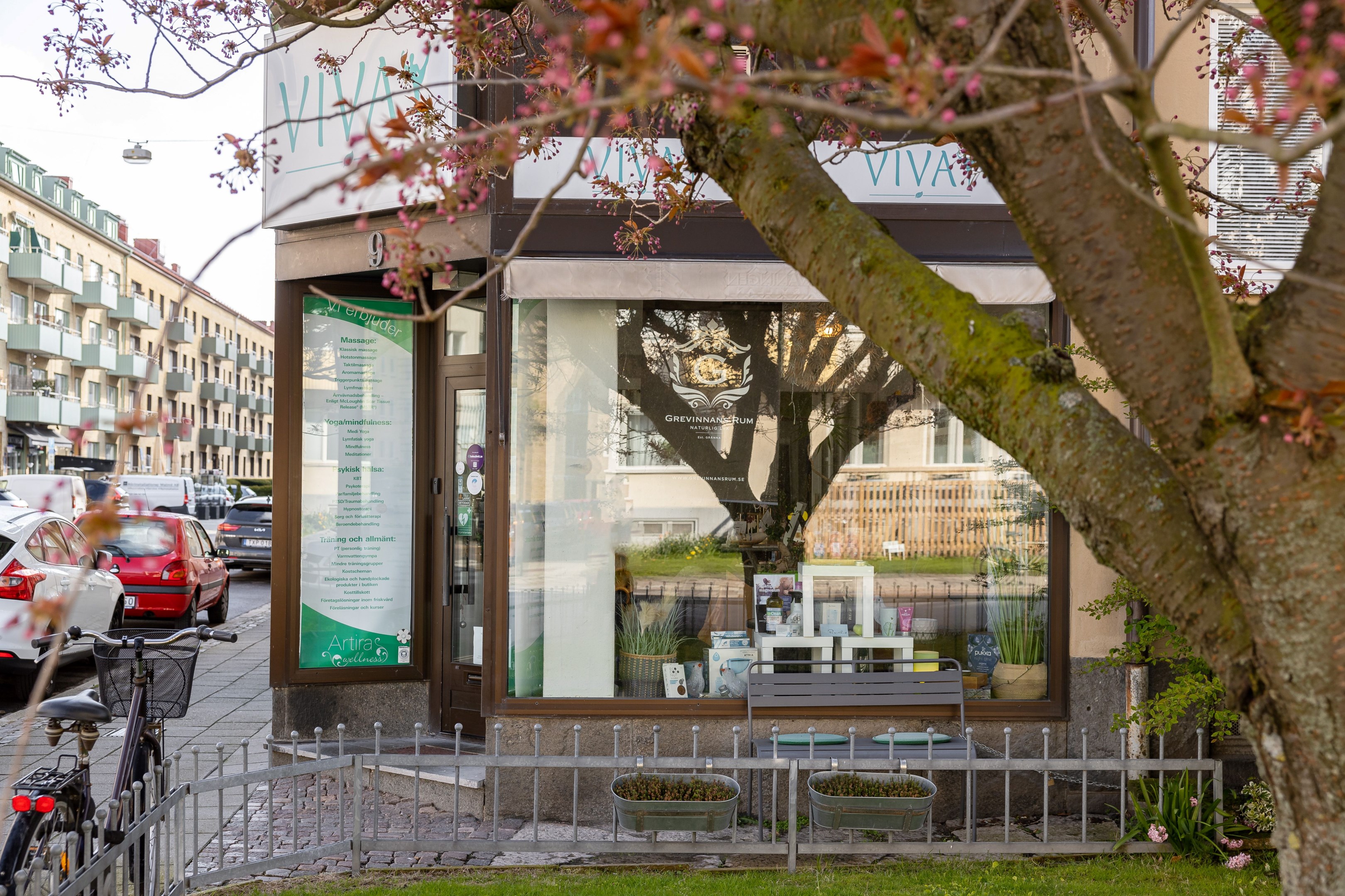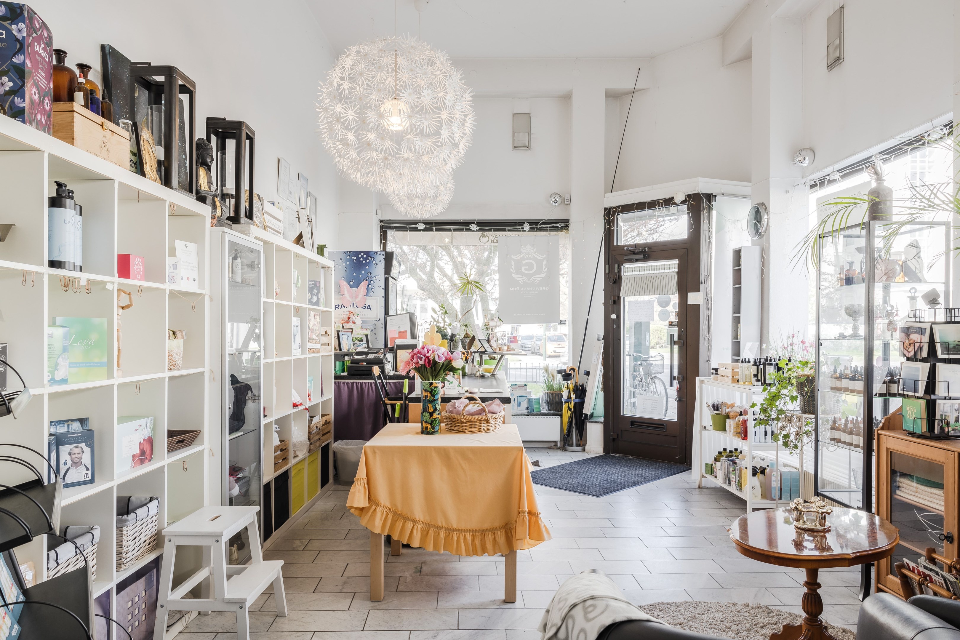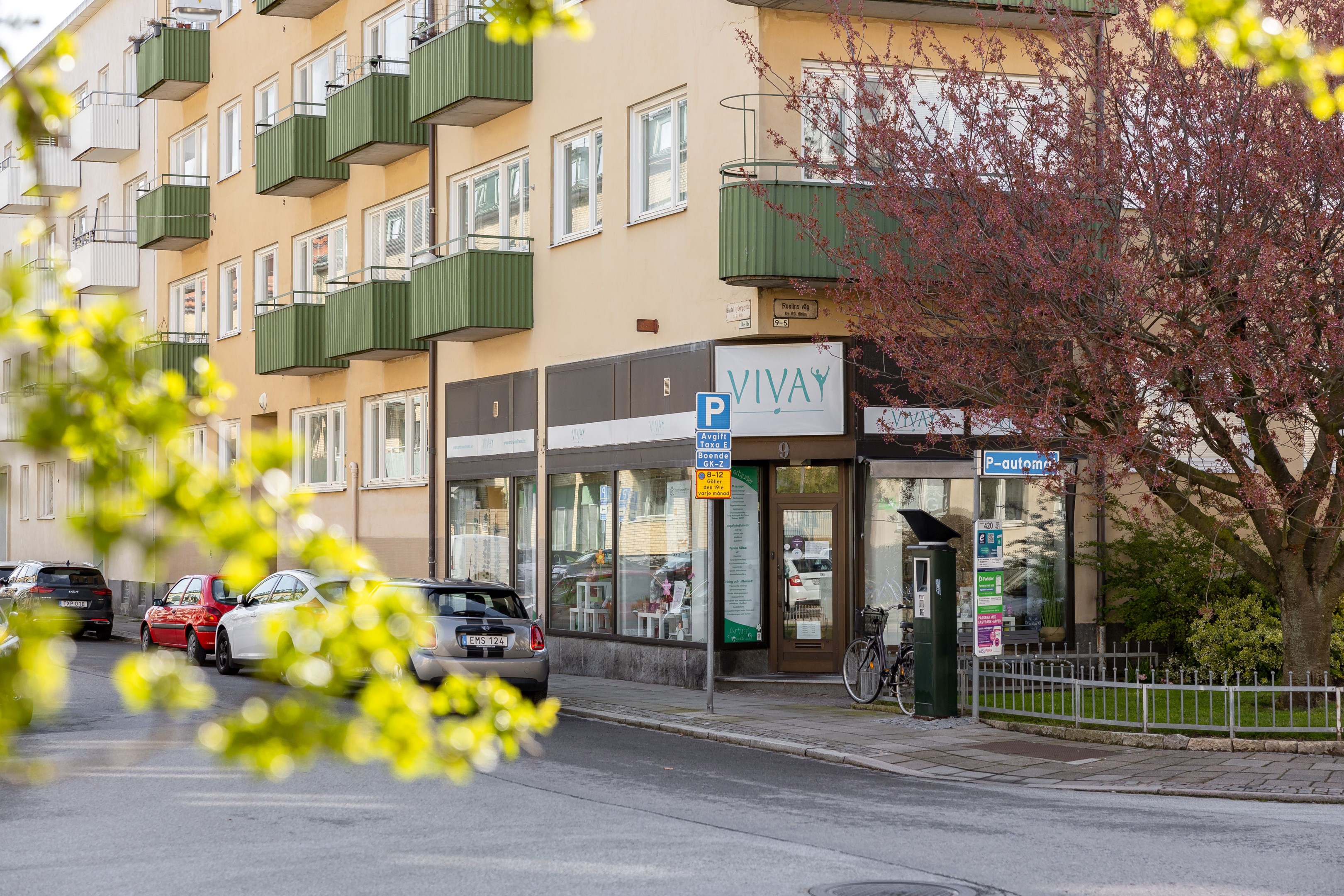 Butik med hörnläge och bra skyltmöjligheter. Utvändigt finns det plats för t ex några sittplatser till höger om entrén. F n hyrs lokalen av ett företag som driver wellnessinriktad verksamhet men bl a ett litet gym, försäljning av wellnessprodukter samt behandlingar. Lokalen kan dock passa kan passa för många olika typer av verksamheter. Utöver två rum i butiksplan så finns också ett mindre utrymme en halv trappa upp (passar ev som väntrum eller som kontorsplats) samt ett mindre pentry och ett källarplan där det har varit behandlingsrum etc. Enligt hyresavtalet är lokalen 40 kvm. (Anmärkning: Troligen är källaren ej inräknad i denna yta) Hyran för lokalen är f n 10.442 kr per månad plus fastighetsskatt 748 kr / månad. Summa hyra inkl moms och fastighetsskatt är f n 13.802