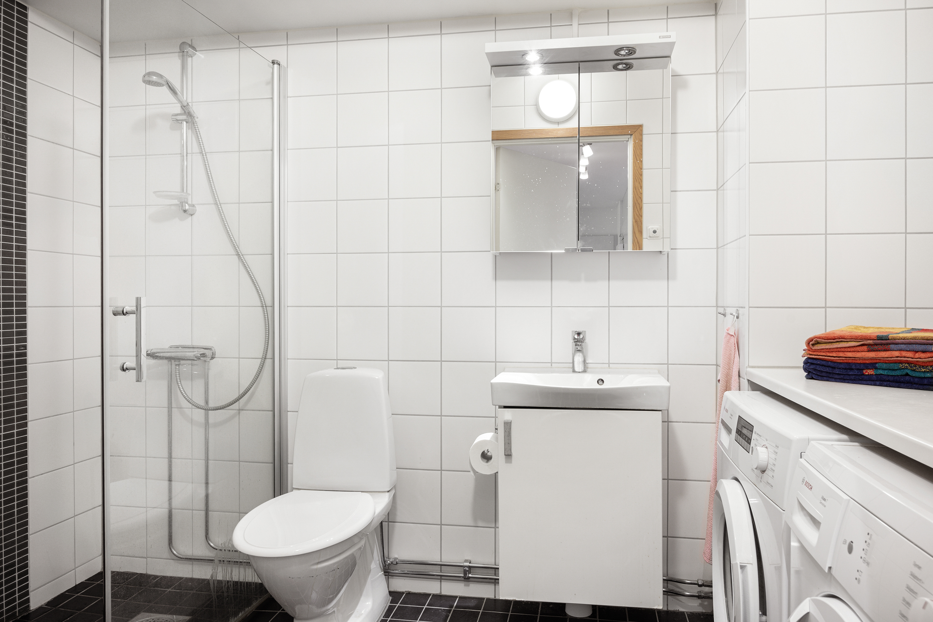 Helkaklat, dusch /vägg, Wc, handfat med kommod, handdukstork, Tvättmaskin , torktumlare, arbetsbänk. Golvvärme.