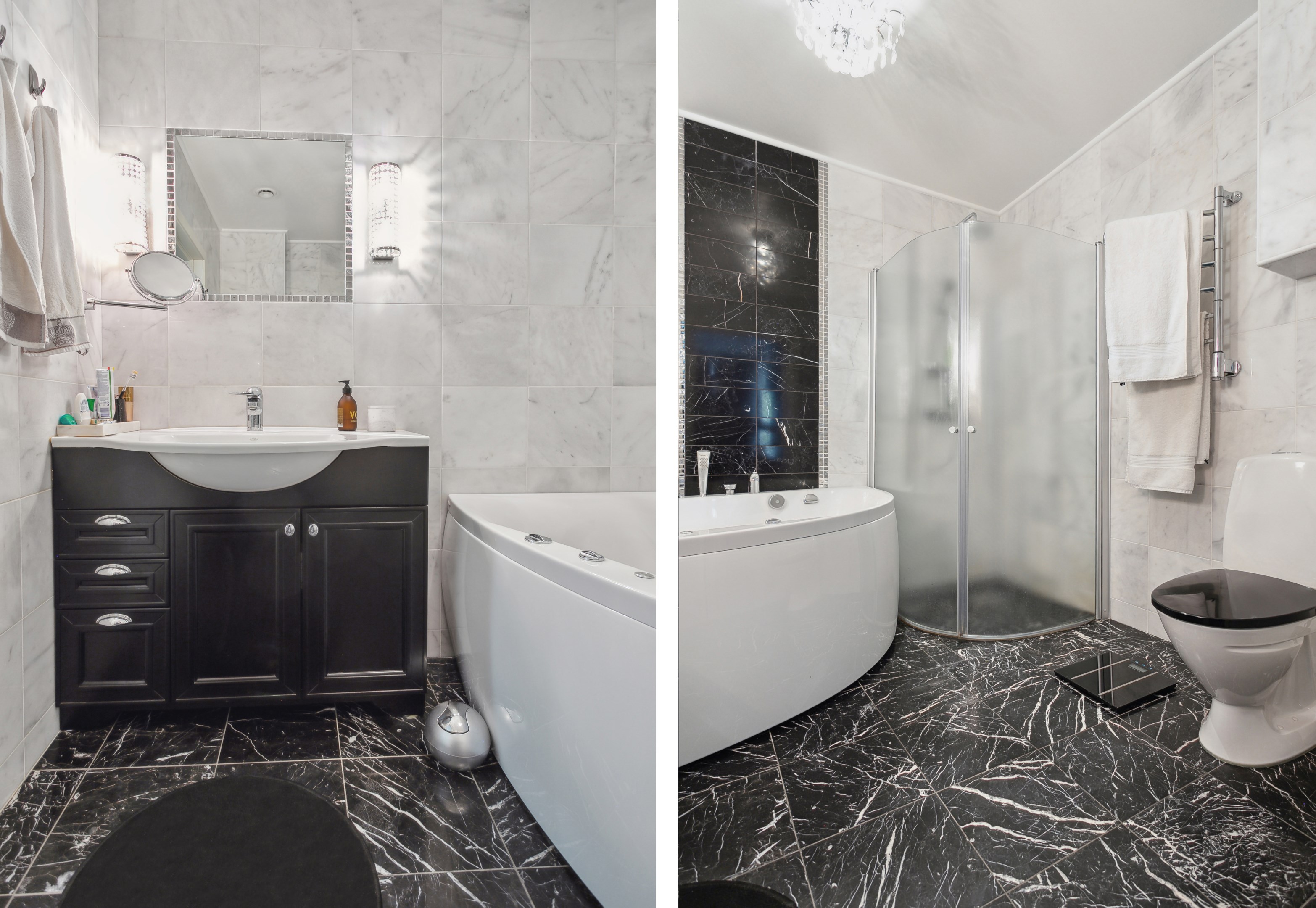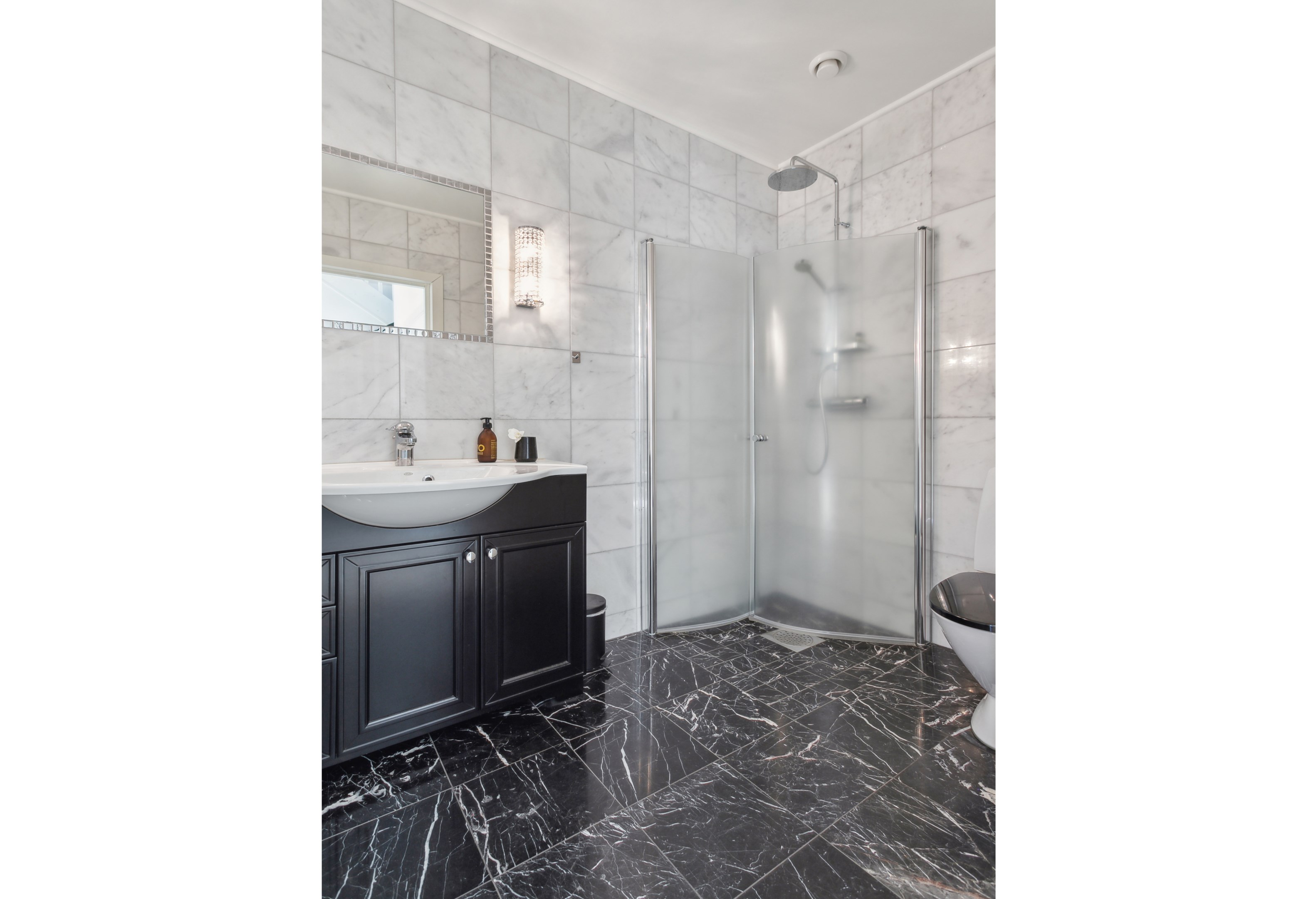 Väl tilltaget med rejäl badrumsmöbel som har dubbla handfat vilket underlättar morgontimmarna och ovanför finns en inkaklad stor spegel med belysning ovan. Till vänster om badrumsmöbeln finns en lucka som man kan slänga ner tvätten i så den hamnar i tvättrummet på entréplan. Vacker stenmarmor på både golv och väggar, vattenburen golvvärme och duschhörna med takdusch samt svängbara glasväggar. Spotlights i tak, dubbla handdukstorkar, WC och en fin bastu för 4-5 personer med dörr i rökfärgat glas.