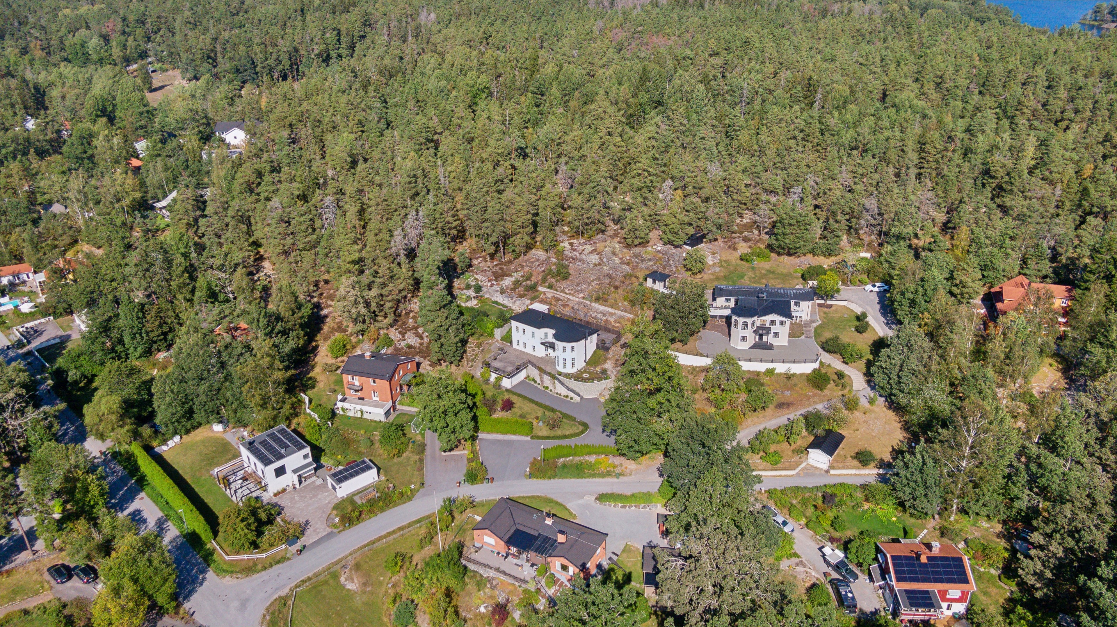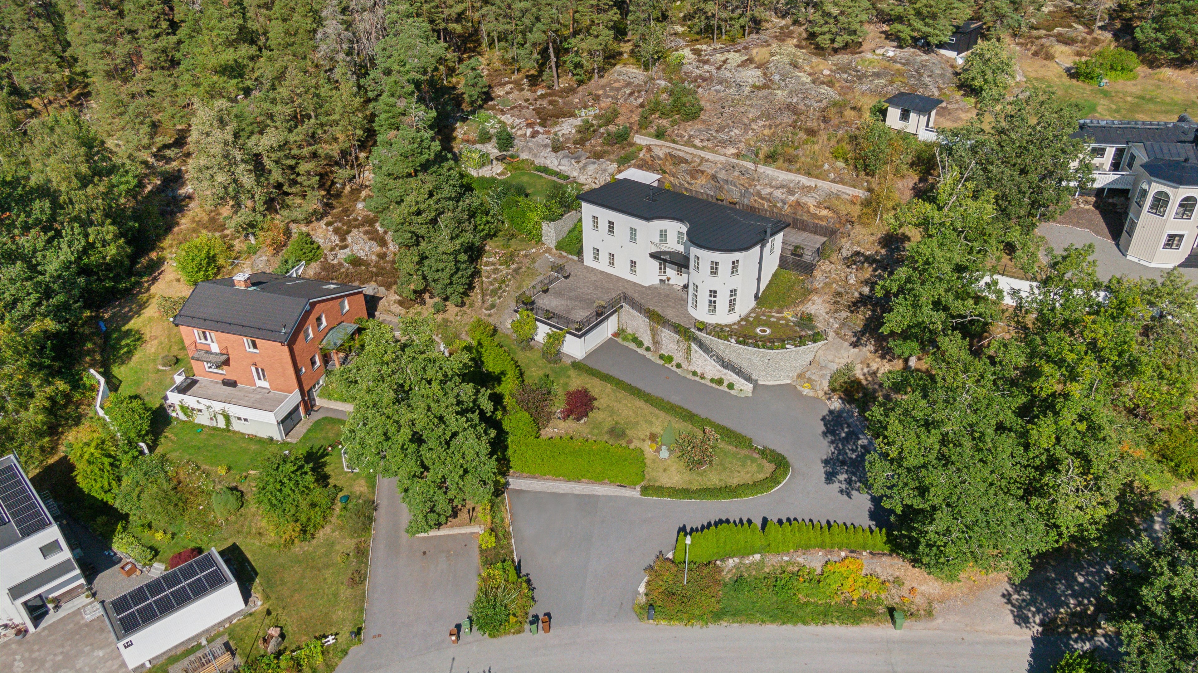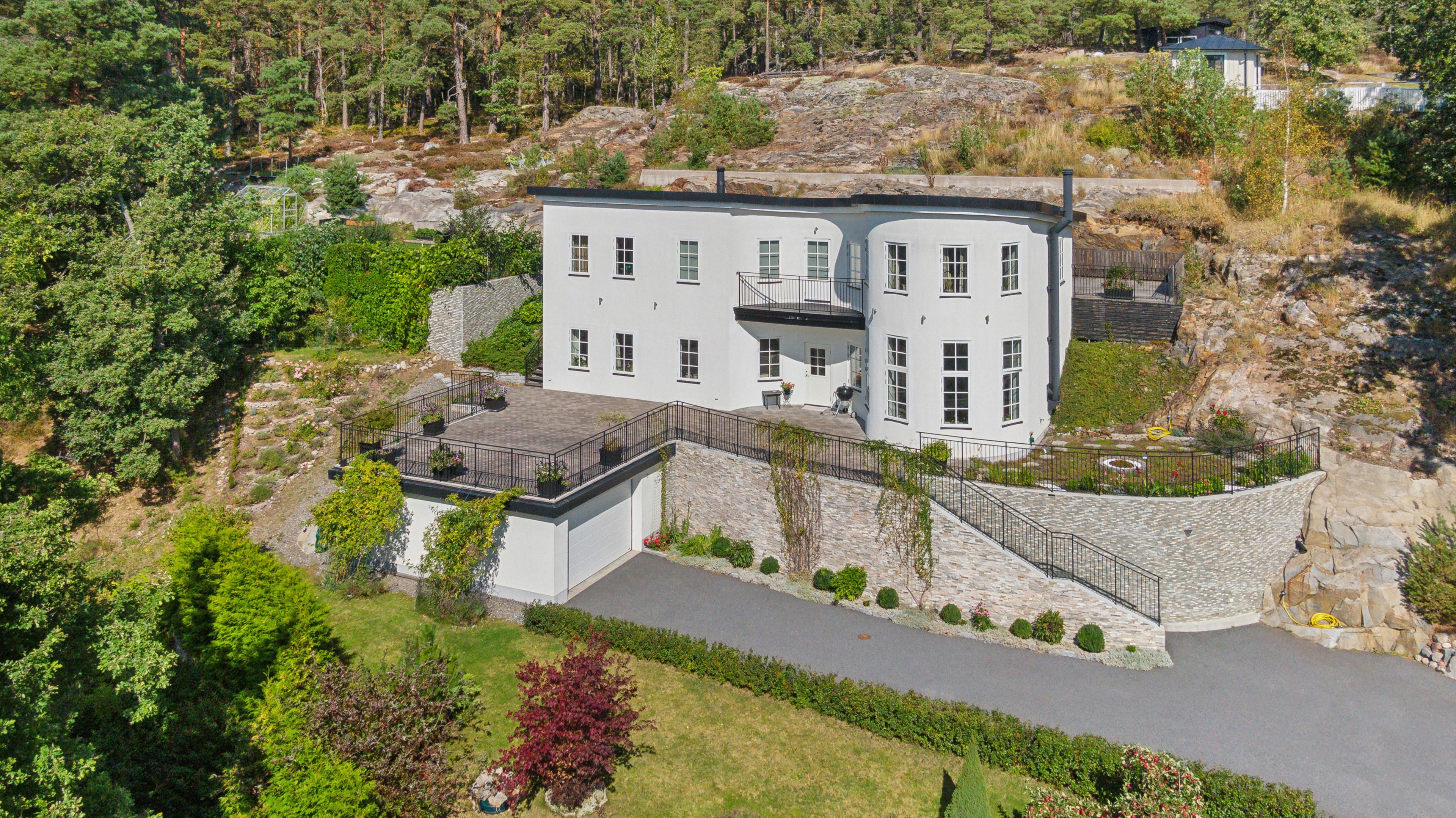 Välkommen till denna påkostade stenvilla om totalt 210 m² som ligger på en fridfull återvändsgata granne med naturområde samt ett svårslaget och högt solläge. Genomgående vattenburen golvvärme via bergvärme, soldränkt tomt, imponerande takhöjd, dubbelgarage, 3 badrum, FTX-ventilation, uteplats och altan om ca 200 m² samt två braskaminer är några av villans alla fördelar. Sommarvatten underlättar bevattning av tomten. Planlösningen är väldigt flexibel beroende på vilka behov man har. Till höger innanför den luftiga entrén ligger köket som bjuder på massor av förvaring och arbetsytor som består av marmor. En riktig oas för kocken i huset. Nuvarande matplats har en imponerande takhöjd som fullkomligt badar i ljus via de stora fönsterpartierna. Här får man lätt plats med ett stort matbord för 8-10 personer. I köket finns även ett stort skafferi bakom en dörr, vinkyl, väggfast braskamin samt kyl/frys med ismaskin samt iskallt vatten. Matplatsen är så pass stor att den även kan nyttjas som vardagsrum/allrum om man föredrar detta. Stor stenlagd uteplats i anslutning till entrén som sträcker sig ut ovanför garaget i soligt söderläge med gott om plats för utemöbler. På entréplanet ligger även Master bedroom med badrum ensuite och egen walk-in closet som underlättar vardagen och känns väldigt lyxigt. Därutöver finns tvättavdelning samt en extra dusch/WC och en praktisk klädkammare till ytterkläder. Takhöjden på entréplanet ligger på ca 3 meter förutom i matplatsdelen som är ca 3,6 meter. Övre plan har ett stort allrum som inbjuder till mingel med vänner eller som sällskapsyta när barnen tar hem sina kompisar. Från allrummet når man balkongen som ligger i soligt söderläge med fin utsikt och från allrummet nås även baksidans stora altan om drygt 125 m² som passar perfekt för fest. Utmärkt läge för utekök och avkoppling utomhus i en privat sfär. 3 sovrum som alla rymmer dubbelsängar gör att det är enkelt att fördela rummen mellan familjemedlemmarna. Fint vitlaserat ekparkettgolv skapar en härlig atmosfär. Badrummet på detta plan har dubbla handfat, dusch och bastu. Dessutom finns en lucka för att skicka ner tvätt direkt till tvättrummet. Takhöjd på upp till 2,9 meter på övre plan då villan har pulpettak. Asfalterad väg in till villans dubbelgarage med vackra stenpartier. Tomten som är terrasserad har fått mycket kärlek och här finns fruktträd, bärbuskar och annan växtlighet. Växthus för egna odlingar samt en gräsmatta för barnen att busa runt på. Tomten ramas in fint av tujor och gör fastigheten ännu mer privat. Området är så nära en villaidyll man kan komma med massor av kringliggande natur. Inom promenadavstånd finns badplatser, flertalet lekplatser samt fotbollsplan. Området erbjuder även ridskola, golfklubb, kajakklubb och motionsspår. Vintertid när isen är på plats plogas Insjön och skapar härliga möjligheter för skridskoåkning. Nära till Velamsunds båtklubb. När det kommer till affärer och annan service finns det väldigt mycket att välja mellan. En kort biltur eller busstur bort finns Nacka Forum, Orminge Centrum samt Sickla köpkvarter. Nära och bekvämt. För barnen finns det en hel del grundskolor, gymnasieskolor och förskolor att välja mellan. Sammantaget är detta en väldigt tilltalande samt unik fastighet med en påkostad arkitektritad stenvilla samt dubbelgarage och vackert uppvuxen tomt. Samtidigt är kommunikationerna förträffliga då du är snabbt ute på Värmdövägen som tar dig in till stan på drygt 20 min. I området avgår även motorvägsbuss som tar dig in till Slussen på drygt 25 min. 5 minuters promenad till övriga busslinjer. Hjärtligt välkommen!