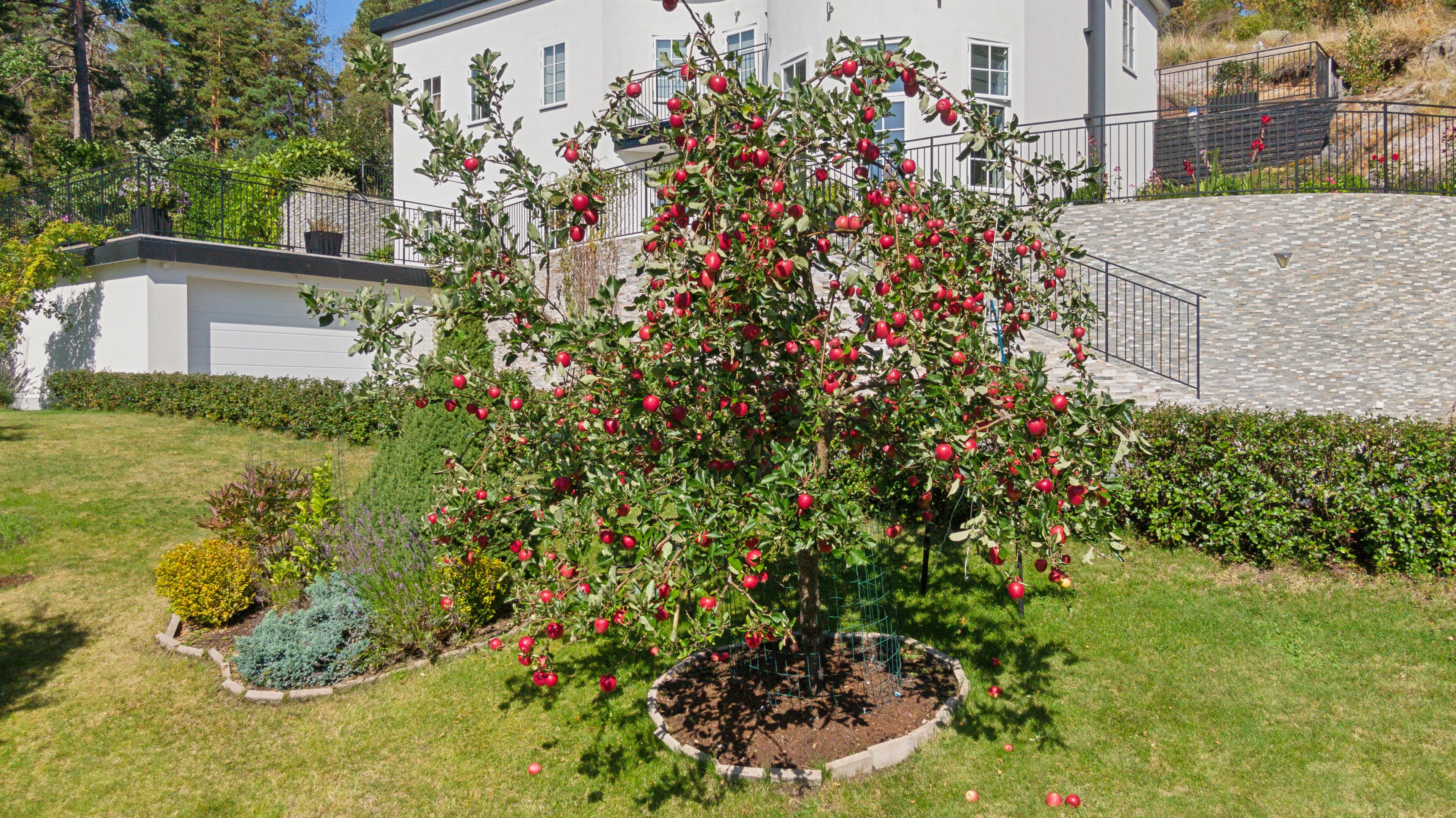 Tomten har planerats med stor omsorg och bilderna talar för sig själva. Den asfalterade uppfarten är fint utformad och fungerar bra sommar som vinter. Stilfulla stenlagda ytor som lirar i harmoni med villan. På den övre delen i anslutning till den stora altanen finns en gräsyta om man vill lira lite fotboll, spela kubb eller varför inte sätta upp ett badmintonnät. Ett växthus skapar möjligheter för dig som tycker om att plantera egna grönsaker. Växtligheten består av äppelträd, bigarråträd, persikoträd, körsbärsträd, svart vinbärsbuske, röd vinbärsbuske, krusbärsbuske, björnbärsbuske, hallonbuske, flera rosbuskar, massor av rhododendron, vindruvsrankor, jordgubbsplantor i lådor, japansk lönn, ölandstokar, marktäckande rosor, trädgårdstall, trädgårdsenar, krypande oxbärsbuskar, tujahäckar, oxbärshäckar och silverregn. Stenlagd trappa upp till villan som övergår i en stor stenlagd framsida intill villan. Allt väldigt vackert planerat för att skapa en härlig balans och behålla den privata sfären.