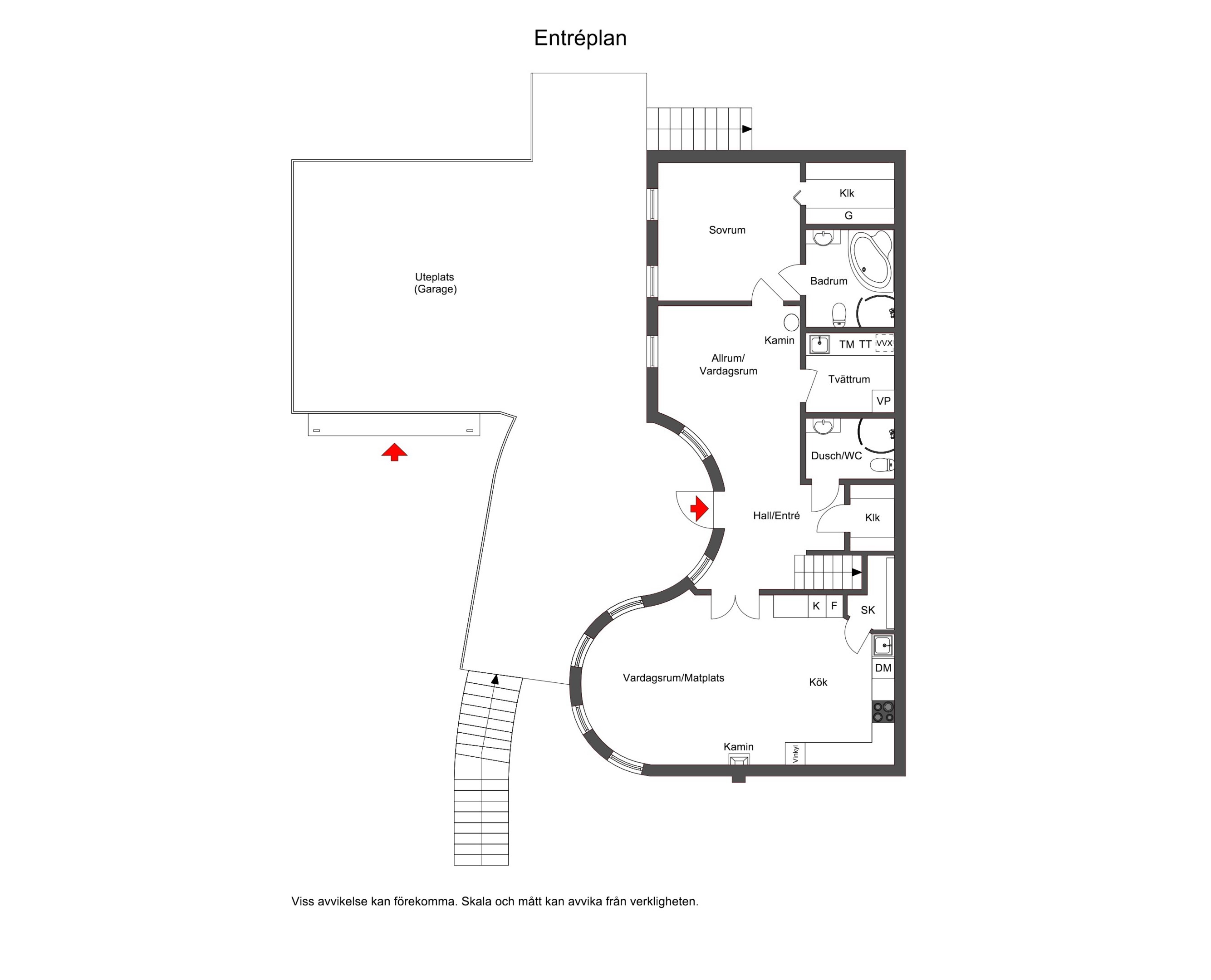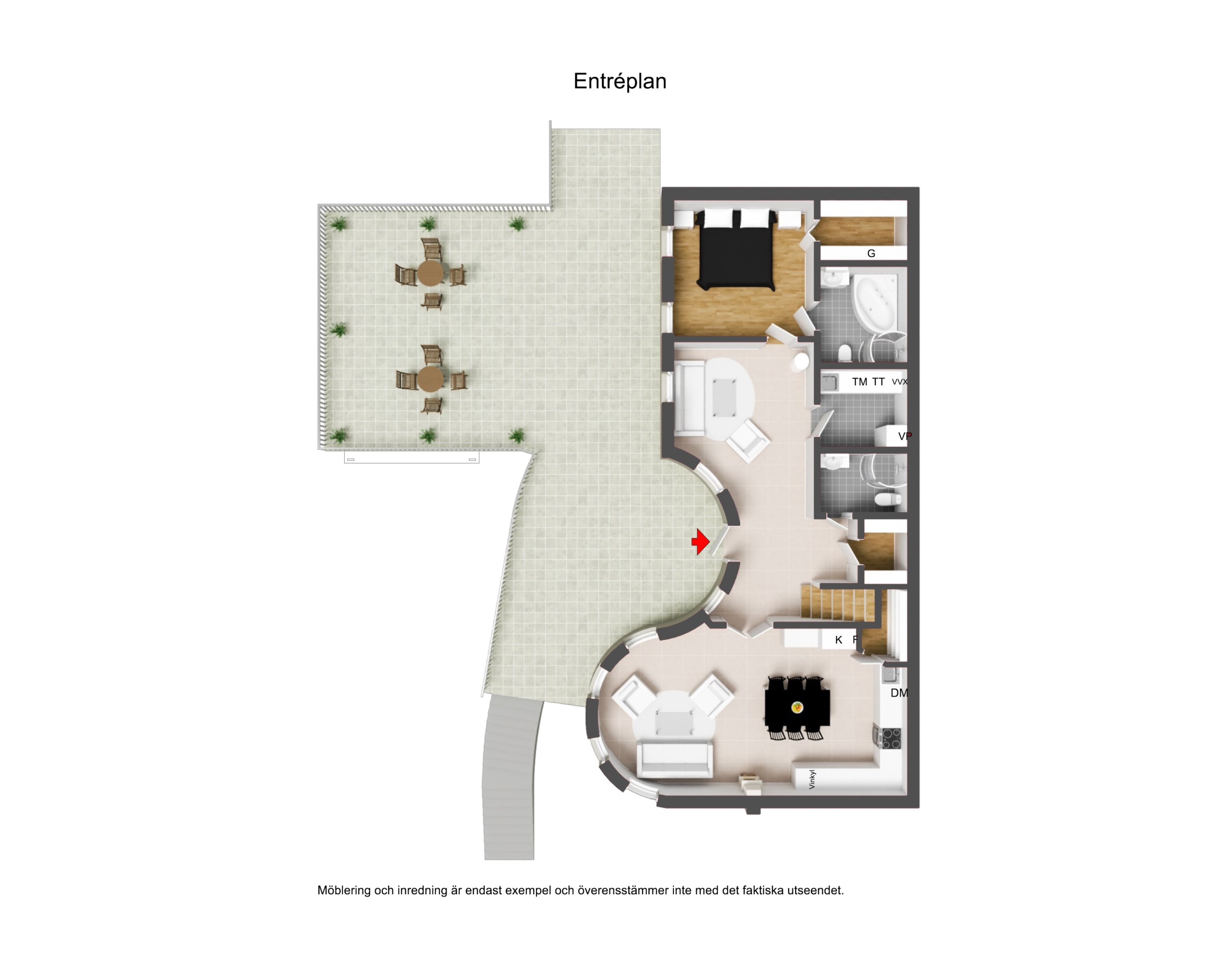 I anslutning till framsidan som är stenlagd finns en stor uteplats som sträcker sig över dubbelgaraget. Gott om plats för utemöbler i dess soliga söderläge.