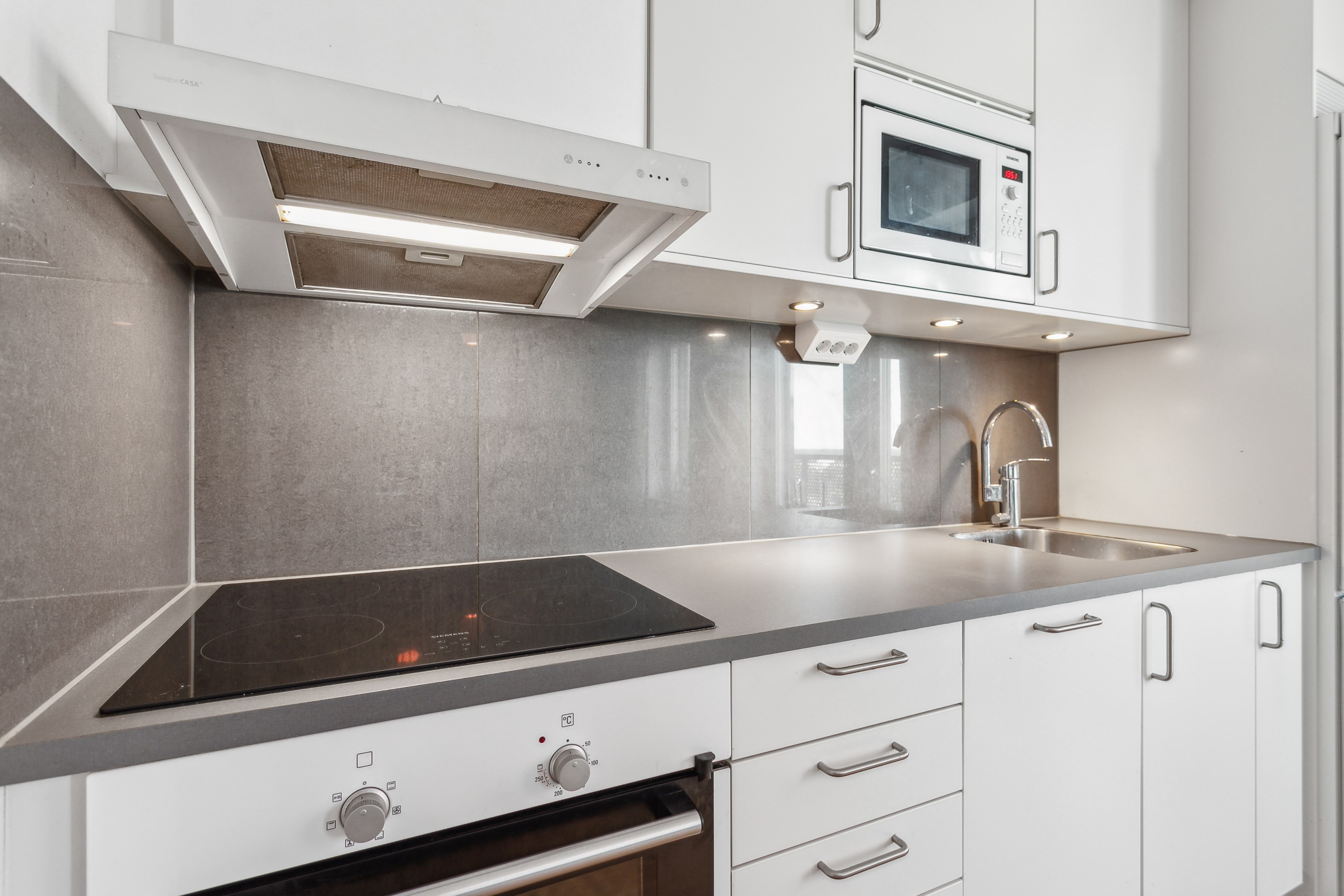 Allrummet rymmer lätt en stor säng, soffa, mediamöbel och då det är en öppen planlösning mot köket finns det även plats för matbord. Via balkongdörren så når man den stora balkongen om ca 7 m² med sol från kl 14. Köket är från Marbodal med praktisk förvaring, induktionshäll, spisfläkt, kyl/frys, inbyggnadsugn samt inbyggnadsmikro. Rejäl enkelho och matchande kakel som fungerar som stänkskydd. Infälld belysning i överskåpen ger bra arbetsbelysning. Ekparkettgolv samt vitmålade väggar.