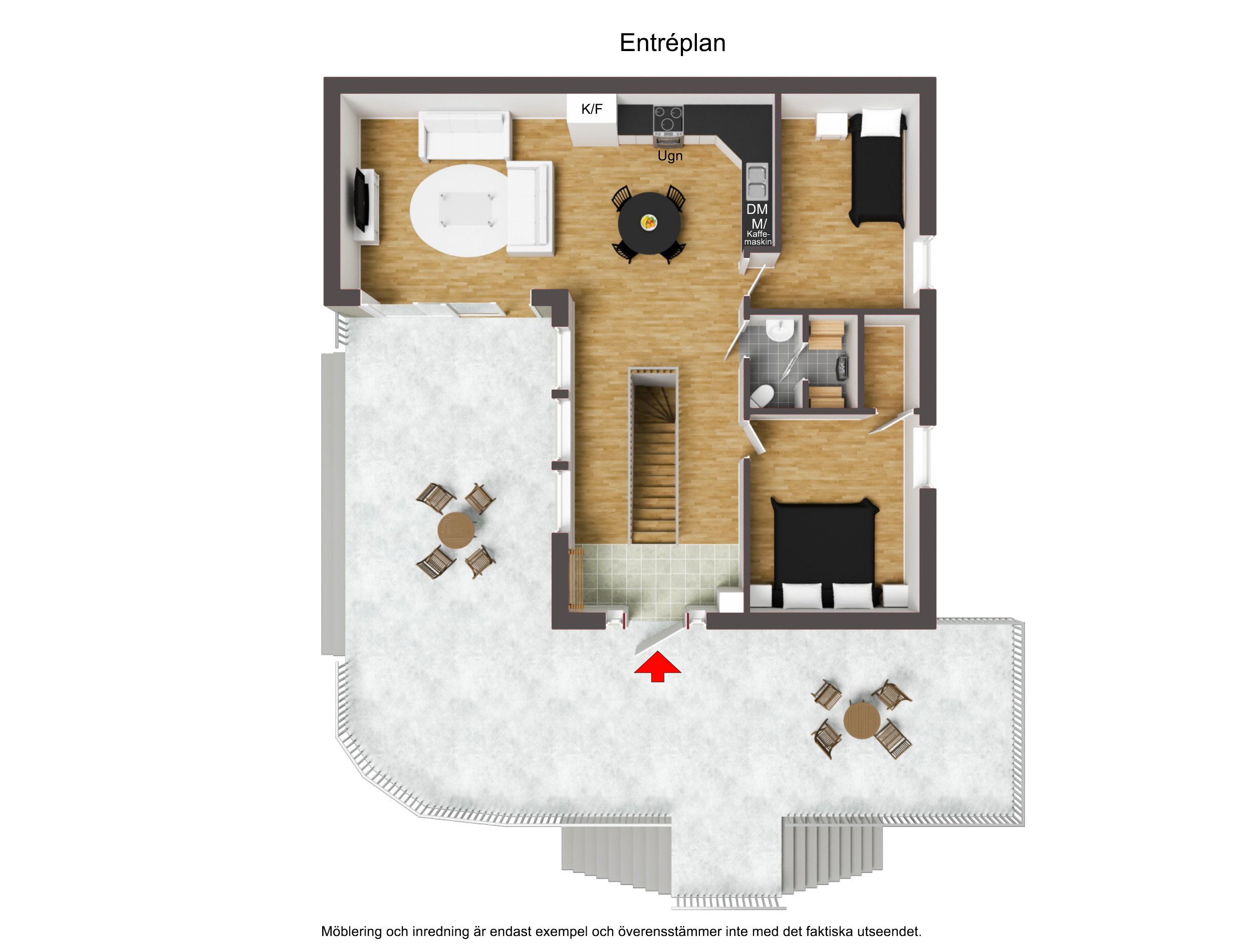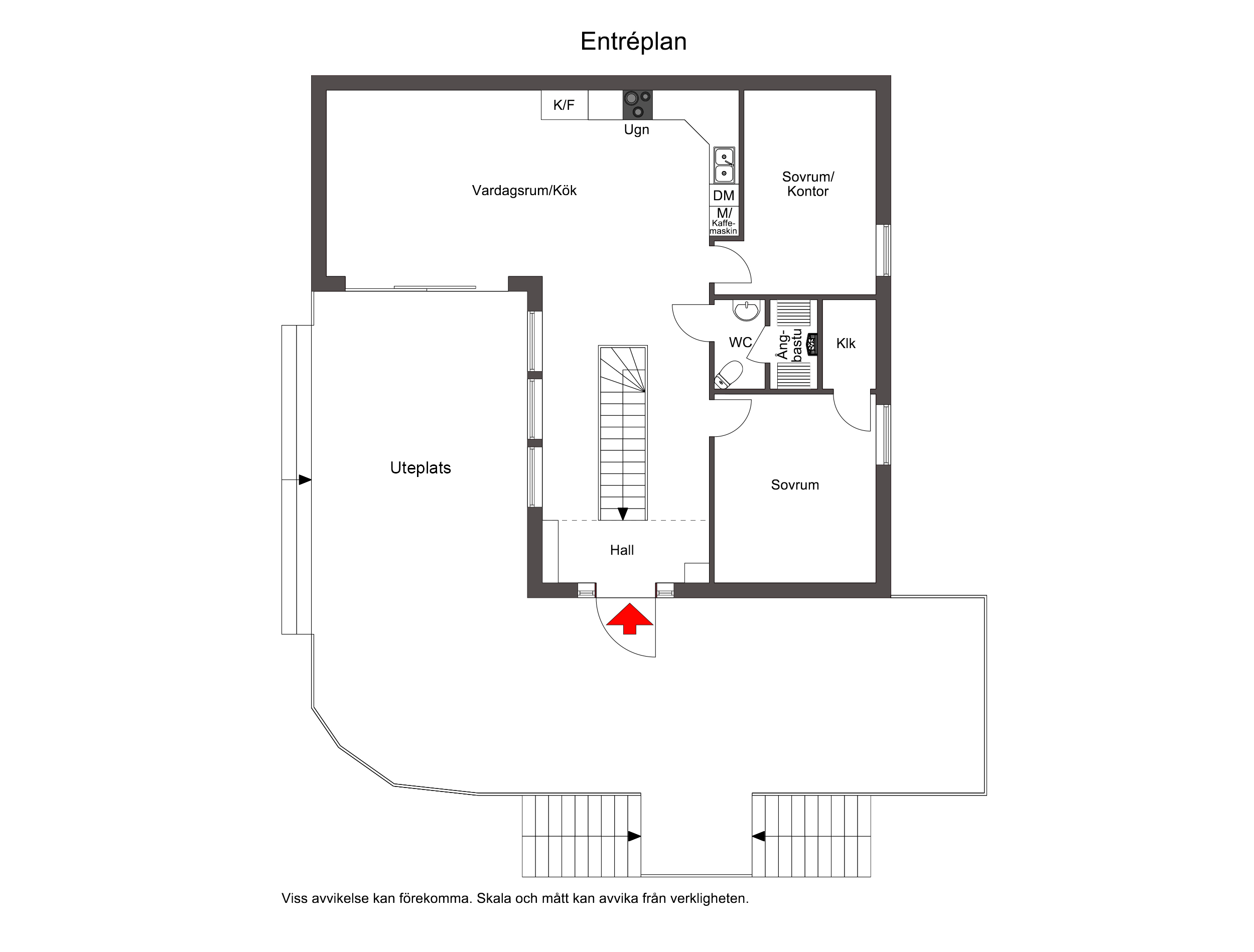 Ljus öppen entré med bra avhängningsyta direkt till vänster. Ljust klinkergolv med golvvärme som övergår till enstavigt askparkettgolv. Stora fönsterpartier i olika väderstreck genererar härligt ljusinsläpp och den generösa takhöjden skapar härlig rymd. Infällda spotlights i tak (LED) samt högtalare. Vitmålade väggar och trappa ner till nedre plan.