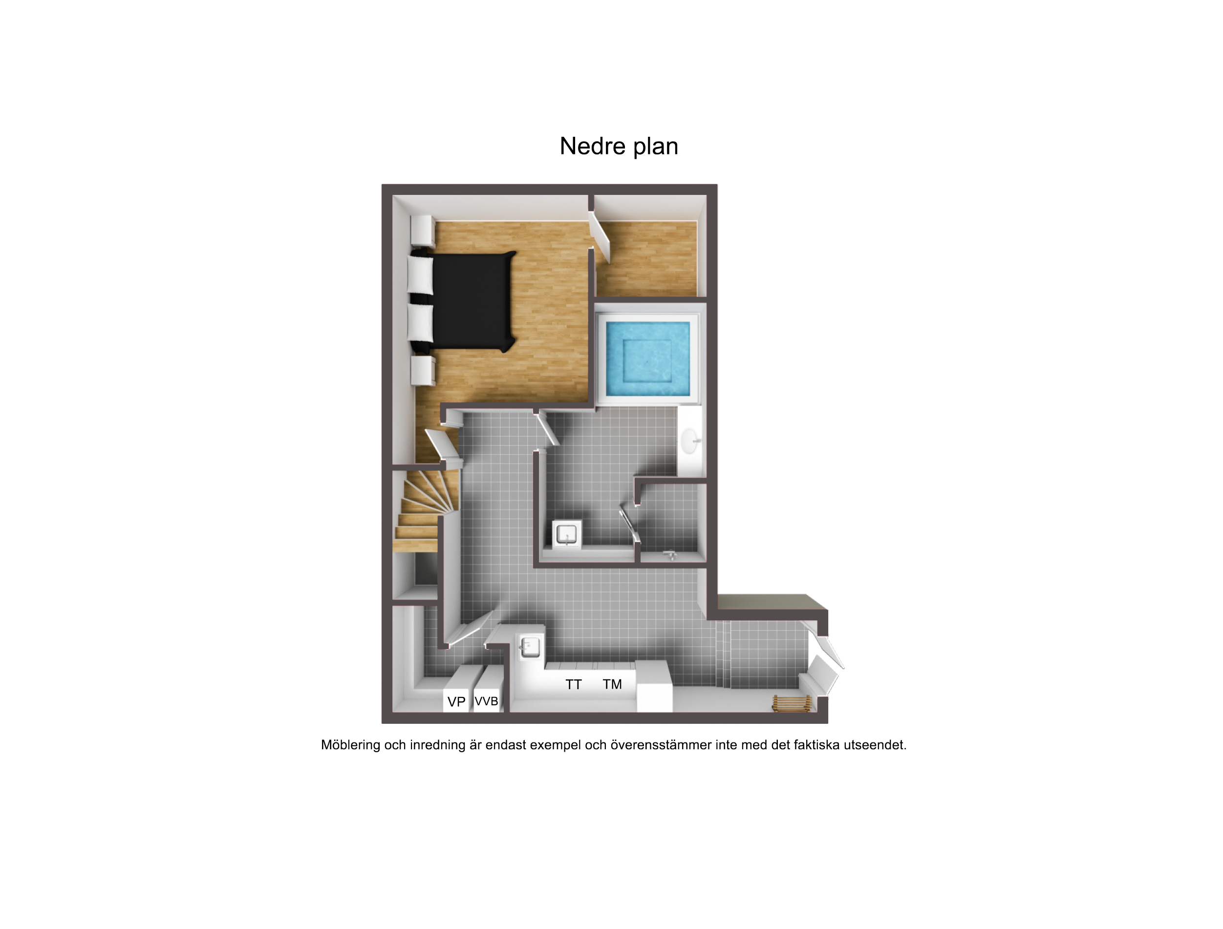 Här ansluter trappan från entréplan. Fint granitkeramikgolv med vattenburen golvvärme, målade väggar samt spotlights i tak (LED). Sammankopplar de flesta delar av nedre plan.
