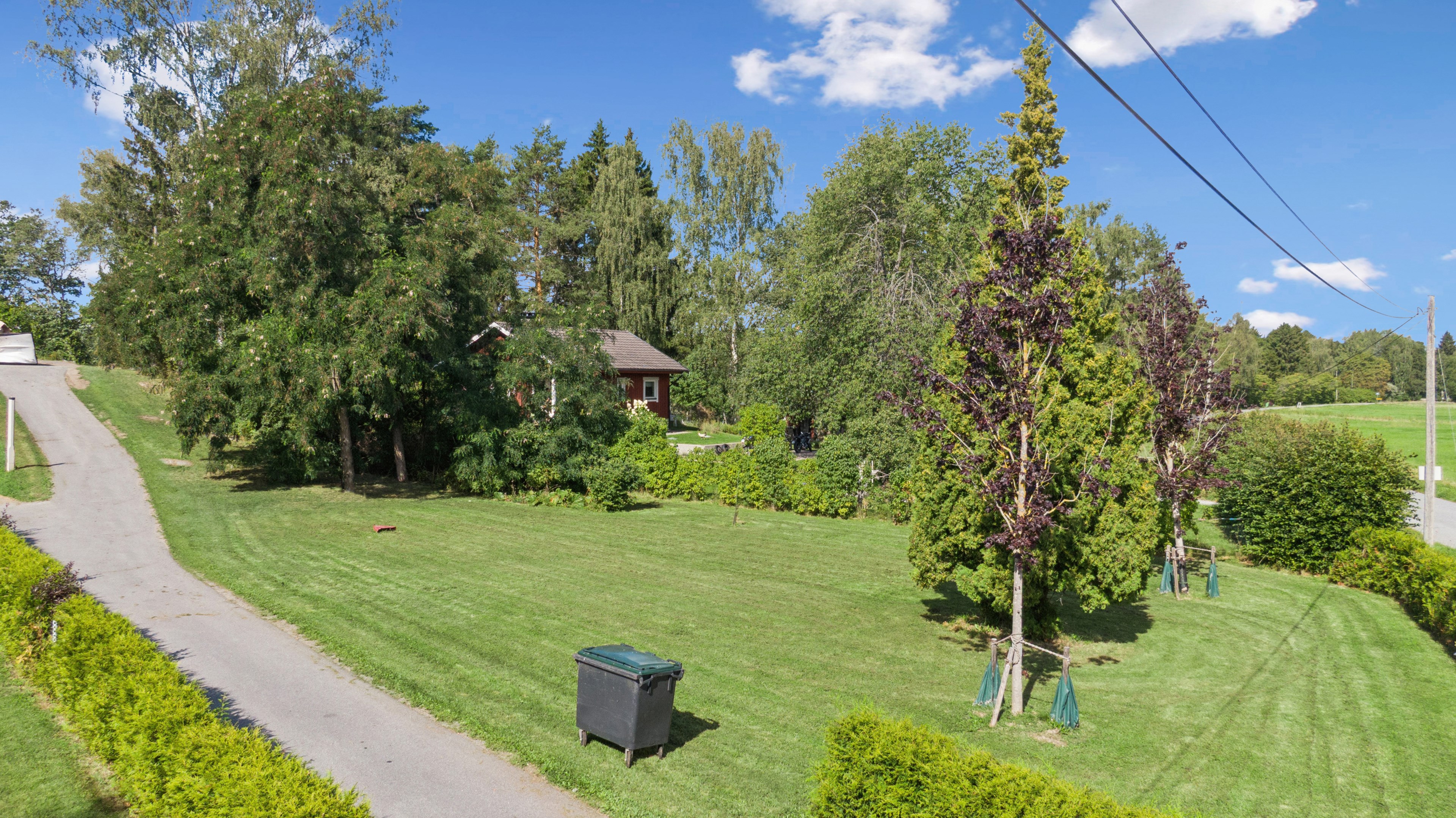 Tomten är till stora delar plan med villan placerad på en platå på tomtens högsta punkt. Detta gör att villan har massor av härligt ljusinsläpp samtidigt som läget är väldigt privat. Asfalterad uppfart upp till villan och till vänster innan villan finns en grusad uppställningsplats för ytterligare fordon. Massor av fin växtlighet ramar in fastigheten på ett tilltalande sätt.