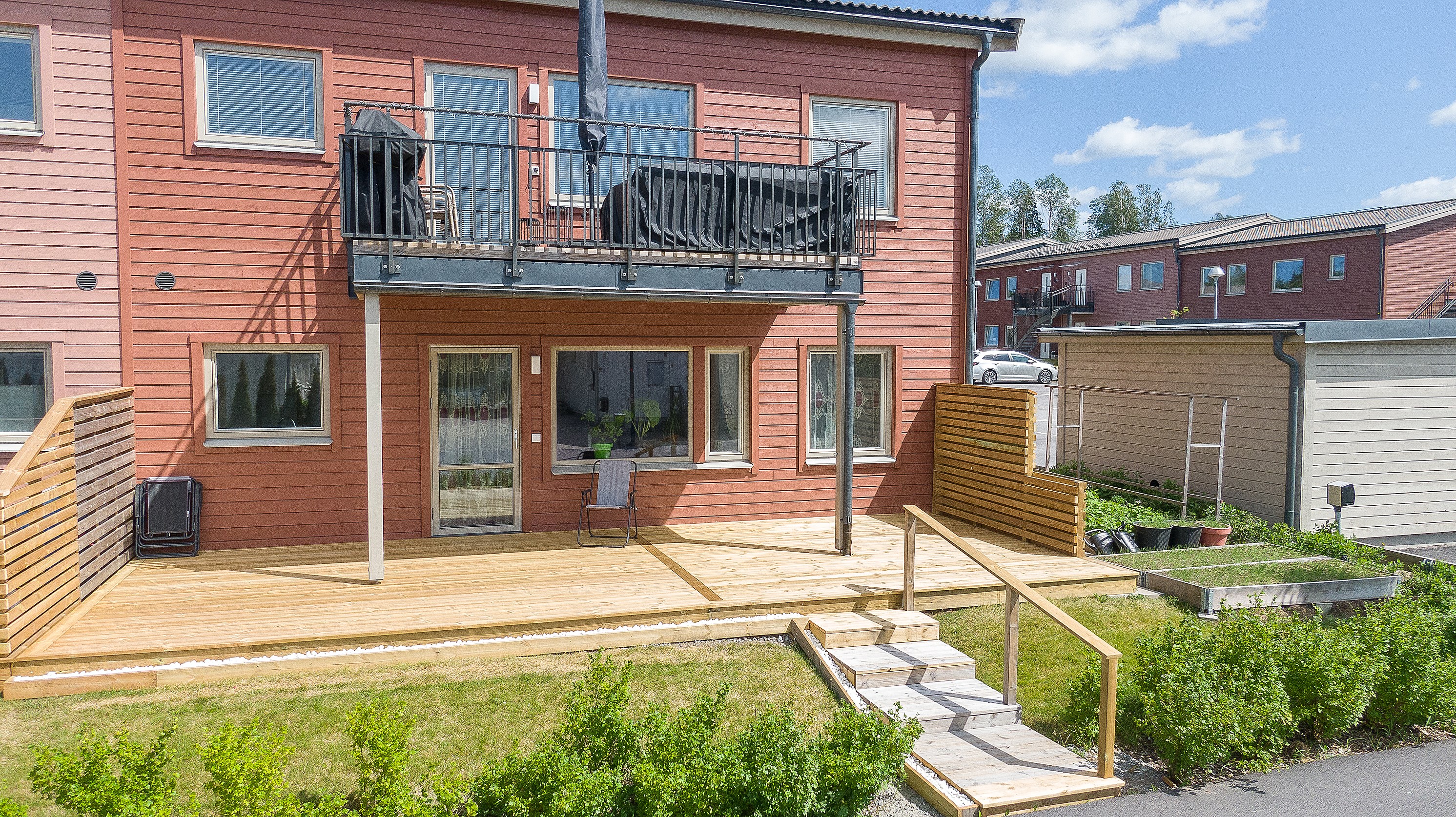 Via en altandörr i helglas nås denna trivsamma uteplats med gott om plats för utemöbler samt grillen. På vardera sida finns flertalet planteringslådor som underlättar odling av egna växter eller grönsaker.