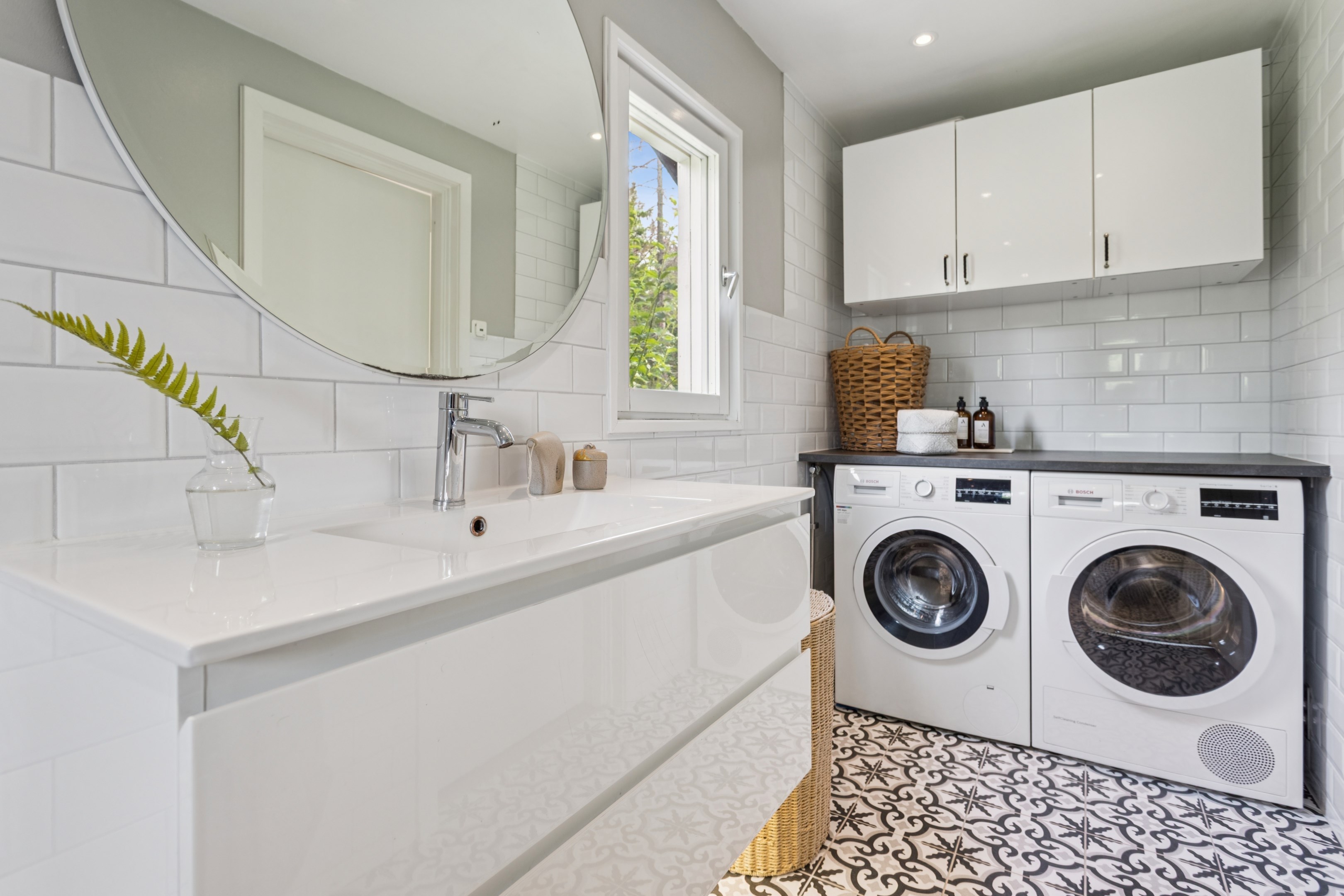 Ganska stor del med fönster i två olika väderstreck. Här finns en tvättavdelning med tvättmaskin, torktumlare samt bänkyta och väggskåp ovan. Takduschen finns bakom en glasvägg och här finns även WC, stor kommod med handfat och underskåp samt en jättestor spegel ovan. Kvalitetsdokument ska finnas.