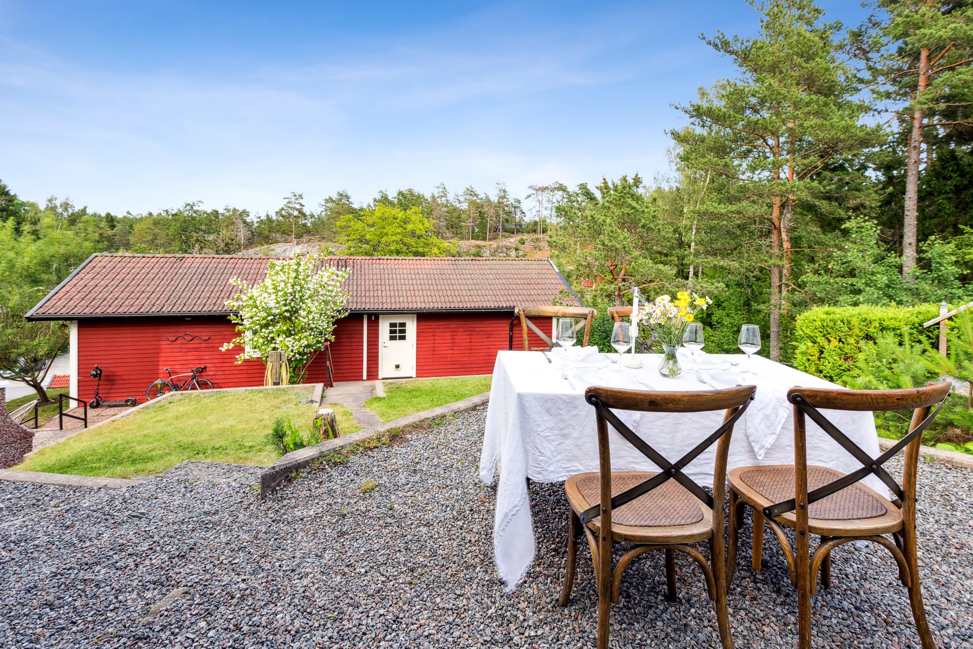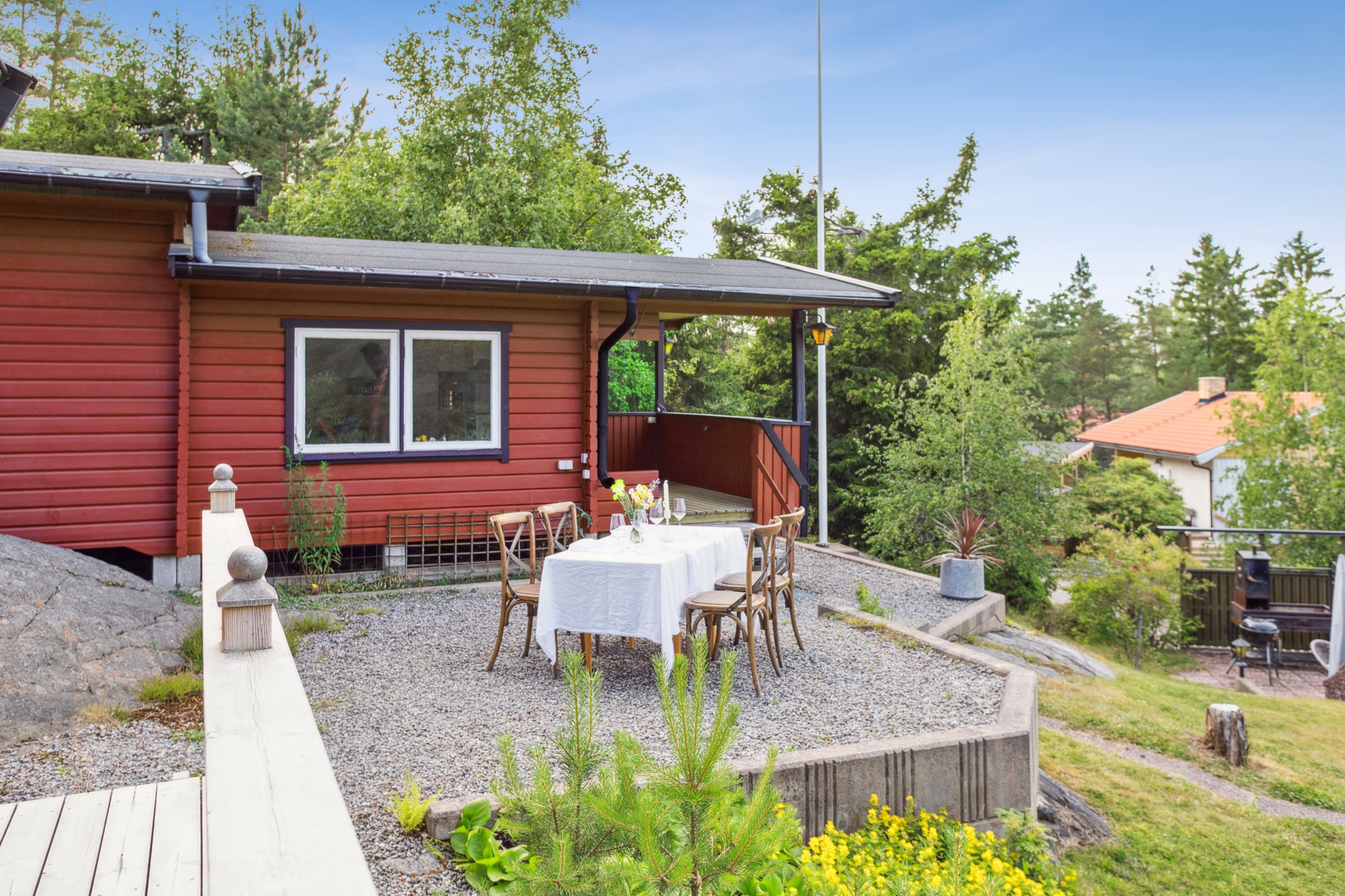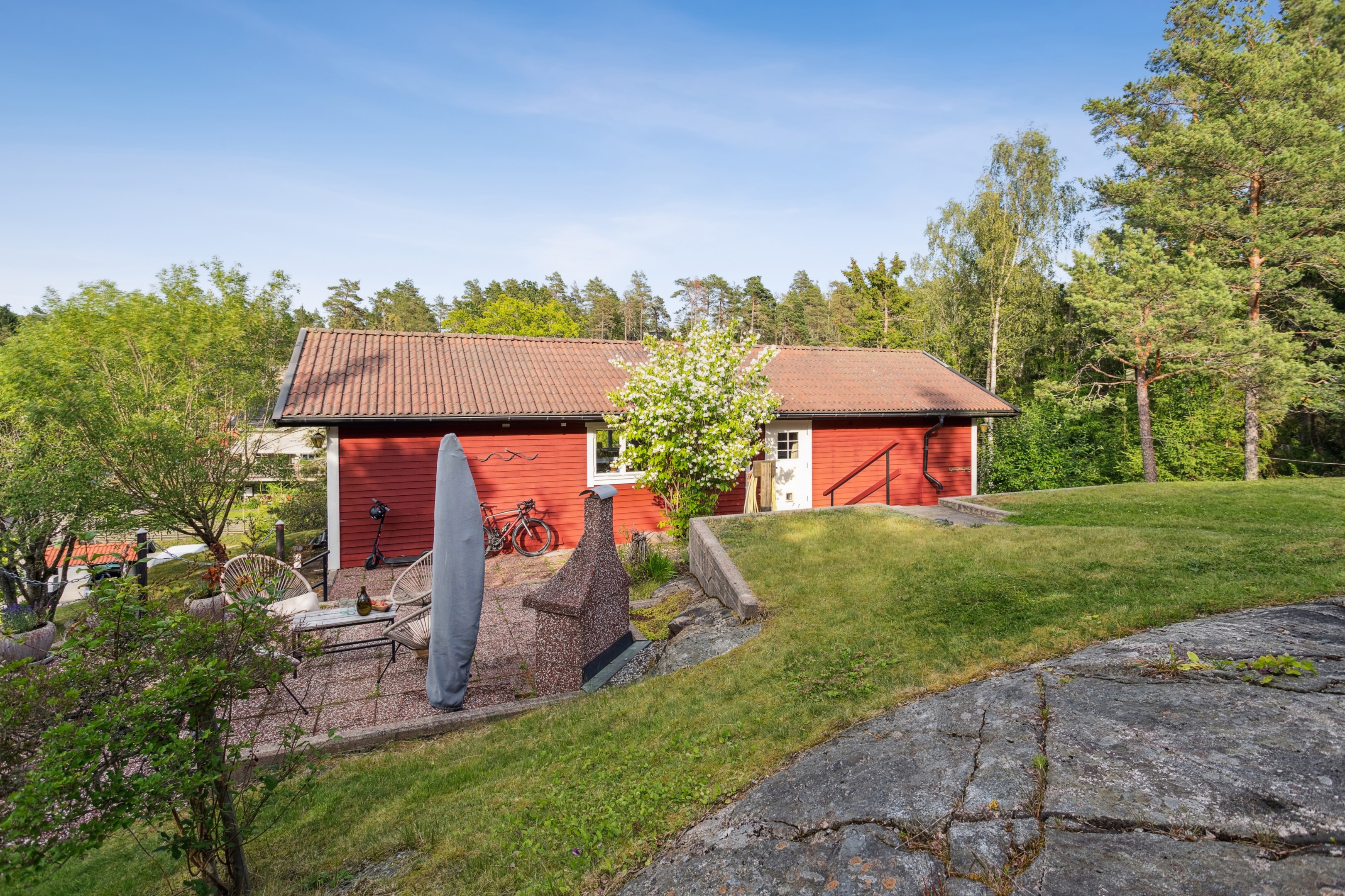 Längst ner vid Rakstavägen finns det bilplatser samt en badmintonplan. Själva huskropparna nås via stenplattor som bildar en trappa vilket gör att det blir ett väldigt privat läge med massor av sol. Tomten ramas in fint av lummig natur.