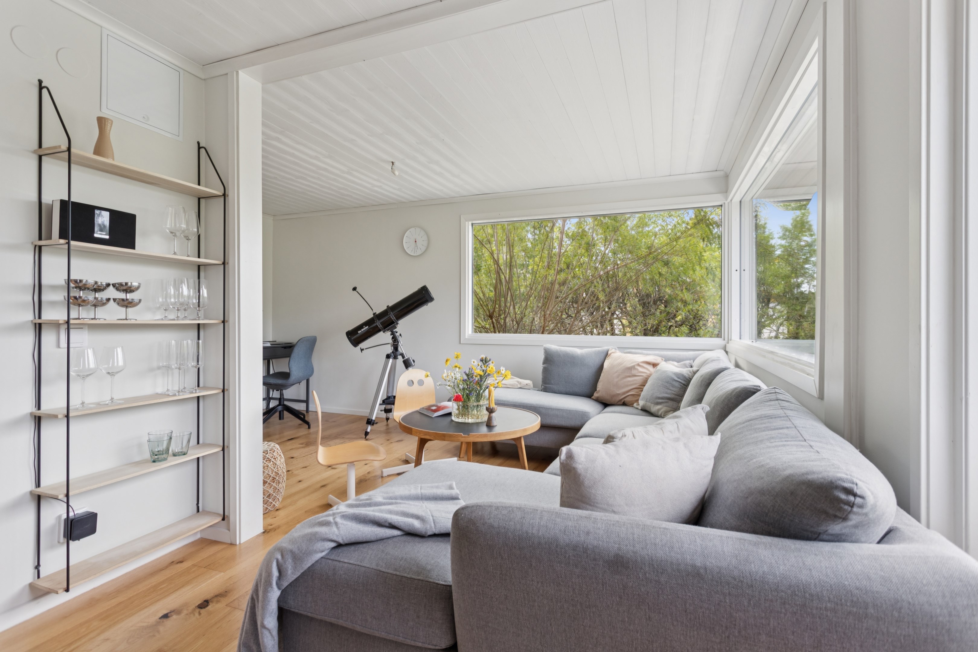 Vardagsrum med stora fönsterpartier