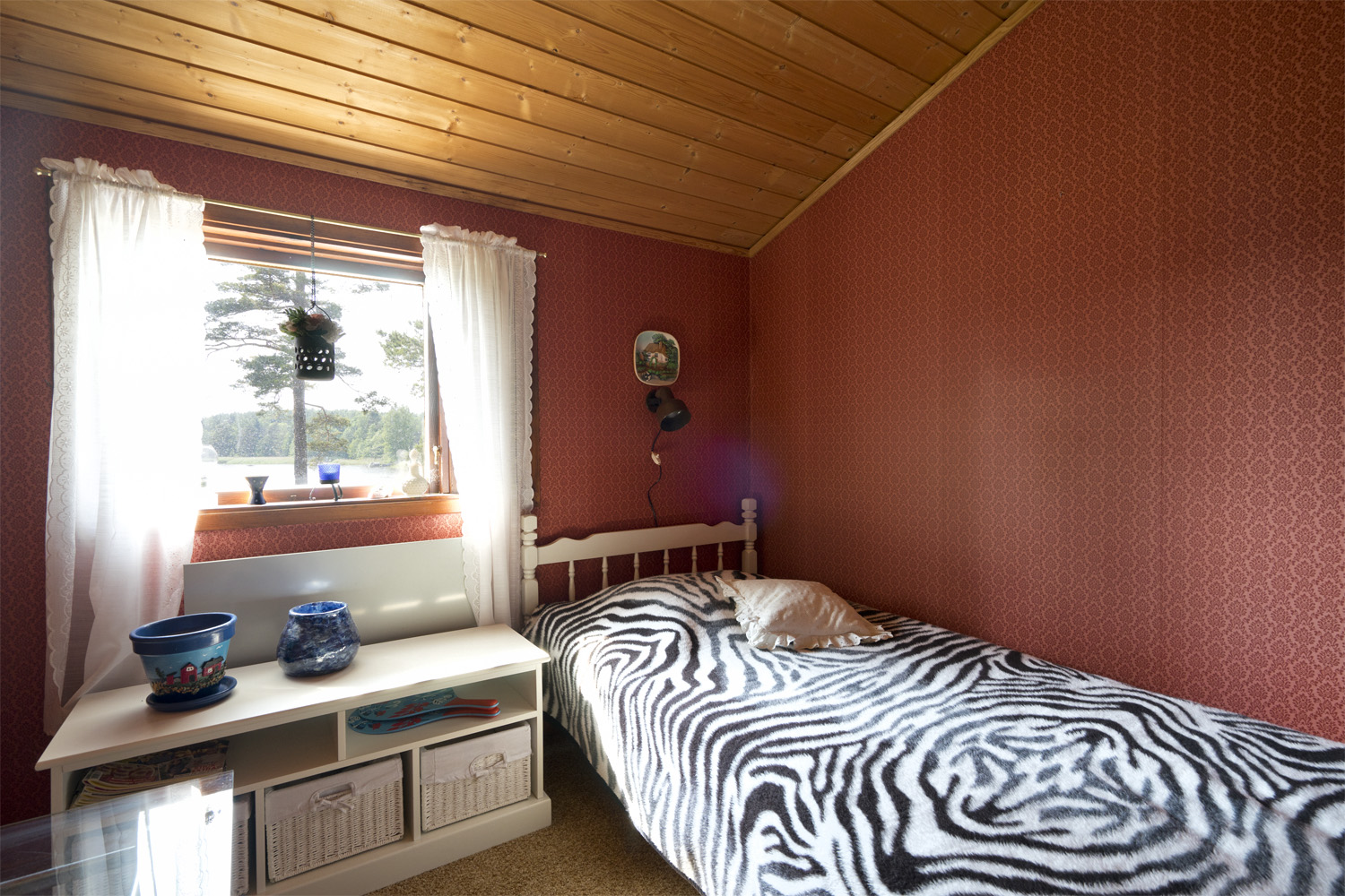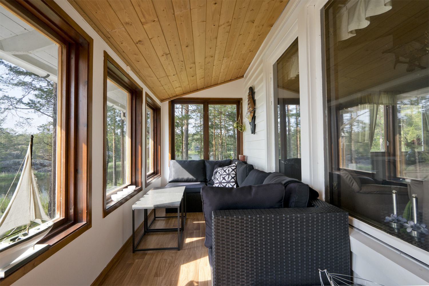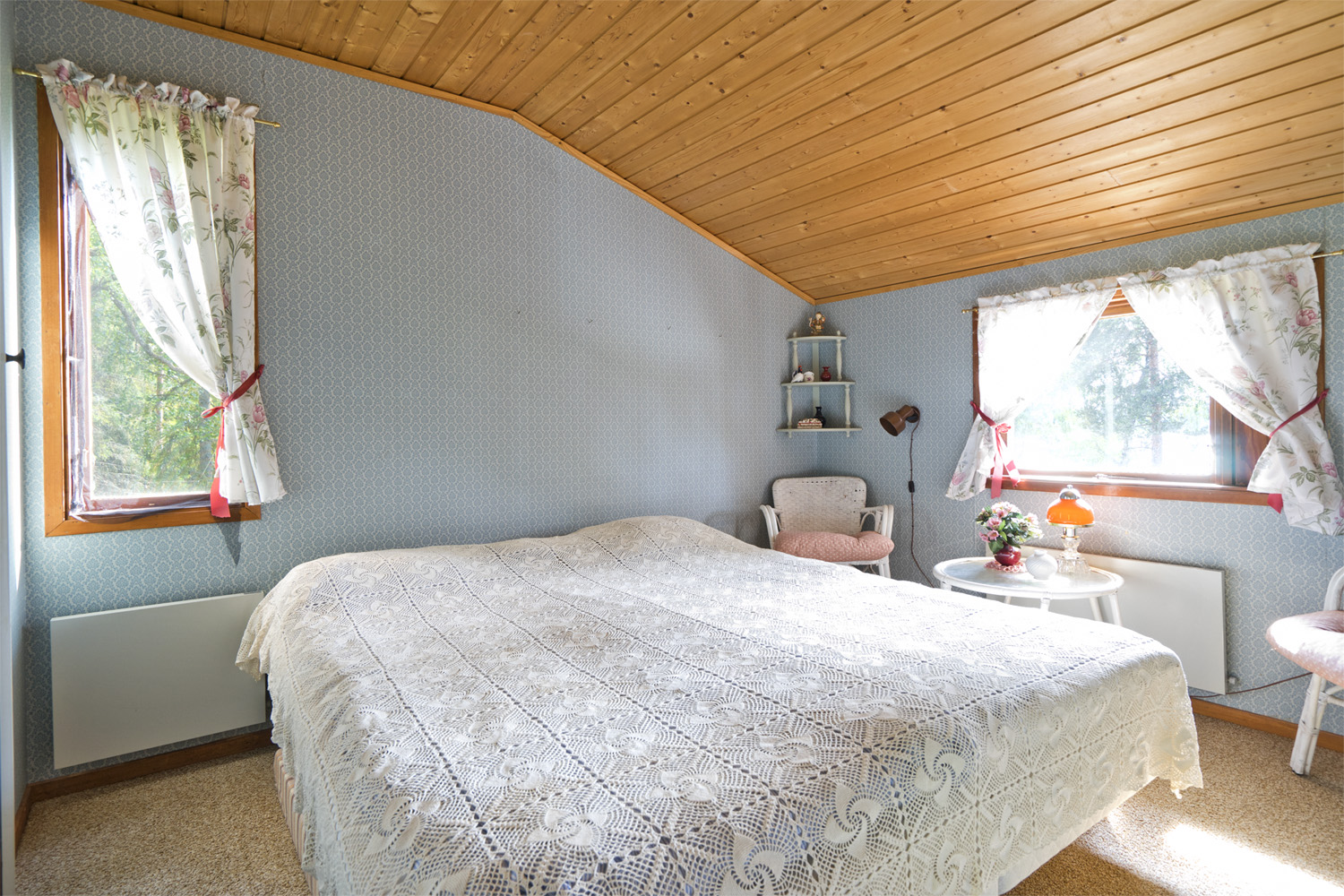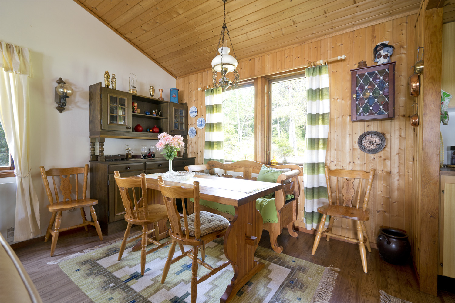 Inglasad veranda med eldstad och utgång till uteplats samt trädgård. Allrum med eldstad och fönster i tre väderstreck, öppet till nock. Gott om plats för både sitt- samt matgrupp. Arbetskök med direktutgång till bakre entrén. Nya vitvaror och spis sedan fem år. Badrum med mulltoa, handfat, duschkabin samt varmvattenberedare. Tre fristående sovrum.