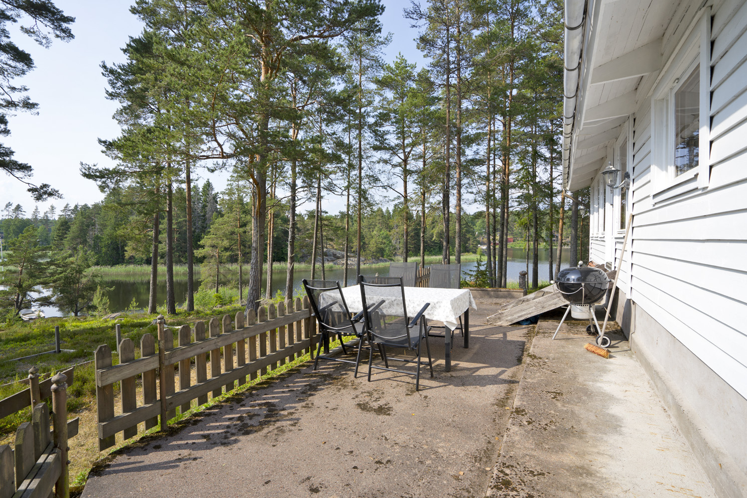 Stor uteplats på betonggrund intill bostadshuset. Uteplats på äldre husgrund nära vattnet och bryggan.