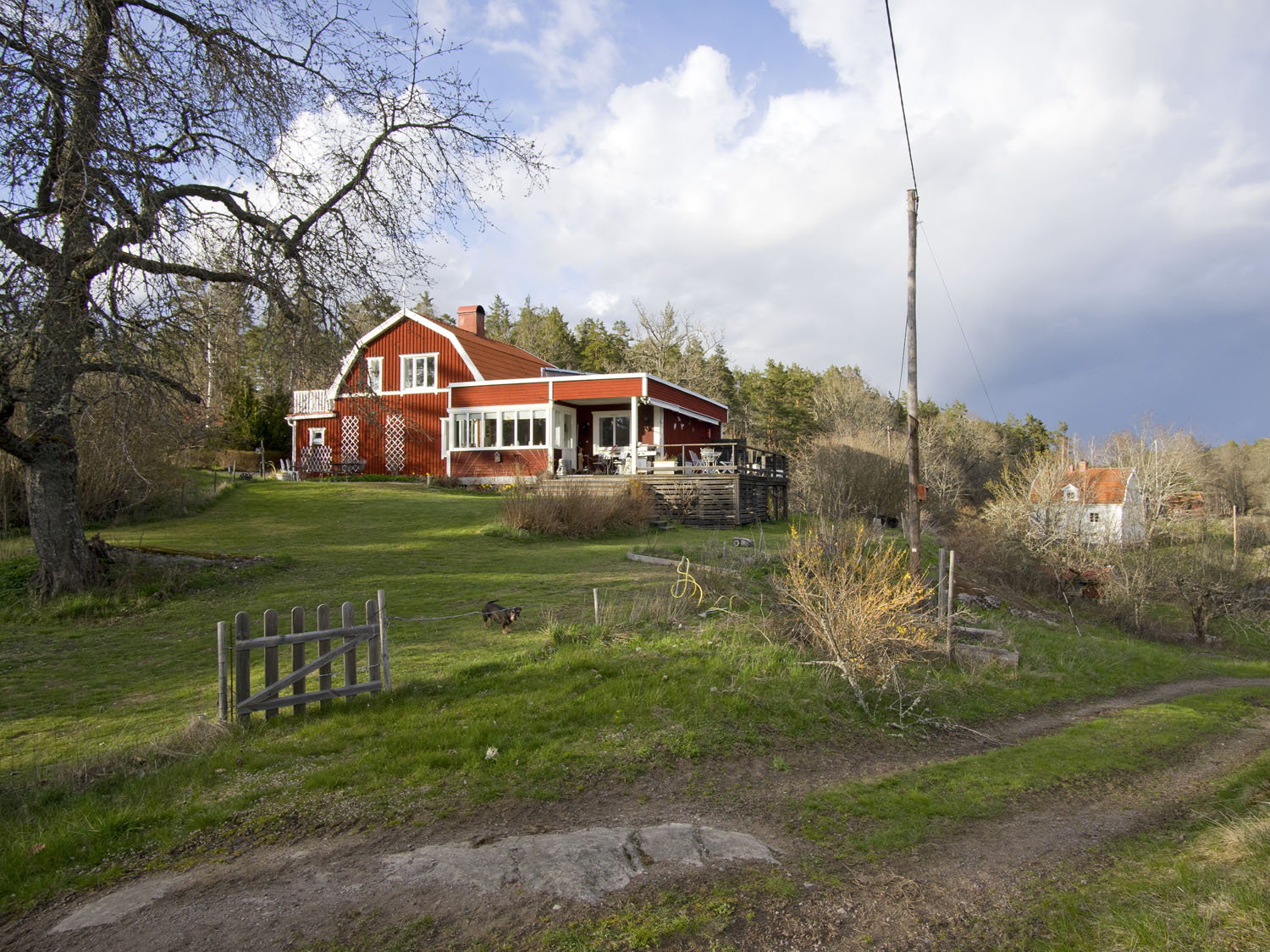 Från Gunnebo kör mot Västrum 8.9km, sväng höger mot Slingsö 4.6km. Stort rött hus vid korsning vänster sida ner mot havet !