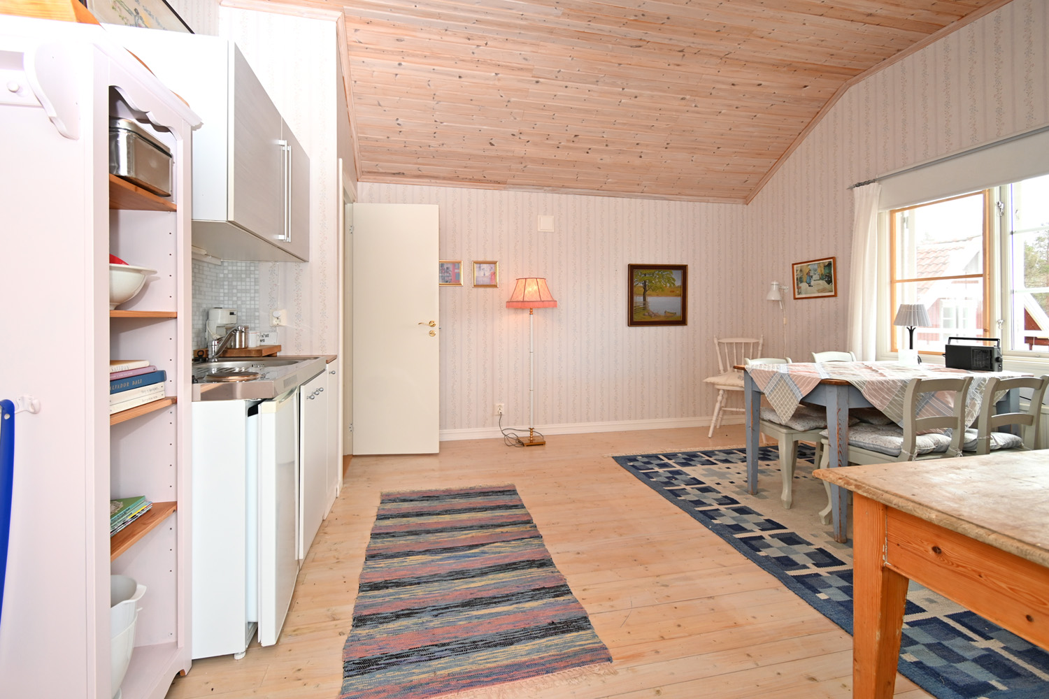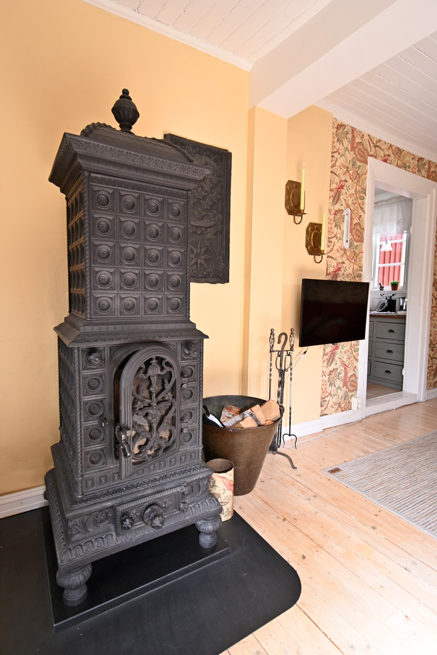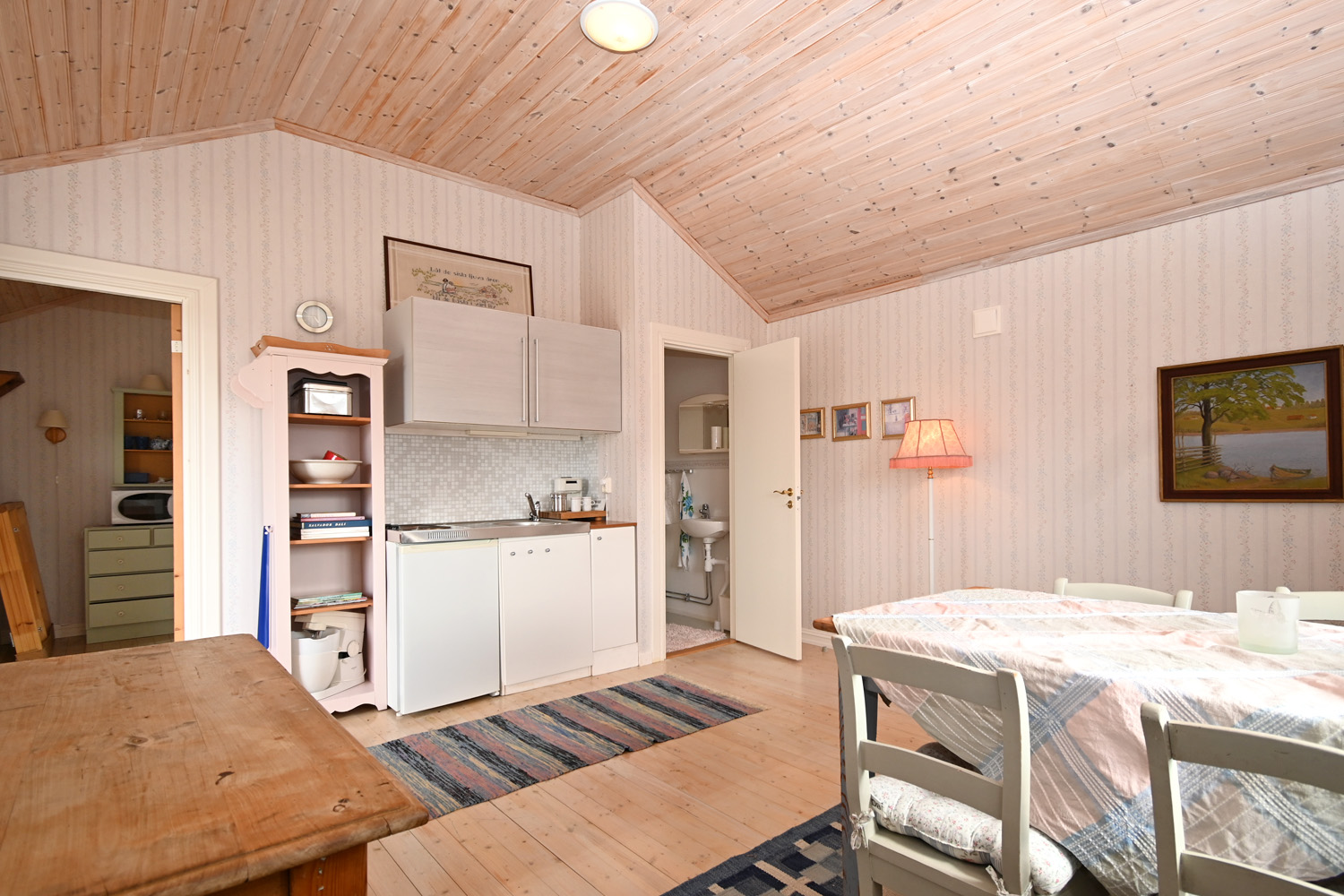 HUVUDBYGGNAD (4 rum varav 2 sovrum, boarea 110 kvm, biarea 7 kvm ): Plan 1: Ljust trevligt lantligt kök, här finns en äldre genuin vedspis med bakugn. Spis, fläkt, kyl/frys. På väggar är det bröstpanel + målat samt klinkersliknande plattor på golv. Via köket når du allrum och hall, samtliga med vackra trägolv och vedkaminer. Badrum med wc , tvättställ, tvättmaskin, diskmaskin, handduksvärmare, varmvattenberedera och pump. Plan 2: Allrum med sovalkover, golvet är ett ljust målat plankgolv och väggarna är tapetserade. Sovrum med ett härligt mörkt plankgolv, bröstpanel & tapet på väggar och fönster mot trädgården. Sovrum med ljust målat plankgolv och tapetserade väggar, platsbyggd förvaring och fönster mot trädgården. -Stor altan med elstyrd markis. -Fjärrstyrd på-avstängning av värmeelementen i huvudbyggnaden via Telia. - Inventarier inkl. traktor, båt samt fyrhjuling ingår i priset.