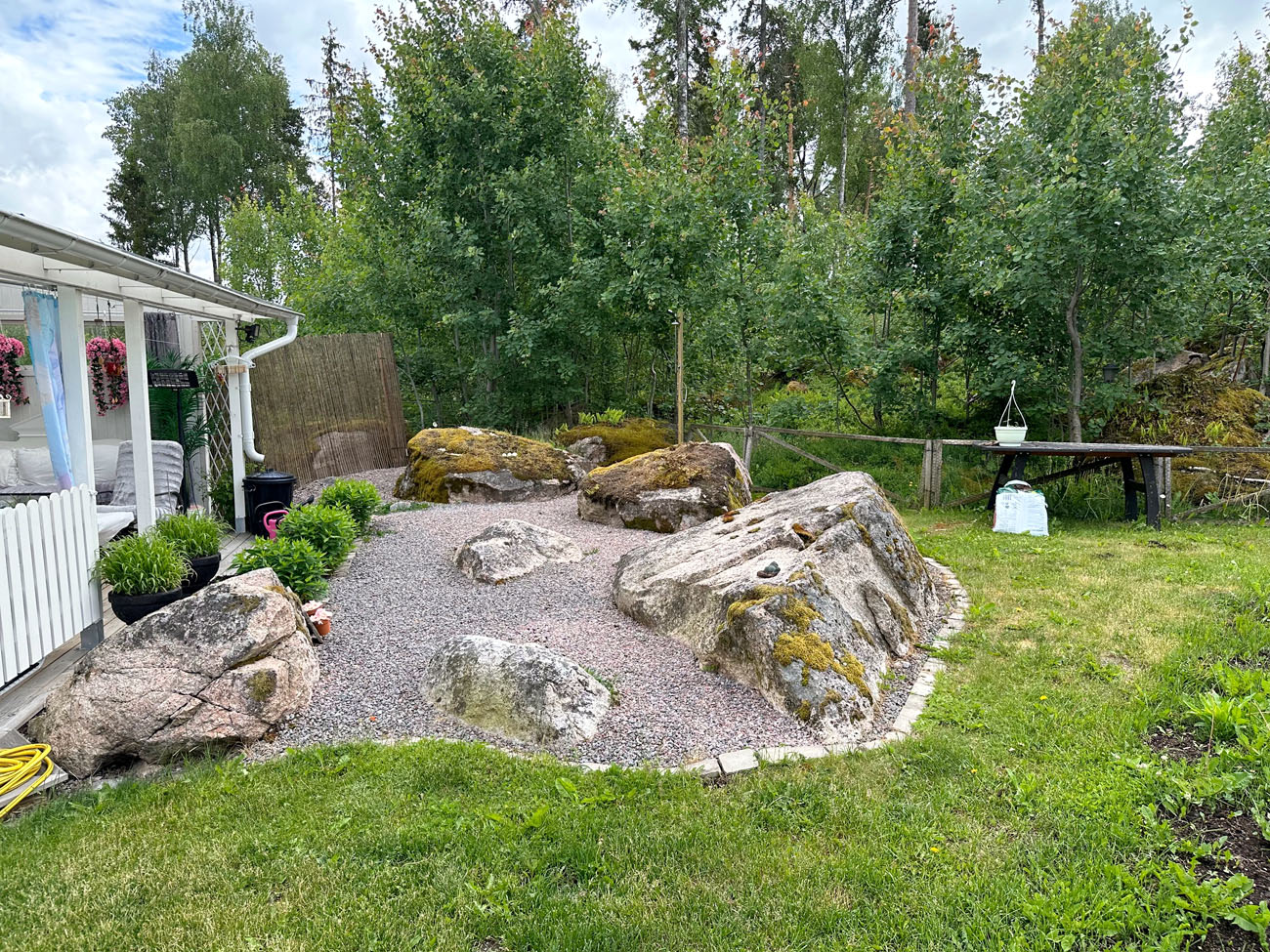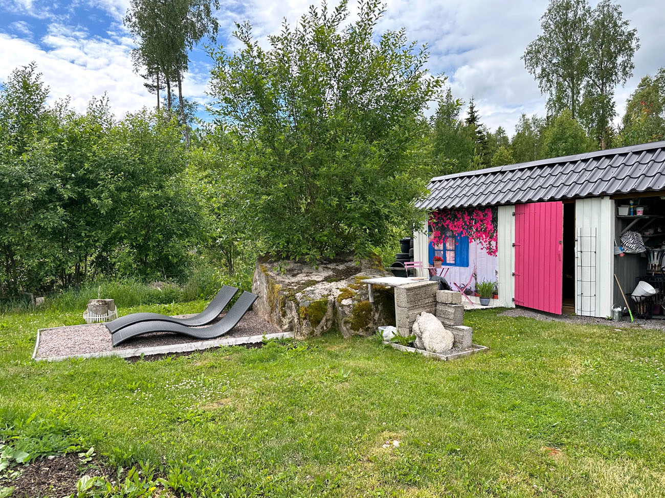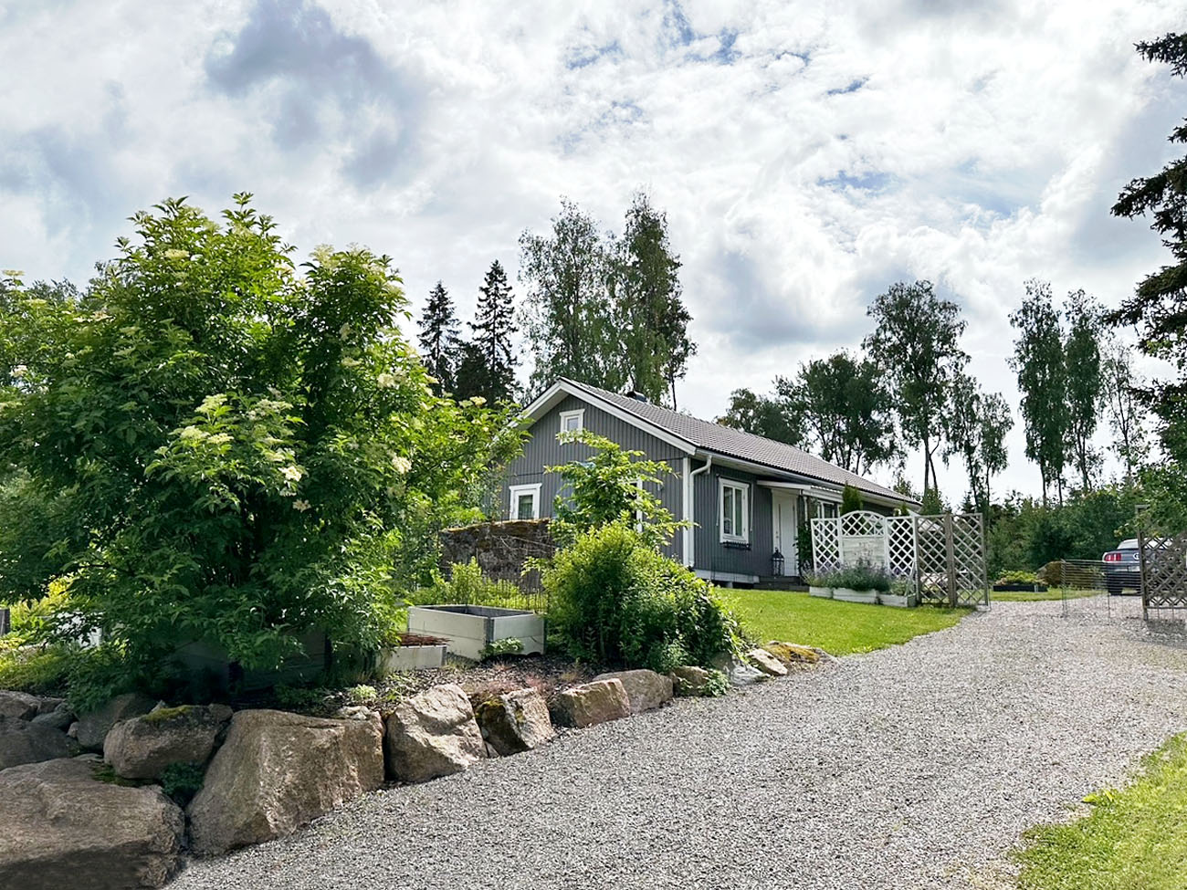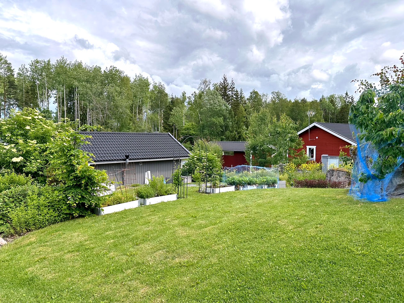 Trivsam tomt med grusuppfart upp till huset. Här finns en stor variation av växter med te.x. hallon, krusbär, jordgubbar, blåbär, fläder och körsbär.