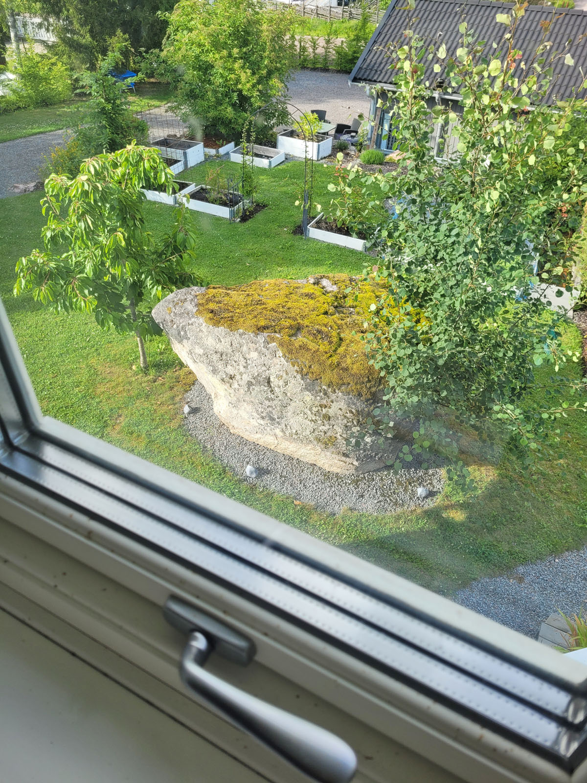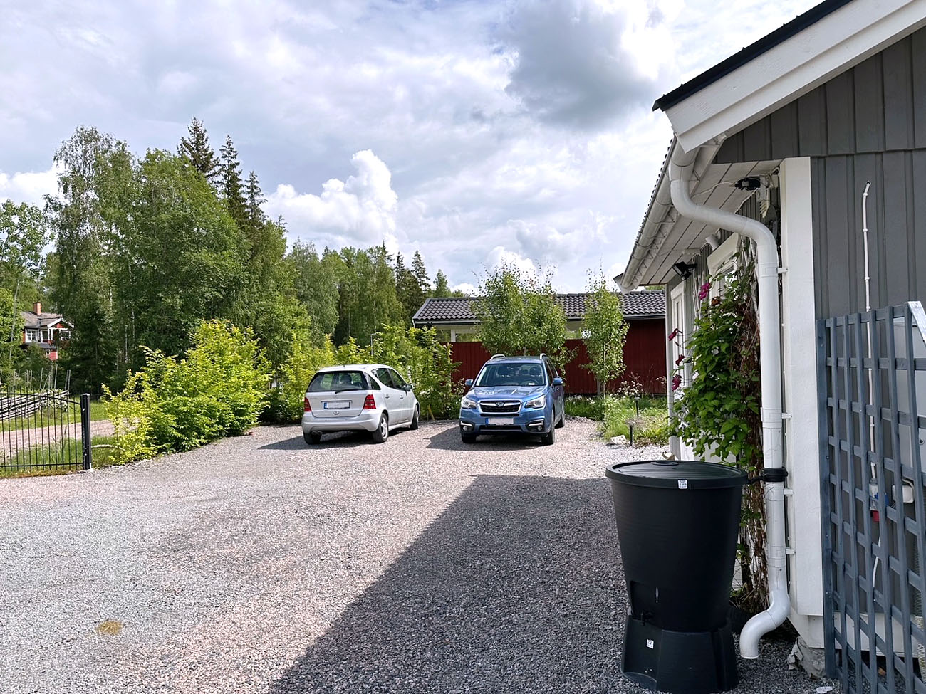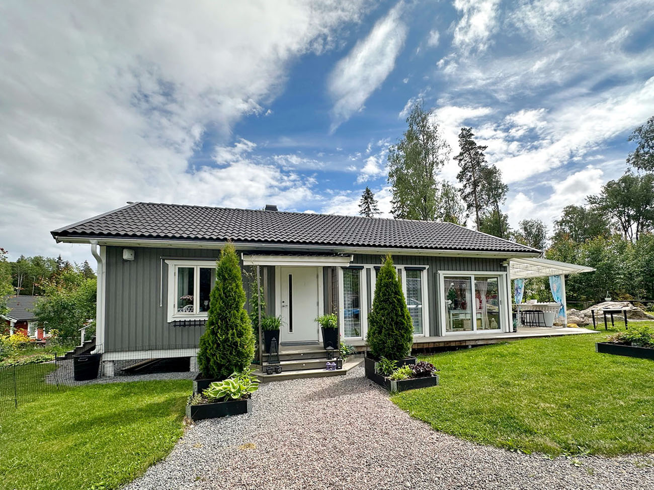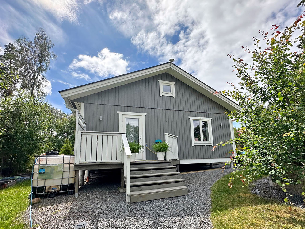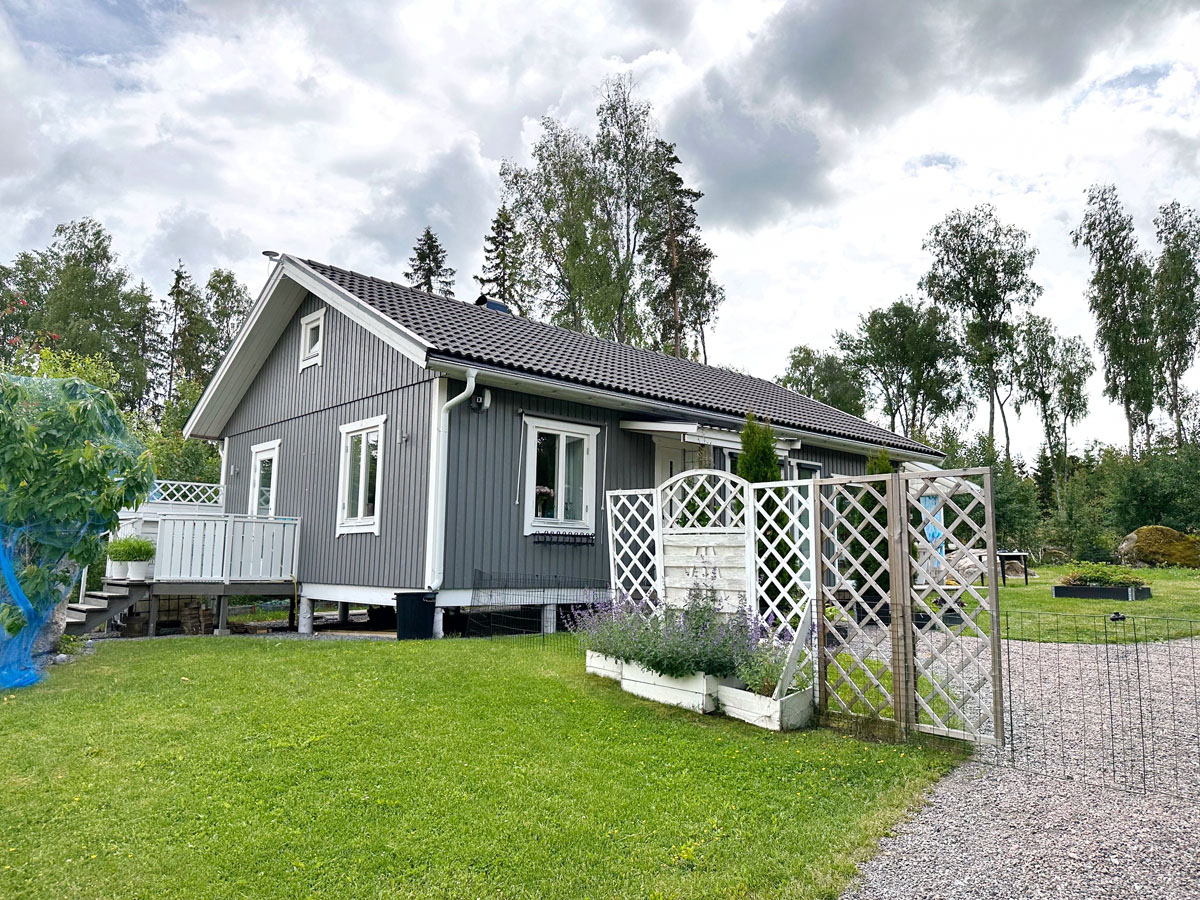 Trivsam tomt med grusuppfart upp till huset. Här finns en stor variation av växter med te.x. hallon, krusbär, jordgubbar, blåbär, fläder och körsbär.