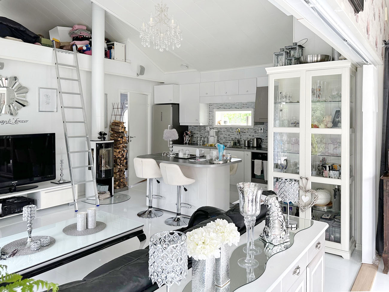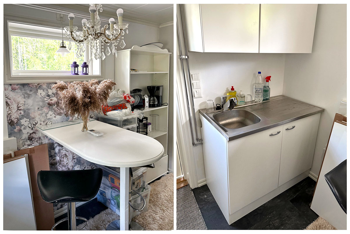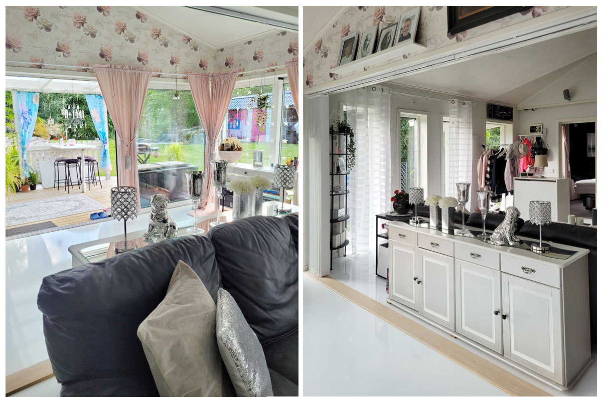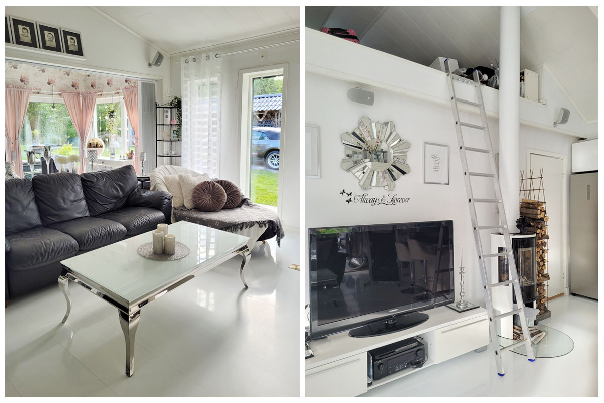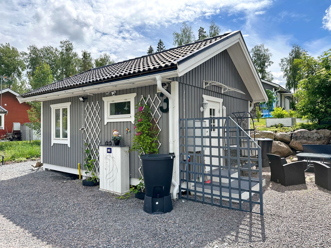 Modernt KÖK med köksö mot vardagsrummet. Utrustning med spis, ugn, fläkt, diskmaskin, kyl, frys. VARDAGSRUM/ALLRUM med braskamin och stege till sovloft, stora fönsterpartier mot altanen och trädgården. SOVLOFT som nås med stege. Litet fönster i gaveln och ca 1.50m under taknock. SOVRUM med utsikt mot trädgården, badrum en-suite. BADRUM med förbränningtoalett, tvättställ, dusch, varmvattenberedare och tvättmaskin. Kakel och klinker. Ingång från trädgården.