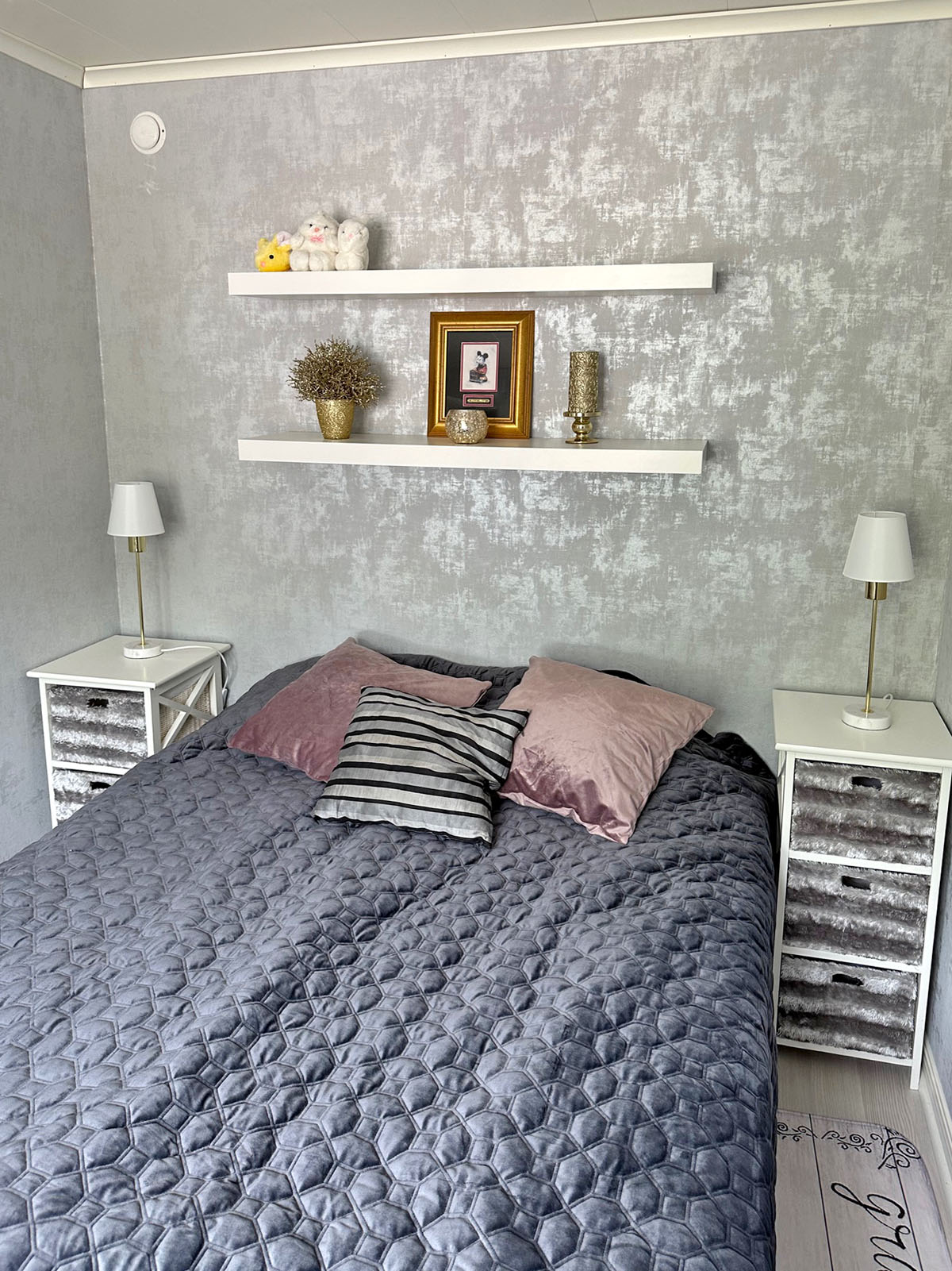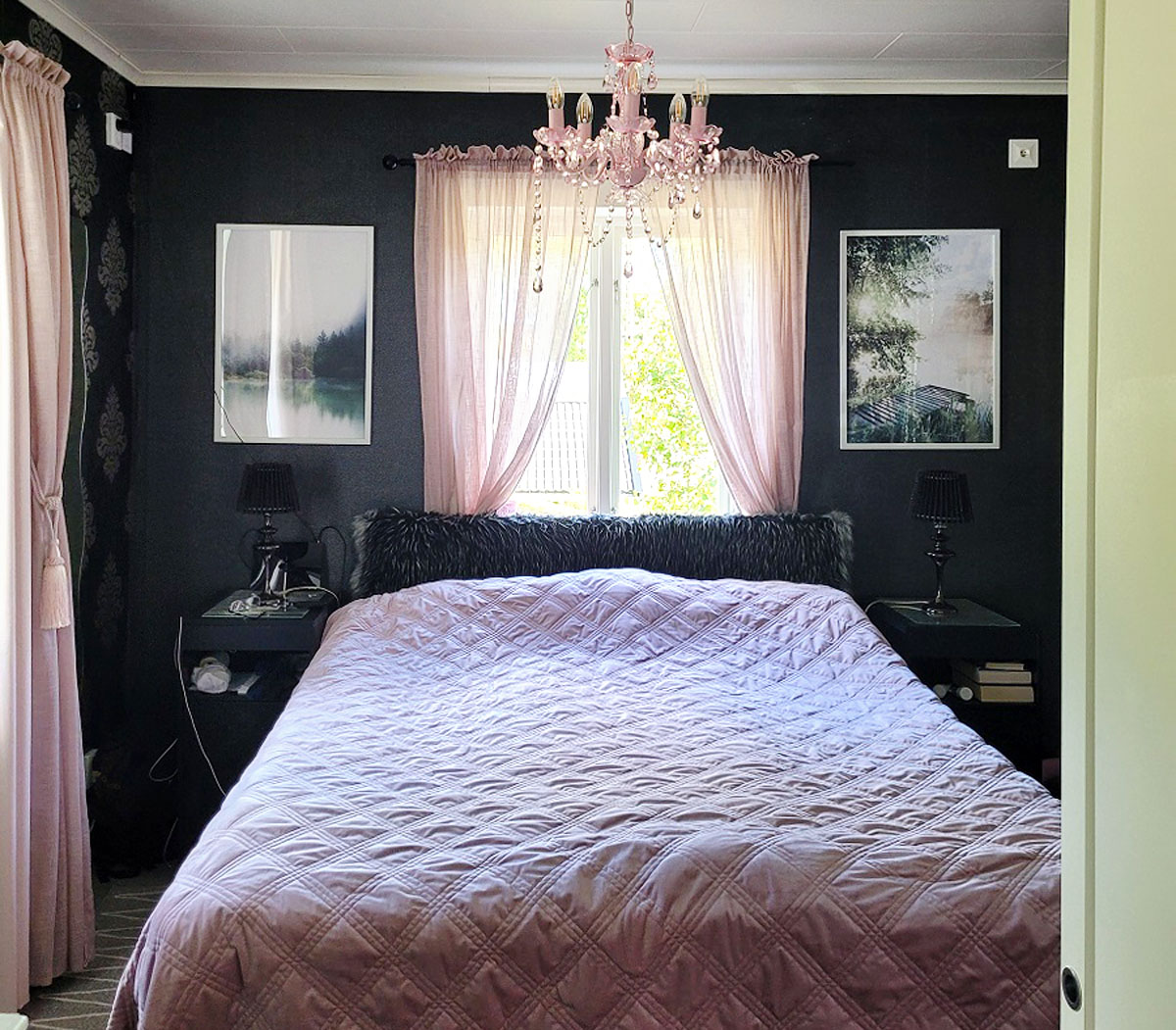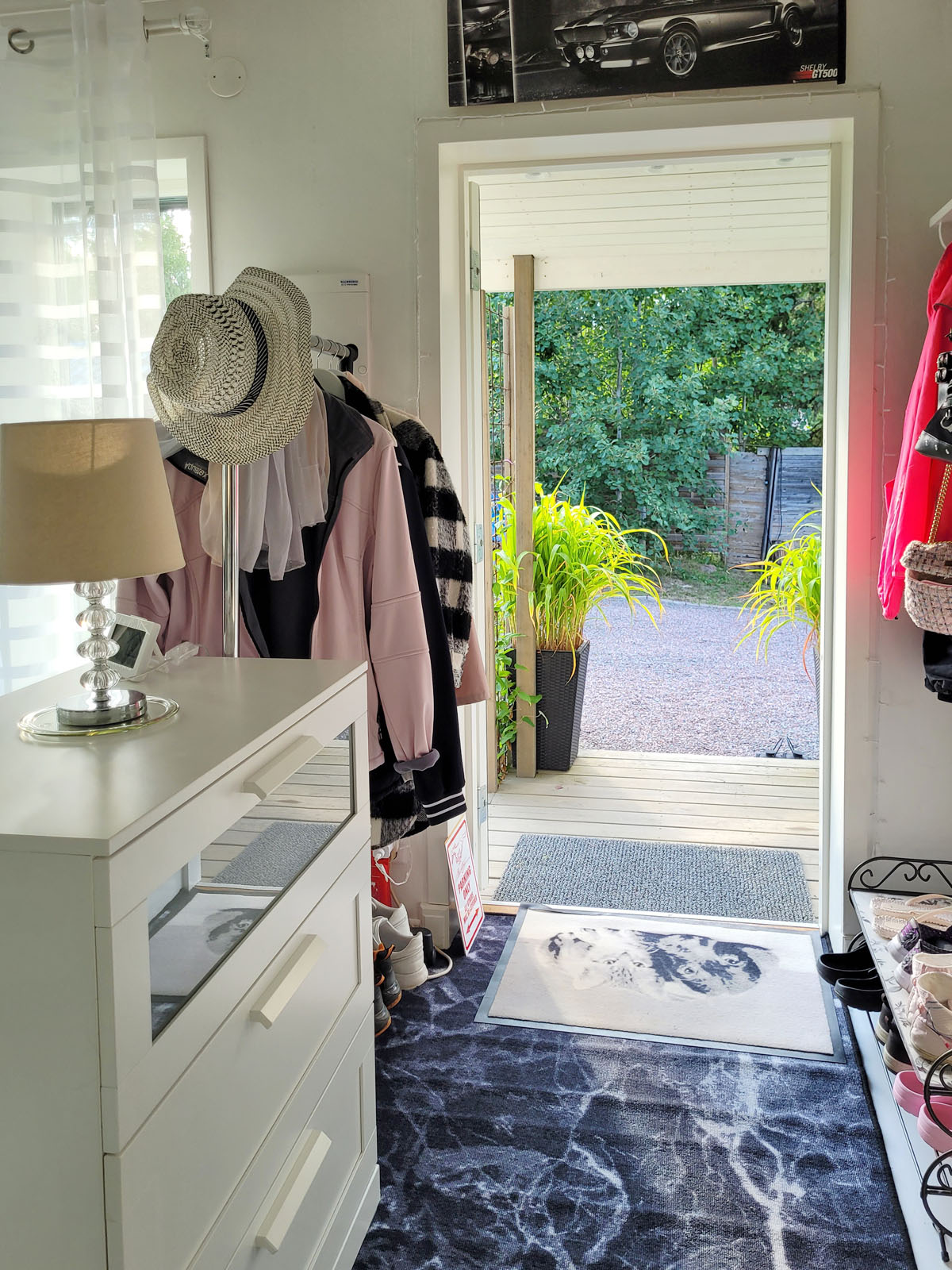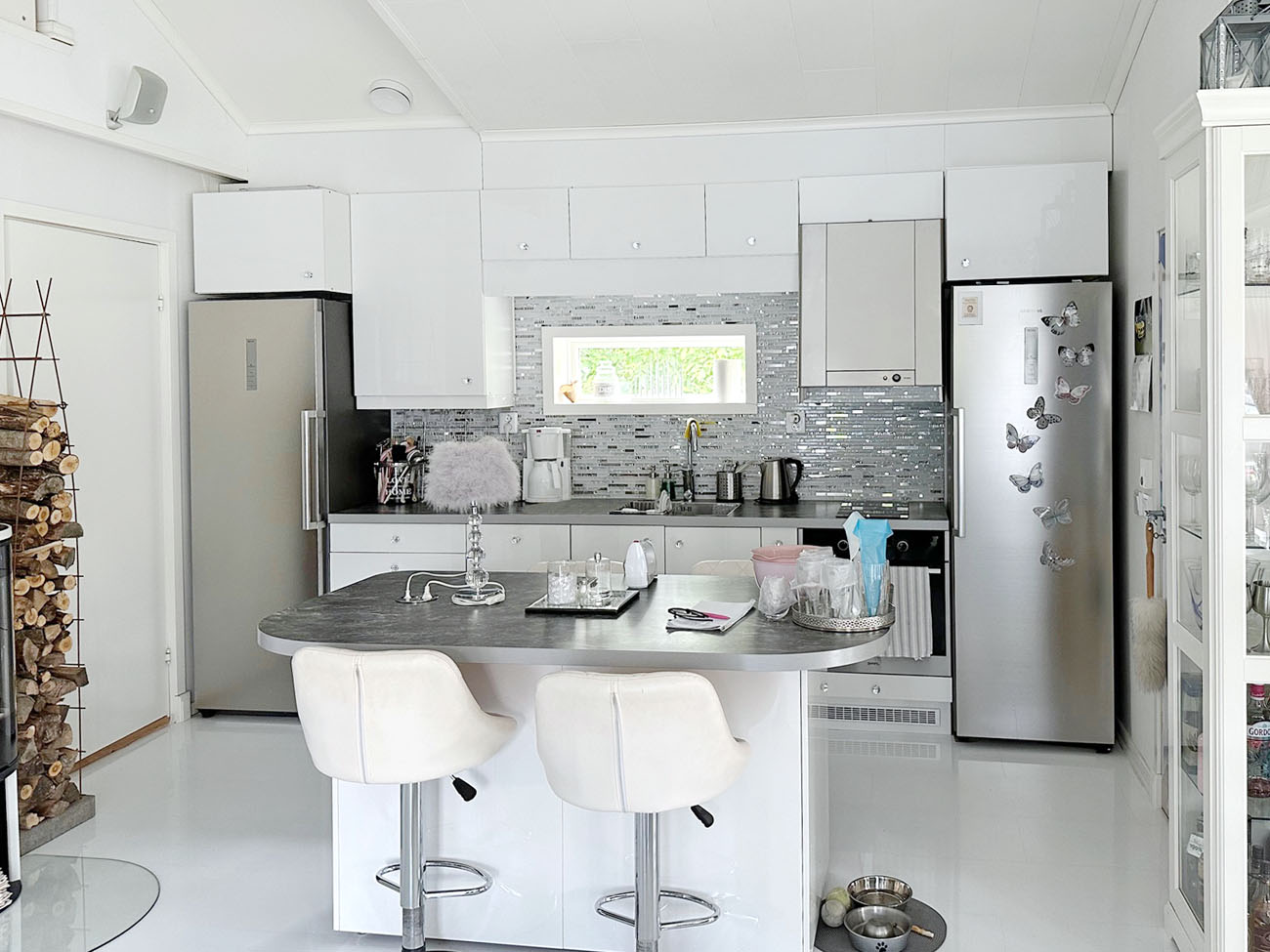 Modernt KÖK med köksö mot vardagsrummet. Utrustning med spis, ugn, fläkt, diskmaskin, kyl, frys. VARDAGSRUM/ALLRUM med braskamin och stege till sovloft, stora fönsterpartier mot altanen och trädgården. SOVLOFT som nås med stege. Litet fönster i gaveln och ca 1.50m under taknock. SOVRUM med utsikt mot trädgården, badrum en-suite. BADRUM med förbränningtoalett, tvättställ, dusch, varmvattenberedare och tvättmaskin. Kakel och klinker. Ingång från trädgården.