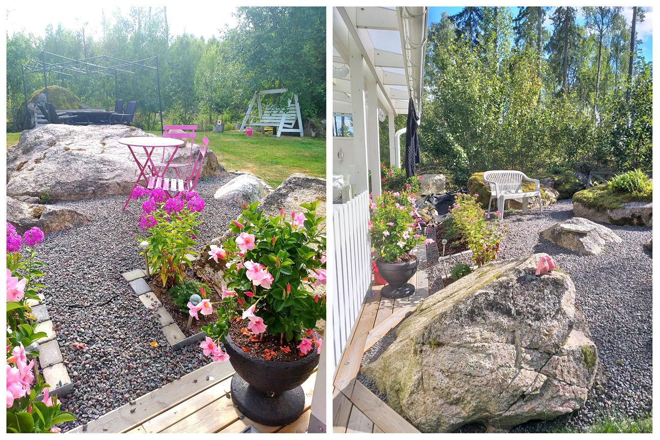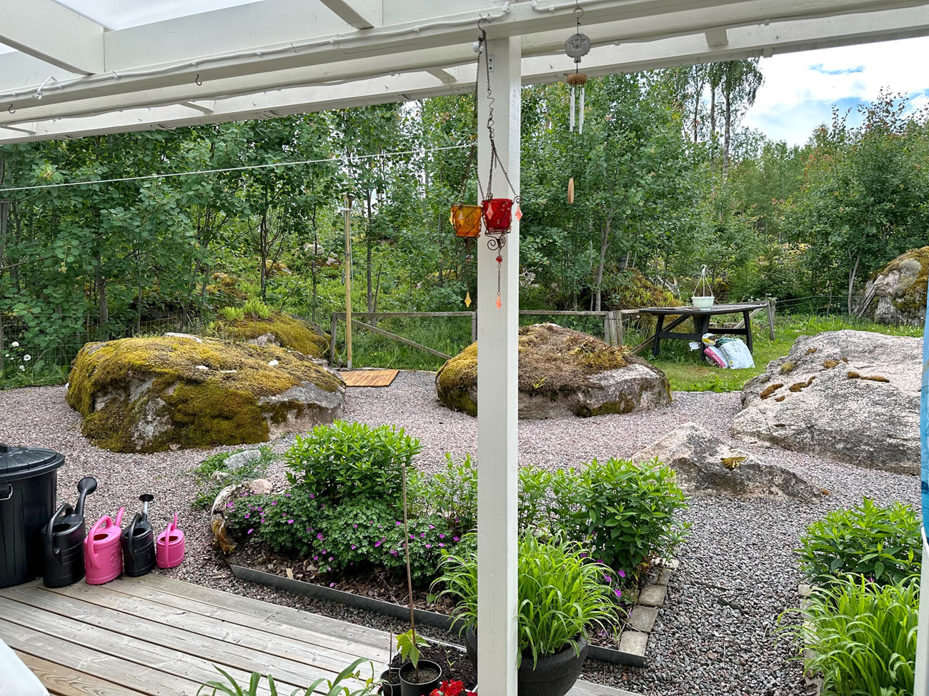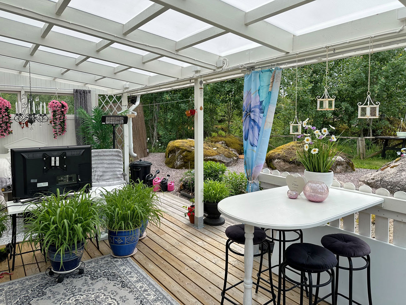 Uteplats med tak i söderläge och i direkt anslutning till trädgården.