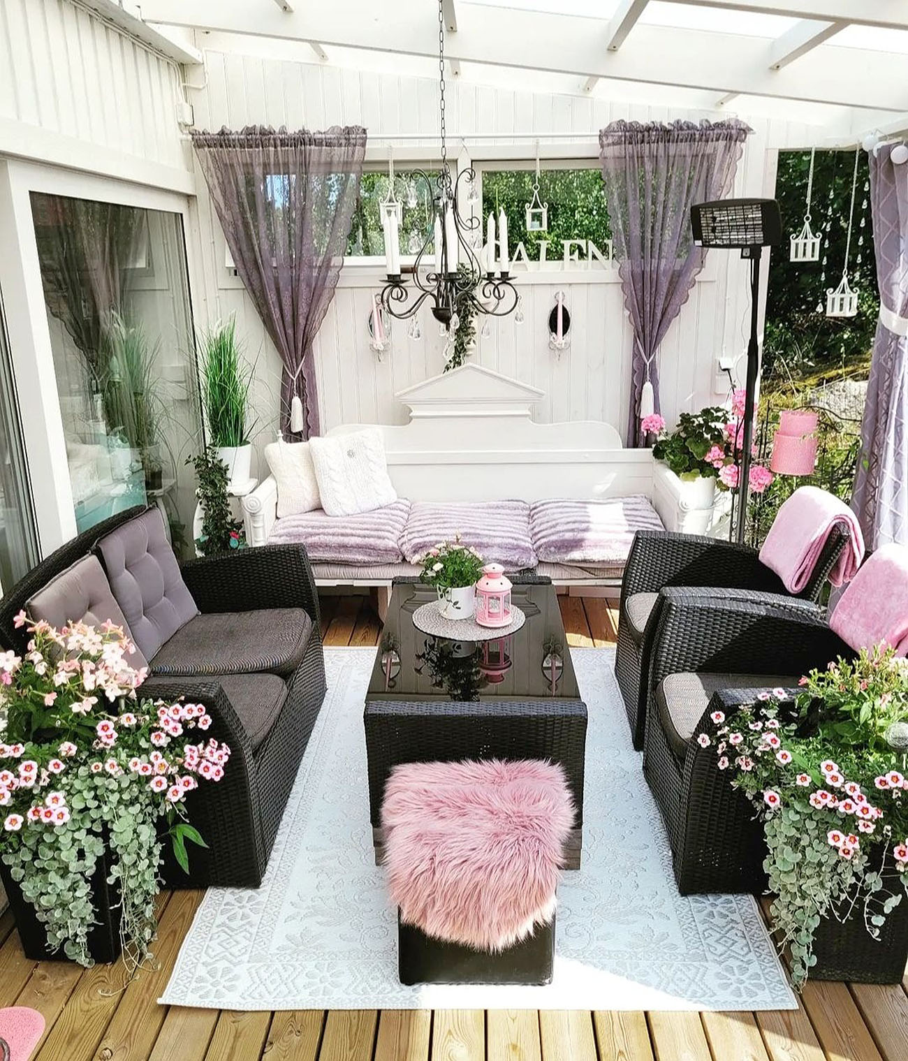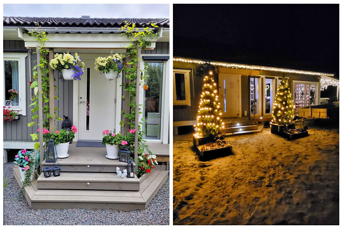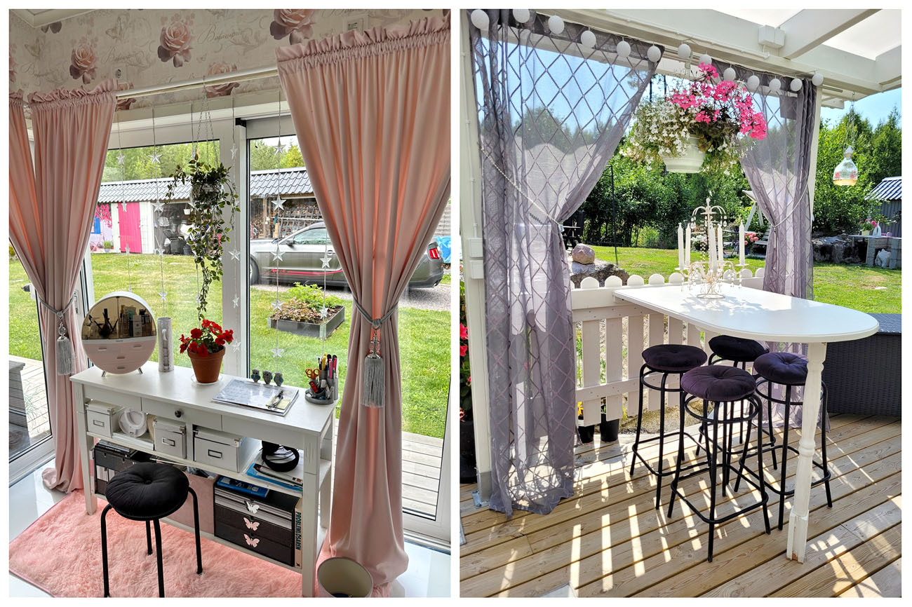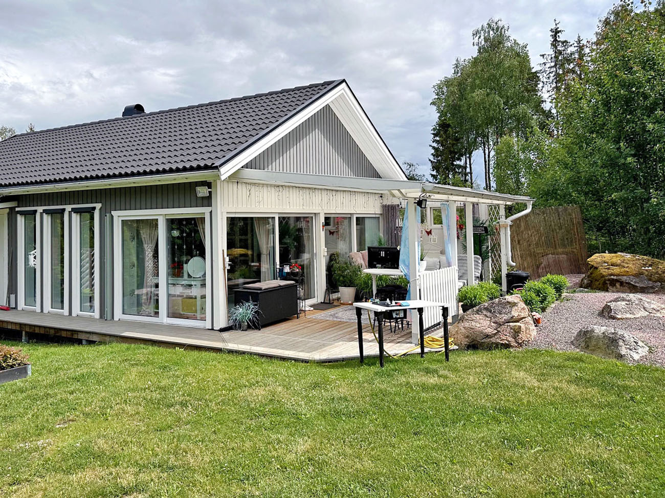Uteplats med tak i söderläge och i direkt anslutning till trädgården.