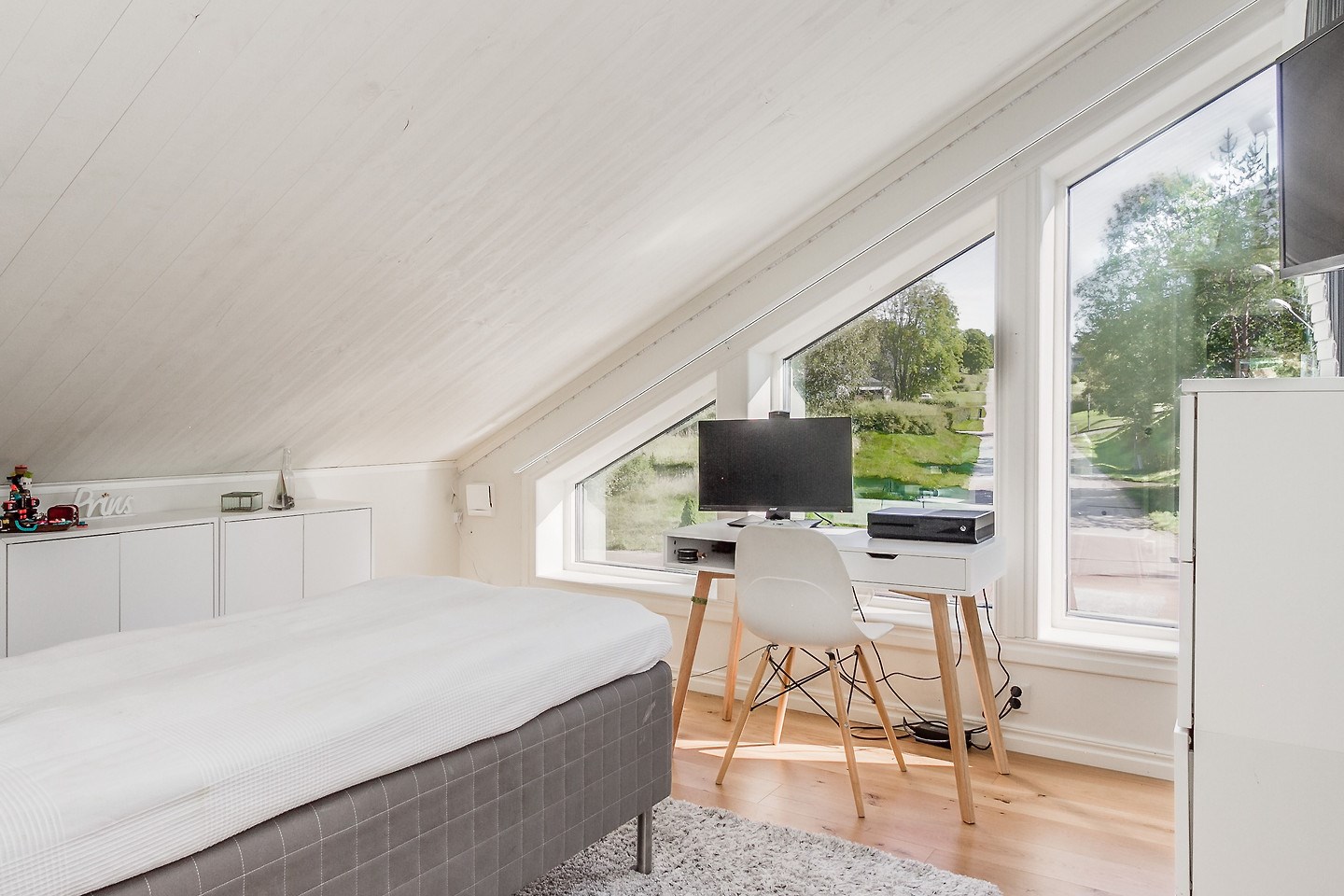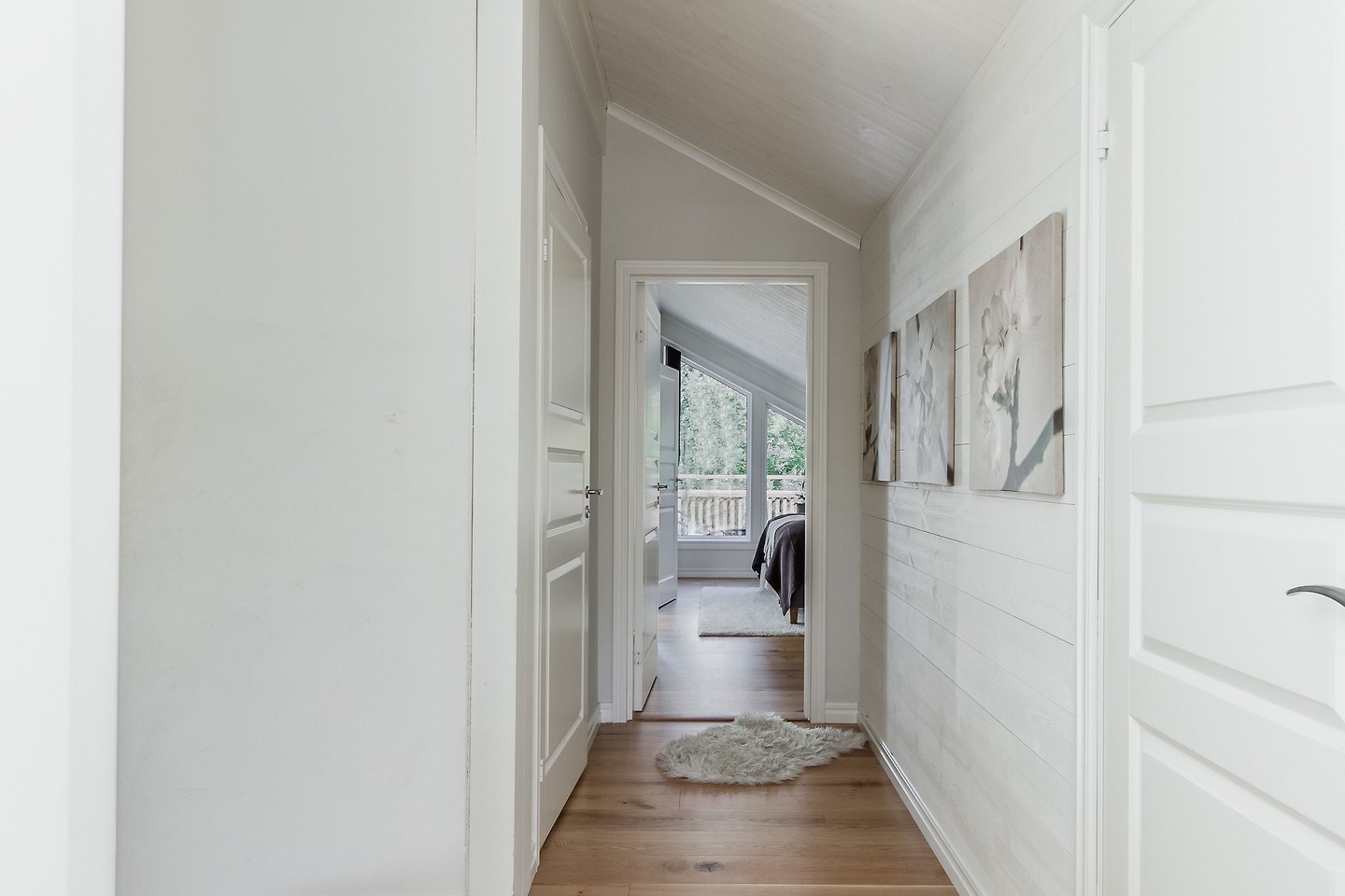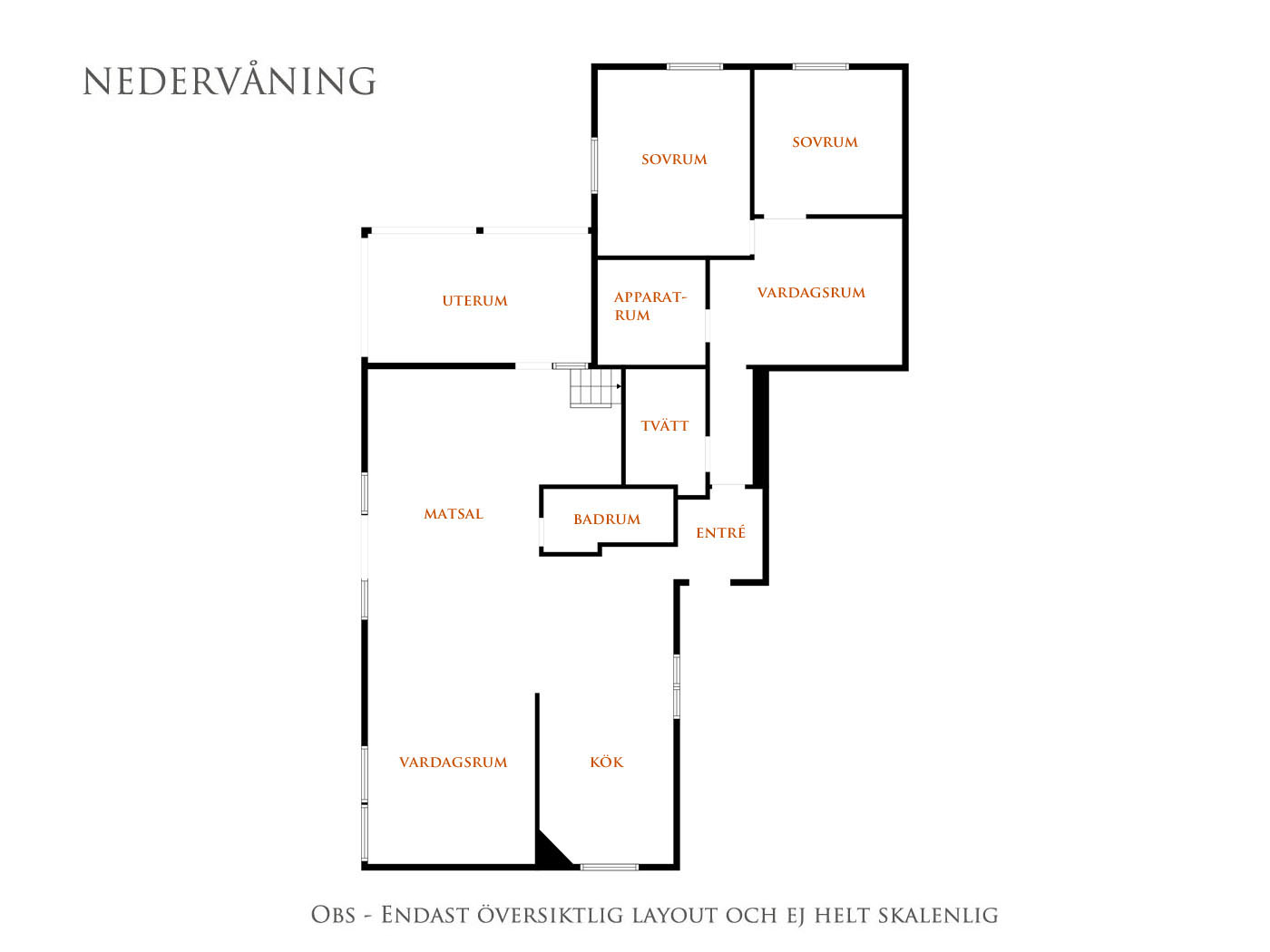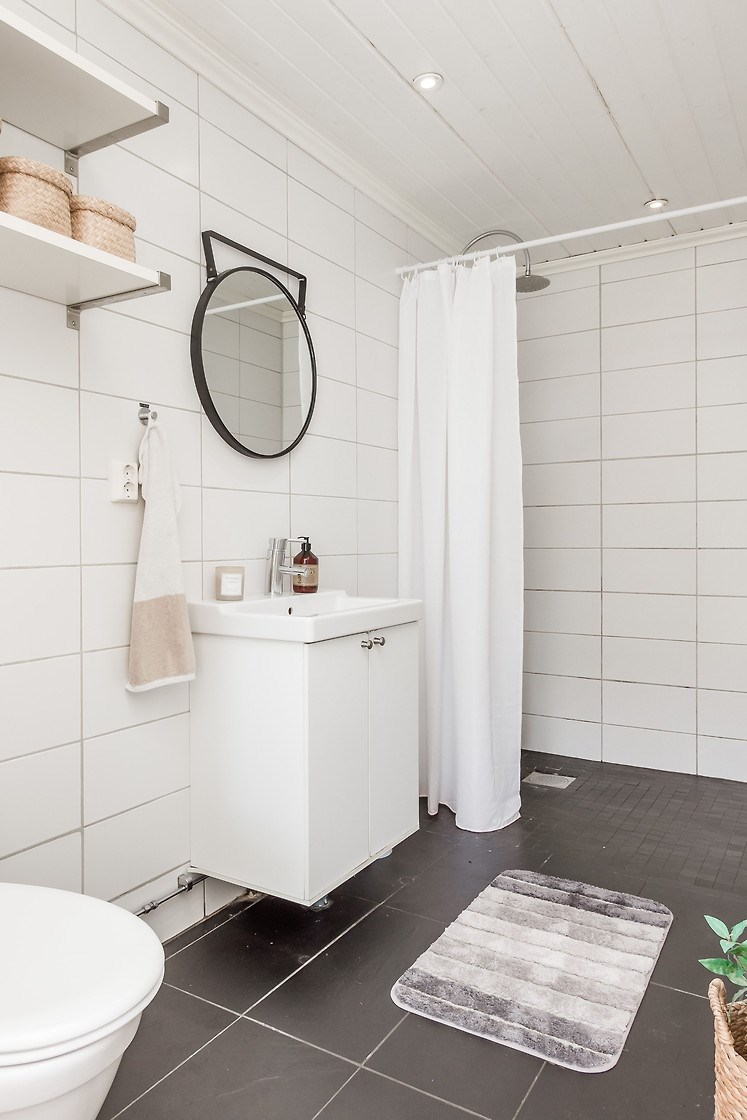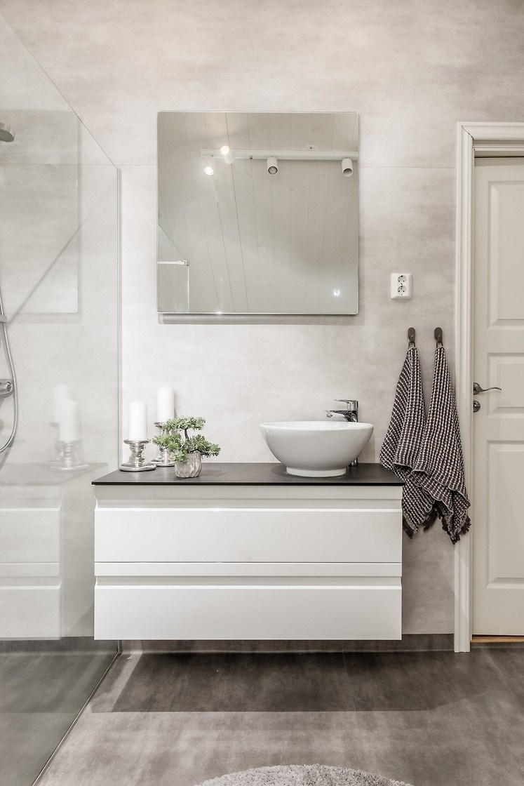 Entréplan: Man kommer in i den ljusa bostaden via HALL med klinkergolv och plats för ytterkläder. KÖKET är renoverat med köksö och utrustning i form av spis/induktionshäll, ugn, spisfläkt med rostfri kåpa, högskåp kyl och frys, integrerad diskmaskin, micro. Samtliga maskiner och apparater från Bosch. Kaklad vit vägg över spishäll och intill spiskåpa. Utsikt via två köksfönster mot ingång och uppfart. Det stora ALLRUMMET har öppen planlösning och generösa ytor. Utgång till både inglasat och inrett UTERUM som ALTAN- och SOLDÄCK. I anslutning till det stora ALLRUMMET med separat TV-hörna och sittgrupp finns tillgång till en TOALETT med duschutrymme, golvvärme samt klinkergolv och kaklade väggar i vitt. De flera uteplatserna gör att nedre planet upplevs både stort och välkomnande att kunna nyttja alla årstider. Från hallen når man TVÄTTSTUGAN med klinkergolv, tvättmaskin och torktumlare samt praktiska avlastningsytor och diskho. Intill ligger ett APPARATRUM med klinkergolv, bergvärmepump och elcentral med automatsäkringar samt jordfelsbrytare. Nedre planet har även tre separata RUM varav två med utsikt mot skog -och grönområde. De tre rummen kan användas på olika sätt beroende utifrån behov och önskemål såsom: kontor, lekrum, gästrum, sovrum, hobbyrum, ateljé m.m. Ovanvåning: TRAPPA via allrummet leder upp till det övre våningsplanet som omfattar 4 inredda RUM varav det ena är ett större ”Master-bedroom” med utgång till BALKONG. Två av rummen har stora fönster med utmärkt utsikt över egen infart. De två andra rummen har utsikt över egen tomt samt mot skogs- och grönområde. På det övre planet finns även ett BADRUM med toalett, tvättställ och duschhörna. Klinkergolv med vattenburen golvvärme och infällda spotlights. En rymlig och inredd KLÄDKAMMARE finns även på övre planet i direkt anslutning trapphus. Merparten av befintliga utrymmen övre plan har snedtak. Målad råspont och/eller vit målade väggar och tak. Laminatgolv och vattenburen golvvärme.