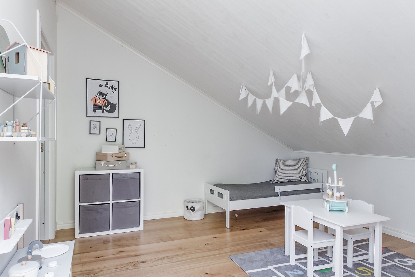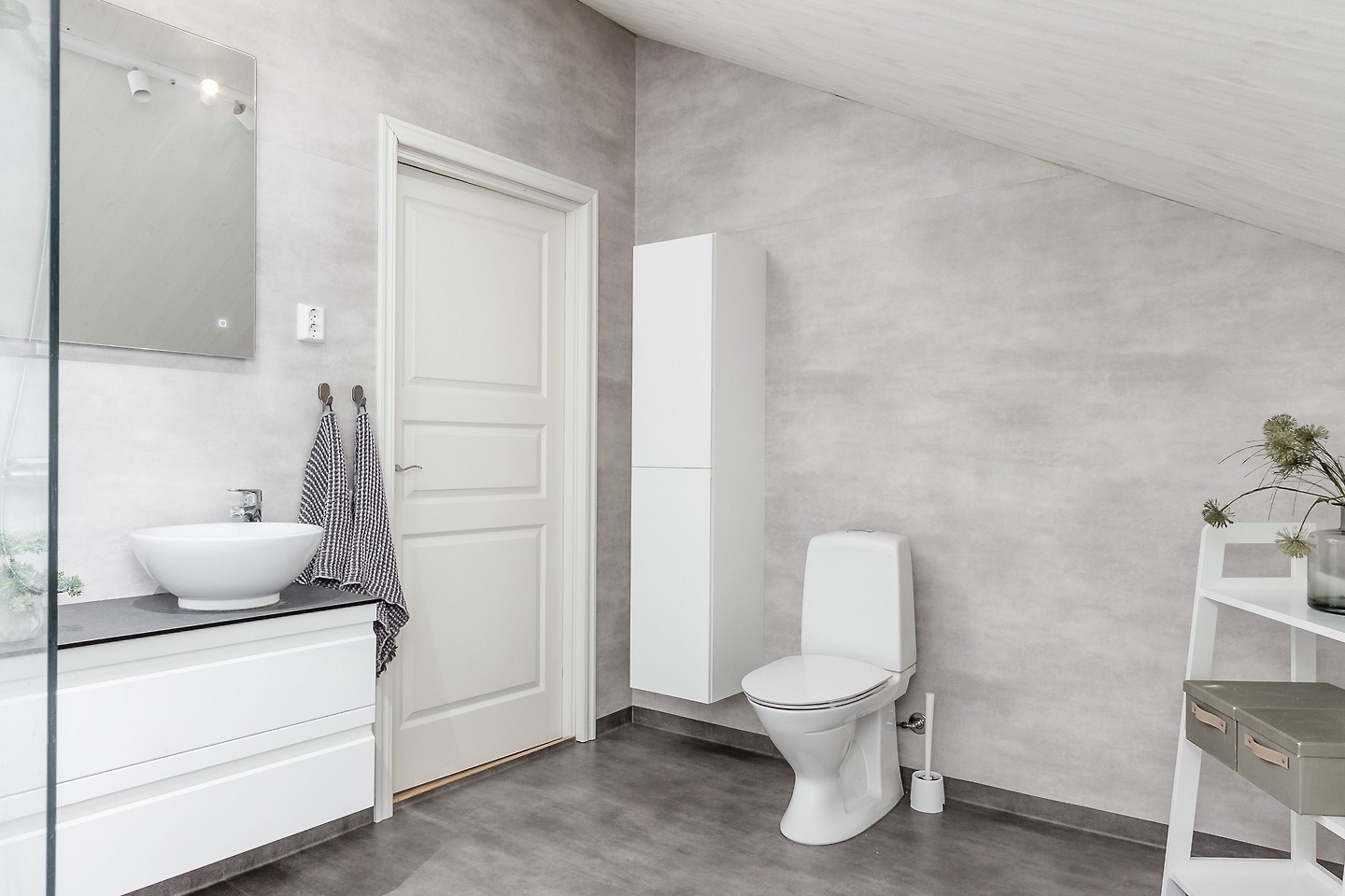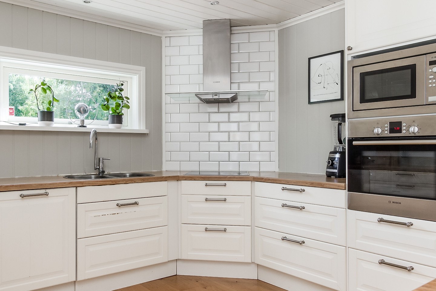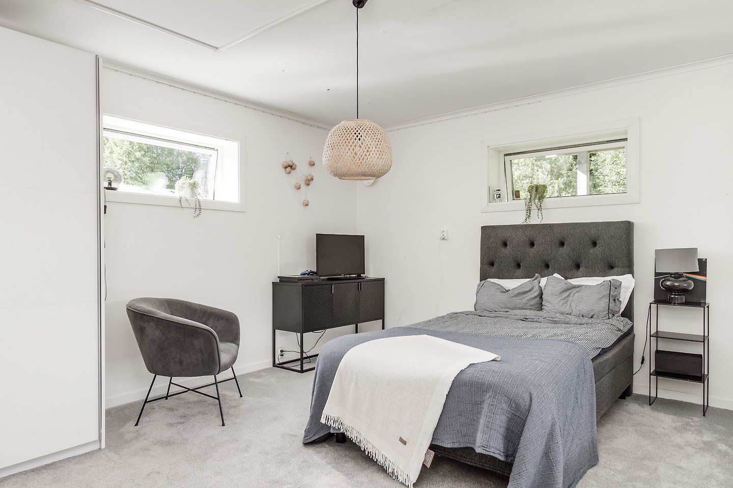 Entréplan: Man kommer in i den ljusa bostaden via HALL med klinkergolv och plats för ytterkläder. KÖKET är renoverat med köksö och utrustning i form av spis/induktionshäll, ugn, spisfläkt med rostfri kåpa, högskåp kyl och frys, integrerad diskmaskin, micro. Samtliga maskiner och apparater från Bosch. Kaklad vit vägg över spishäll och intill spiskåpa. Utsikt via två köksfönster mot ingång och uppfart. Det stora ALLRUMMET har öppen planlösning och generösa ytor. Utgång till både inglasat och inrett UTERUM som ALTAN- och SOLDÄCK. I anslutning till det stora ALLRUMMET med separat TV-hörna och sittgrupp finns tillgång till en TOALETT med duschutrymme, golvvärme samt klinkergolv och kaklade väggar i vitt. De flera uteplatserna gör att nedre planet upplevs både stort och välkomnande att kunna nyttja alla årstider. Från hallen når man TVÄTTSTUGAN med klinkergolv, tvättmaskin och torktumlare samt praktiska avlastningsytor och diskho. Intill ligger ett APPARATRUM med klinkergolv, bergvärmepump och elcentral med automatsäkringar samt jordfelsbrytare. Nedre planet har även tre separata RUM varav två med utsikt mot skog -och grönområde. De tre rummen kan användas på olika sätt beroende utifrån behov och önskemål såsom: kontor, lekrum, gästrum, sovrum, hobbyrum, ateljé m.m. Ovanvåning: TRAPPA via allrummet leder upp till det övre våningsplanet som omfattar 4 inredda RUM varav det ena är ett större ”Master-bedroom” med utgång till BALKONG. Två av rummen har stora fönster med utmärkt utsikt över egen infart. De två andra rummen har utsikt över egen tomt samt mot skogs- och grönområde. På det övre planet finns även ett BADRUM med toalett, tvättställ och duschhörna. Klinkergolv med vattenburen golvvärme och infällda spotlights. En rymlig och inredd KLÄDKAMMARE finns även på övre planet i direkt anslutning trapphus. Merparten av befintliga utrymmen övre plan har snedtak. Målad råspont och/eller vit målade väggar och tak. Laminatgolv och vattenburen golvvärme.